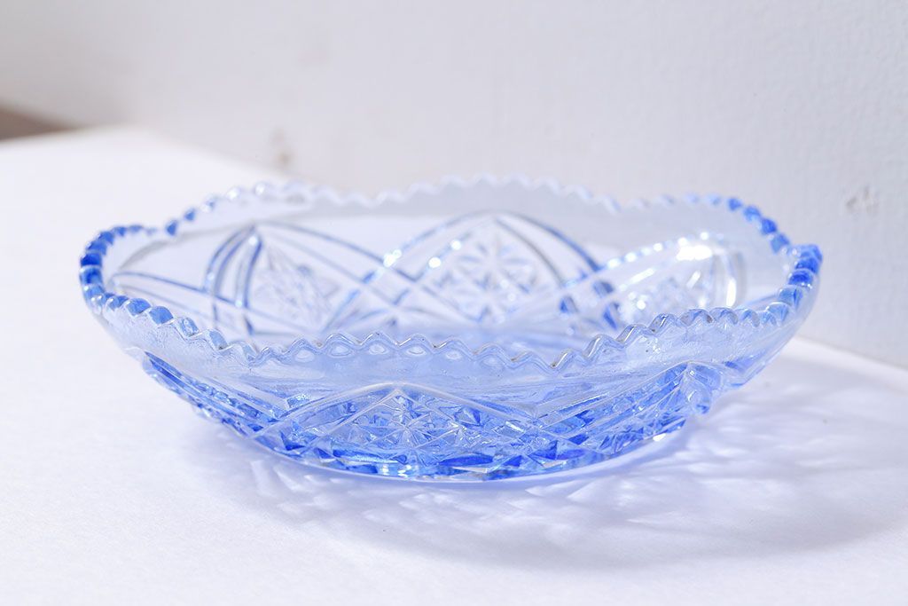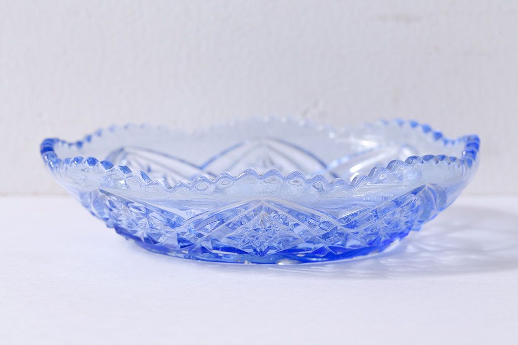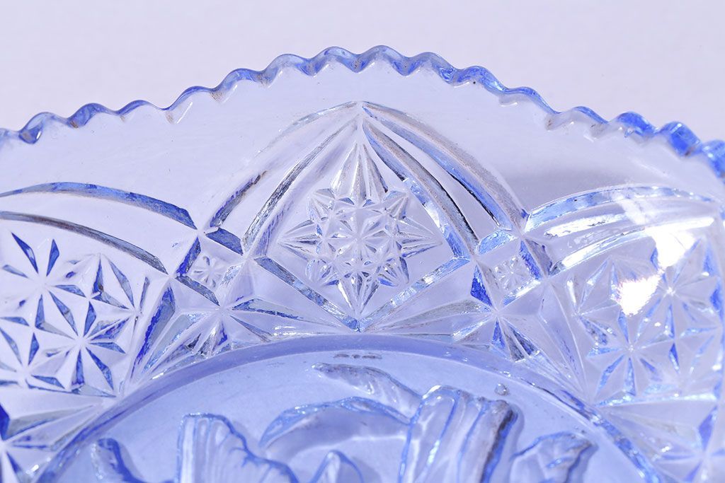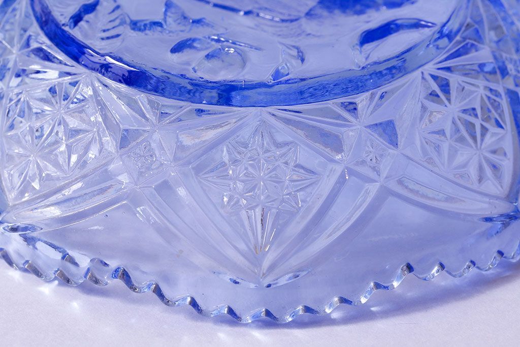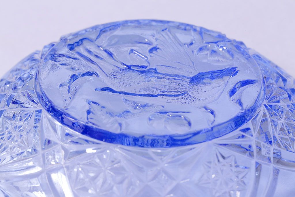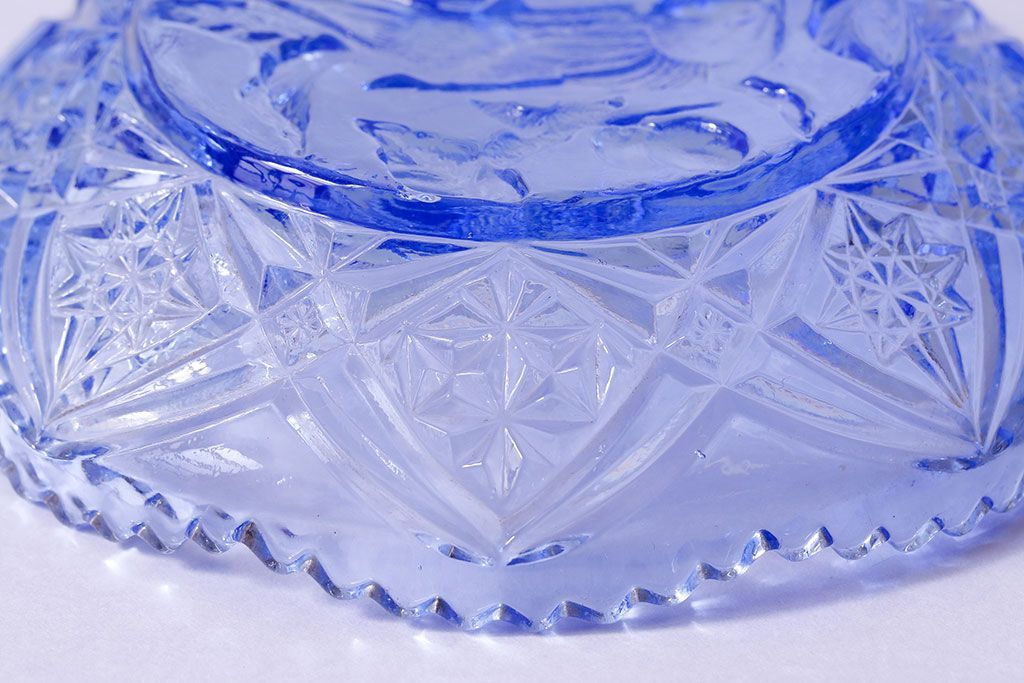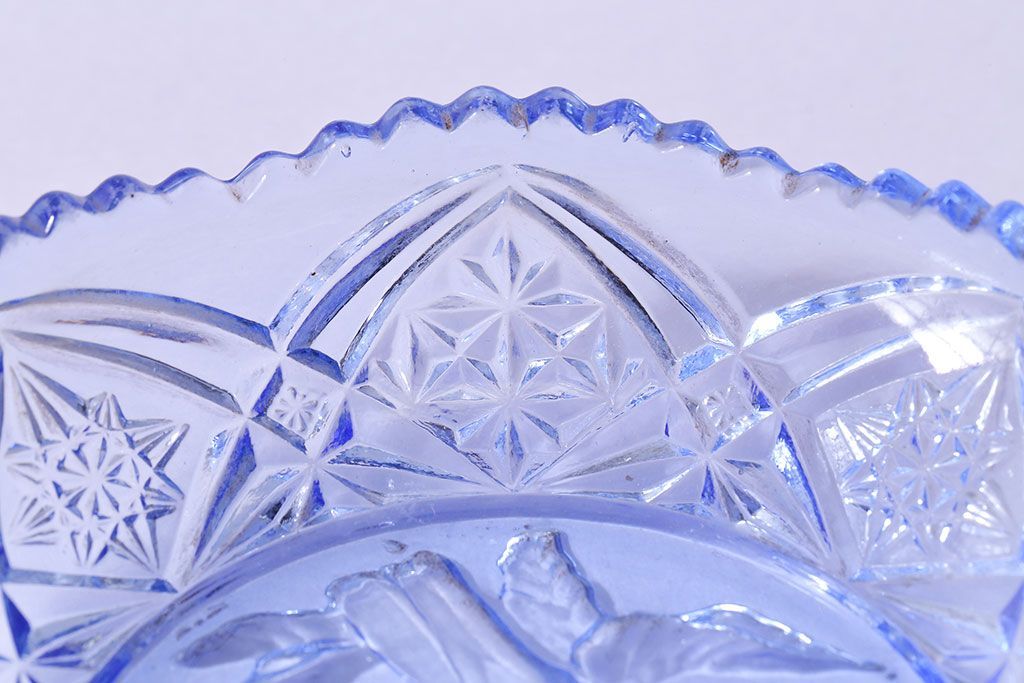 アンティーク雑貨 昭和レトロ 鳥の模様が愛らしい青いガラスの小皿(プレート、器)