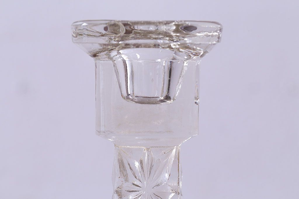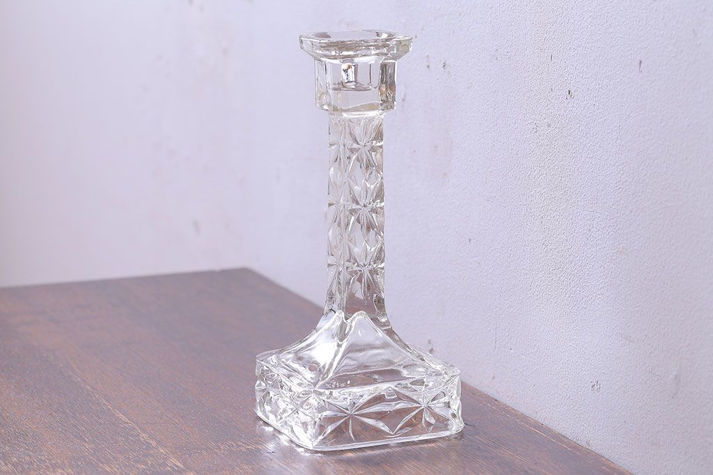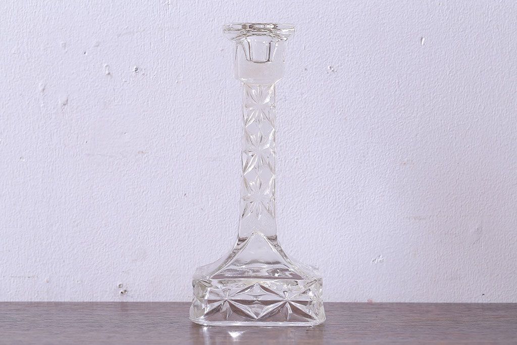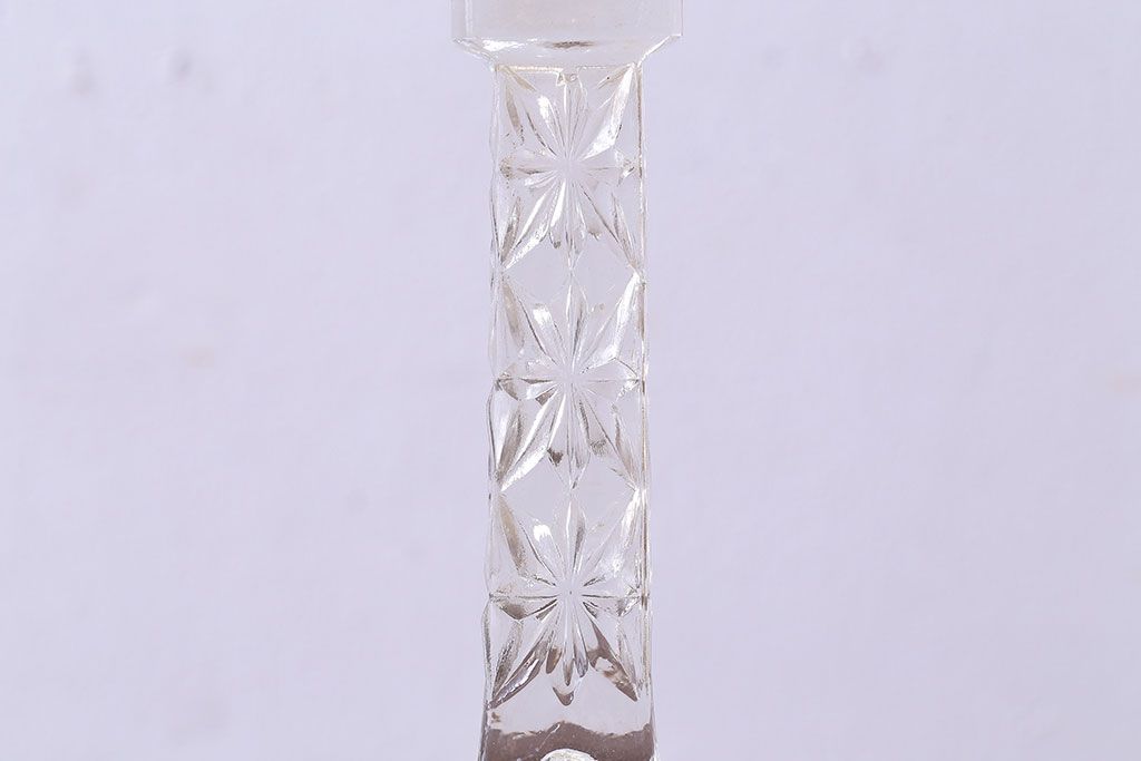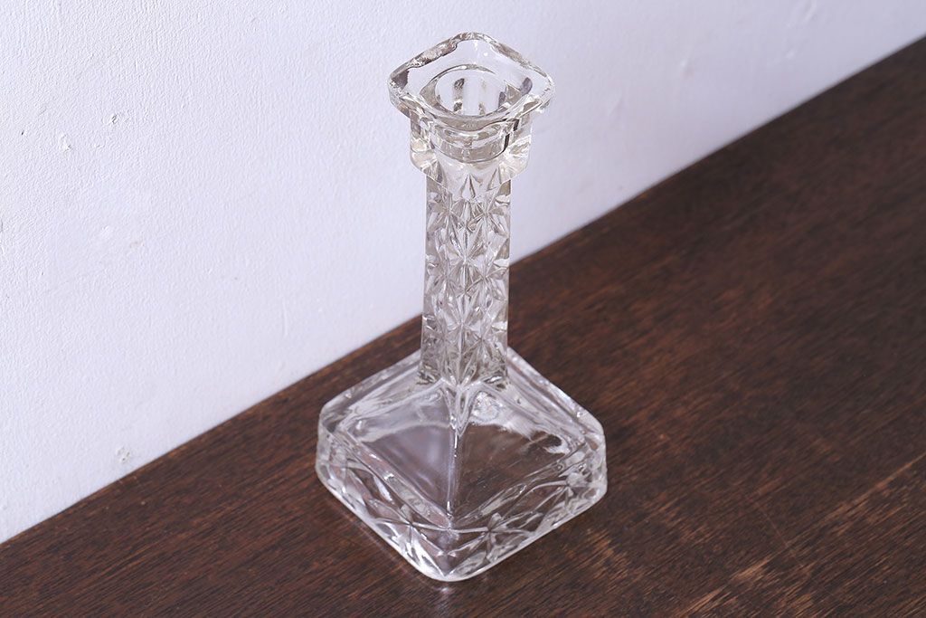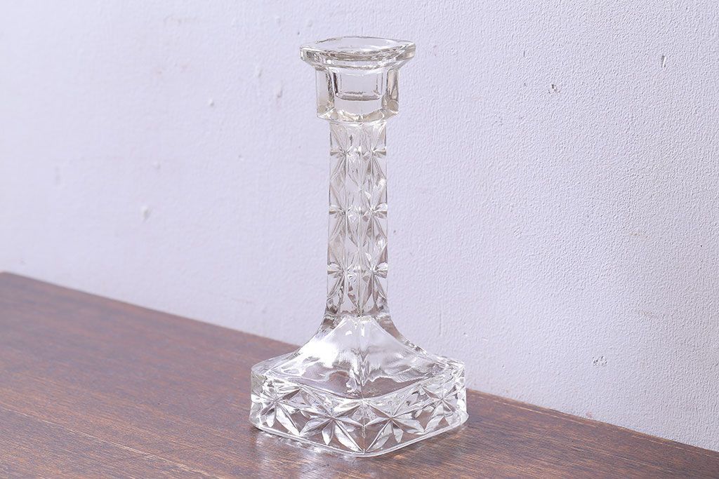 アンティーク雑貨 イギリスアンティーク 切り込みのデザインがシックなガラス製キャンドルスタンド(ろうそく立て、キャンドルホルダー)