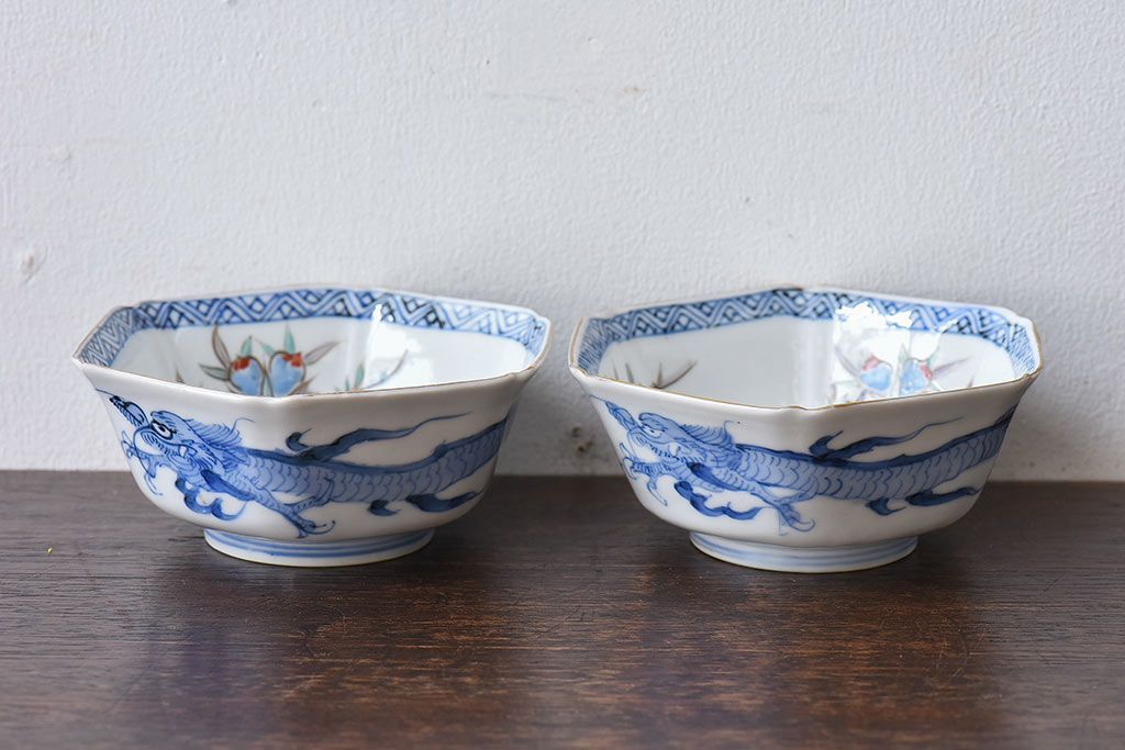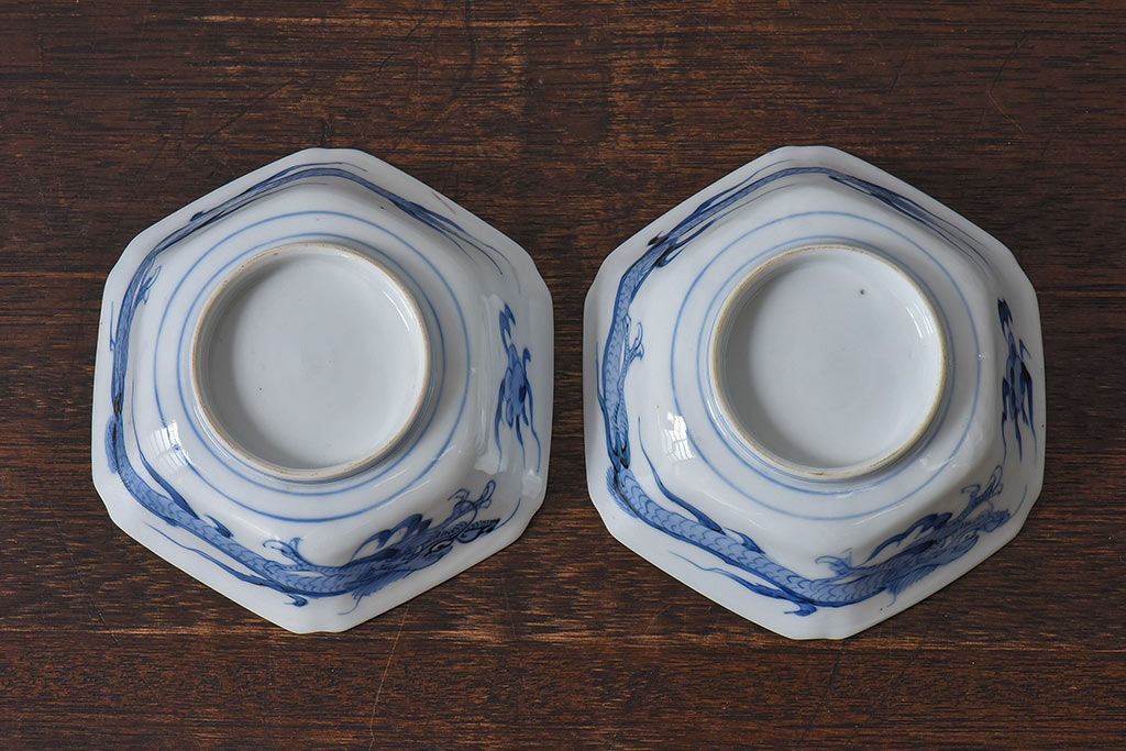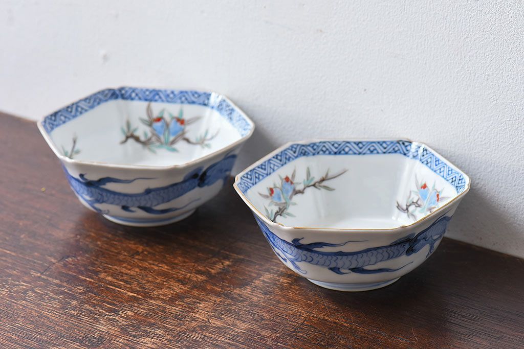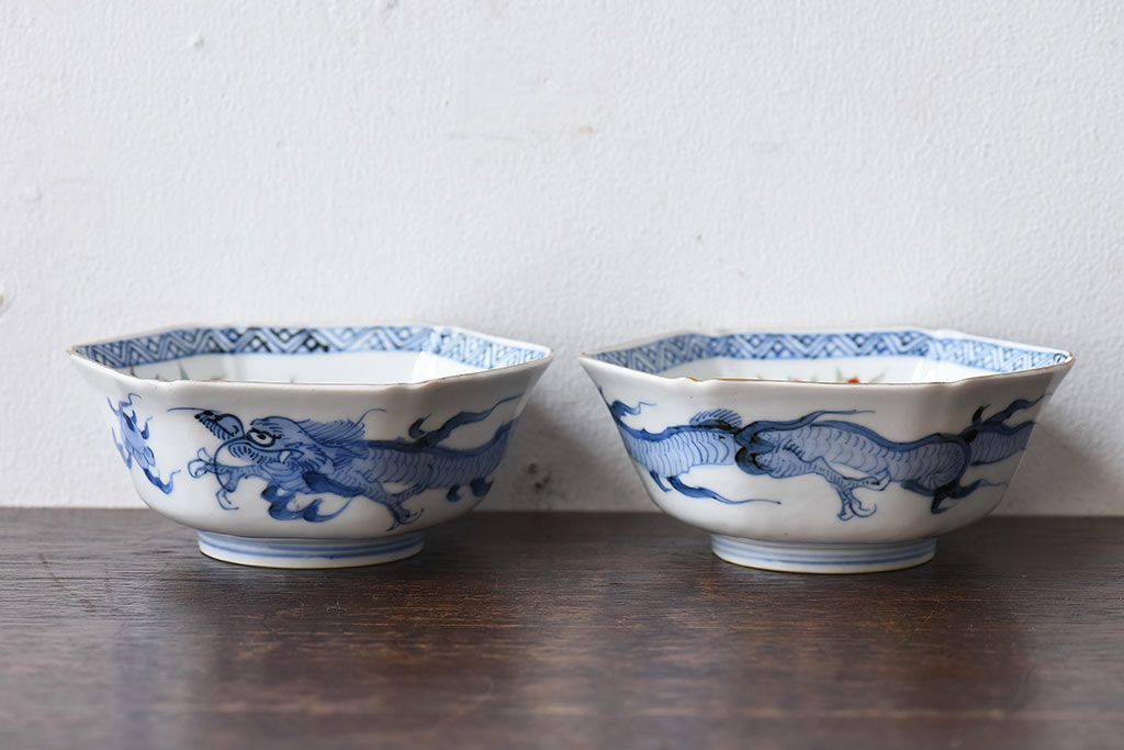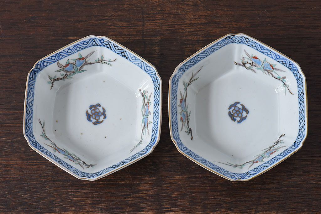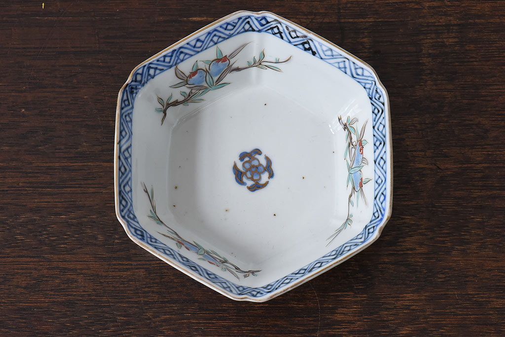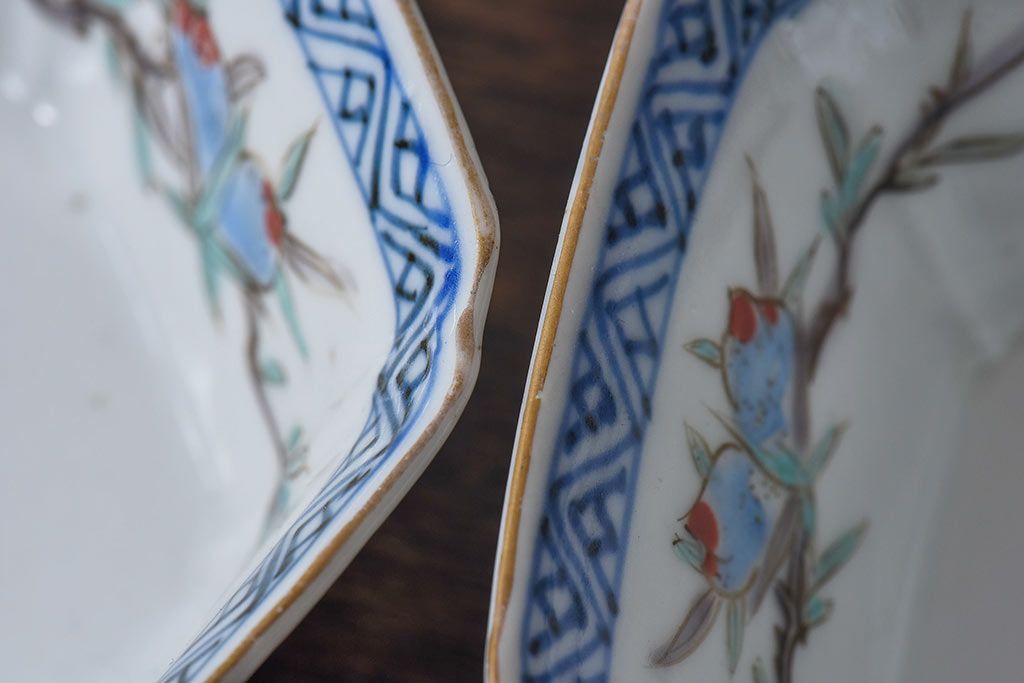 アンティーク雑貨 江戸期 古伊万里 色絵柘榴文 染付向付(和食器)2客セット(2)