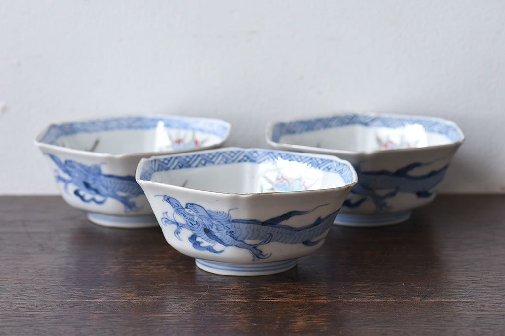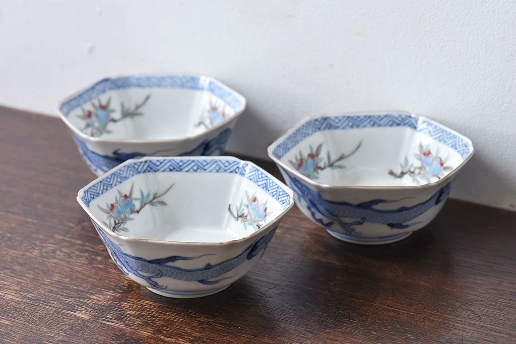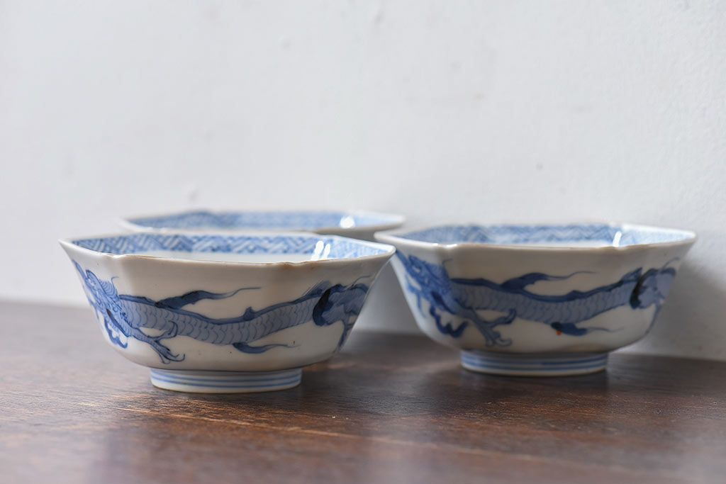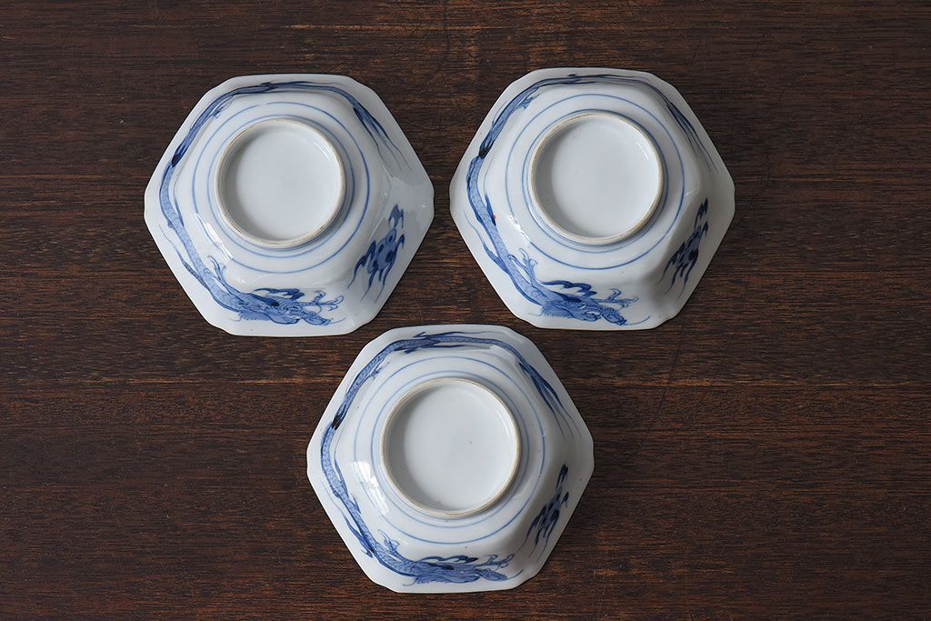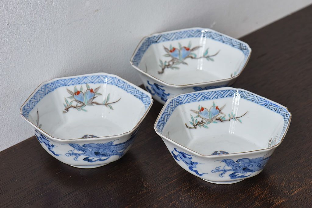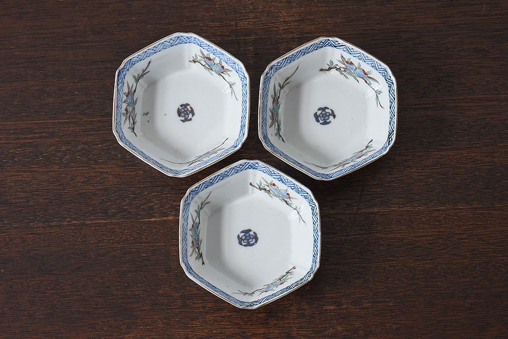 アンティーク雑貨 江戸期 古伊万里 色絵柘榴文 染付向付(和食器)3客セット