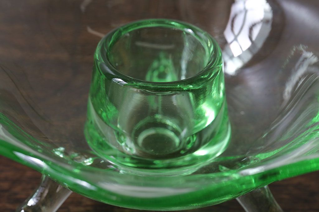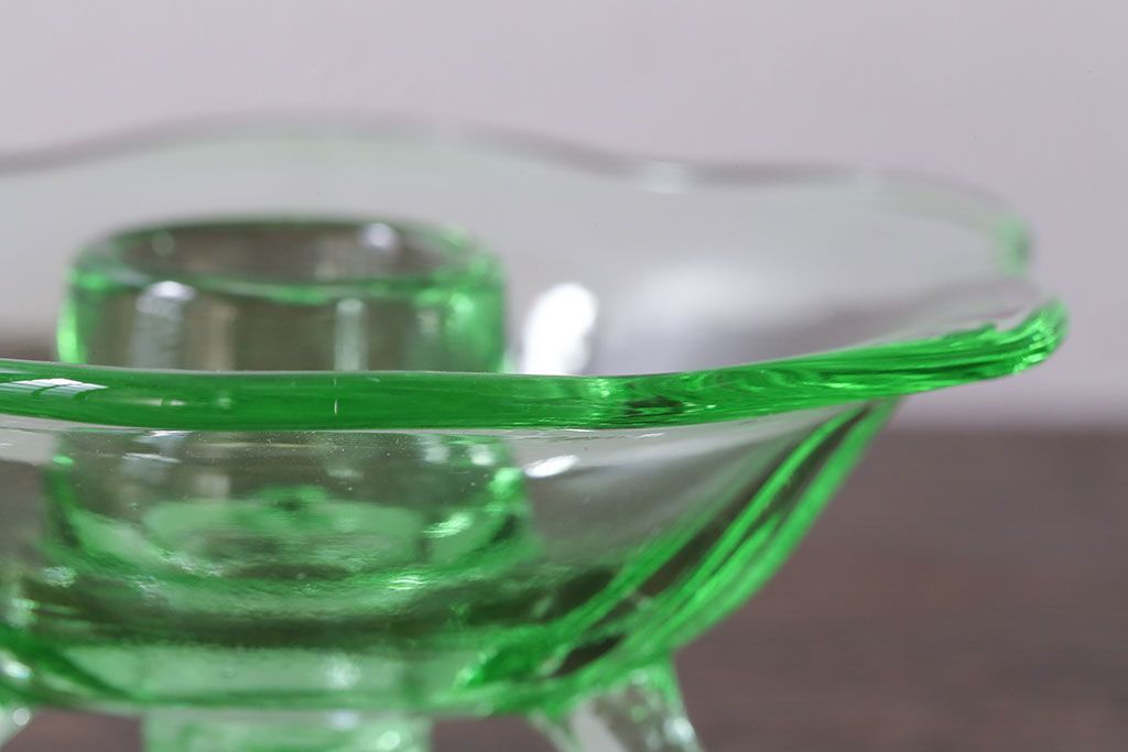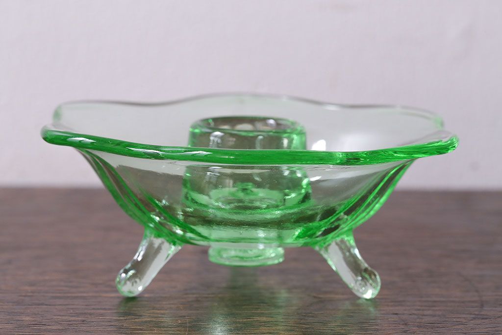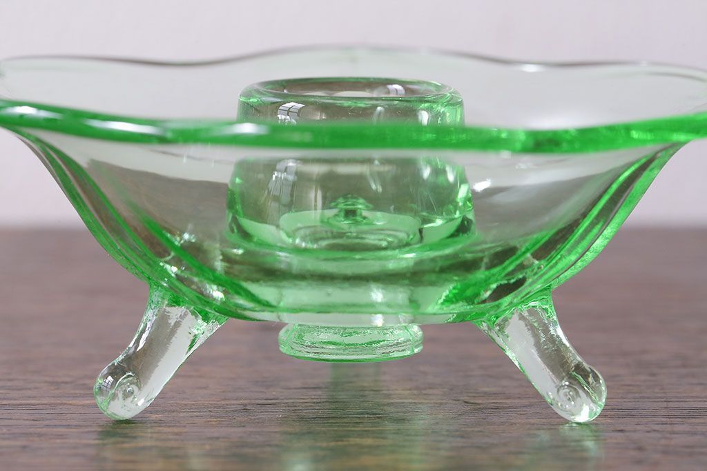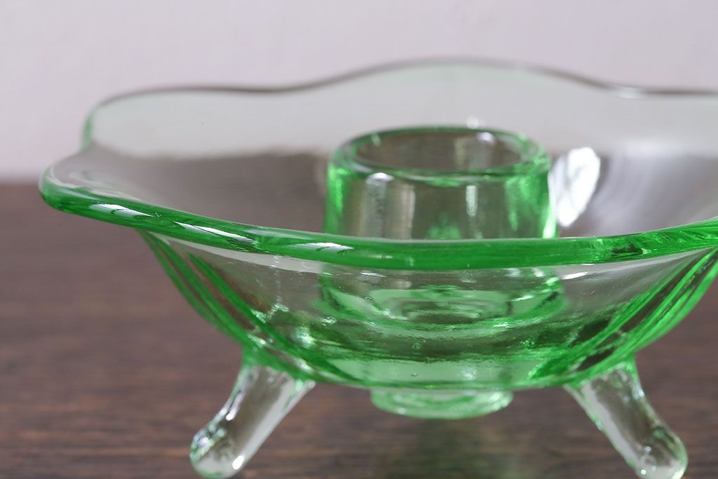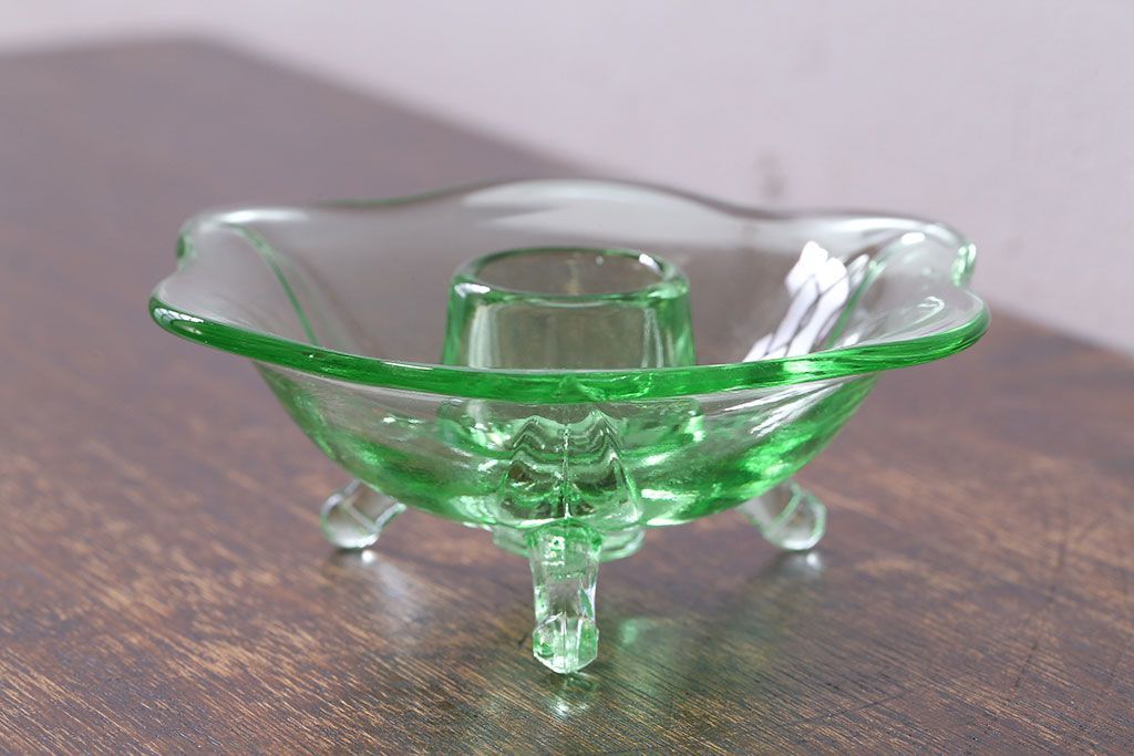 アンティーク雑貨 イギリスビンテージ ウランガラス製の小振りな三つ足キャンドルスタンド(ろうそく立て)(1)