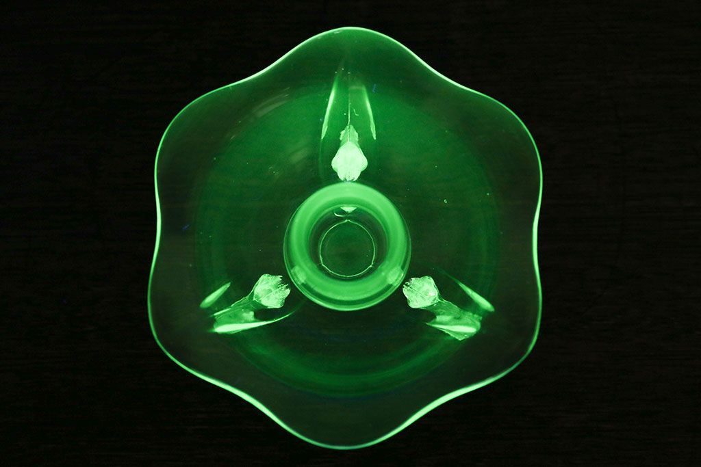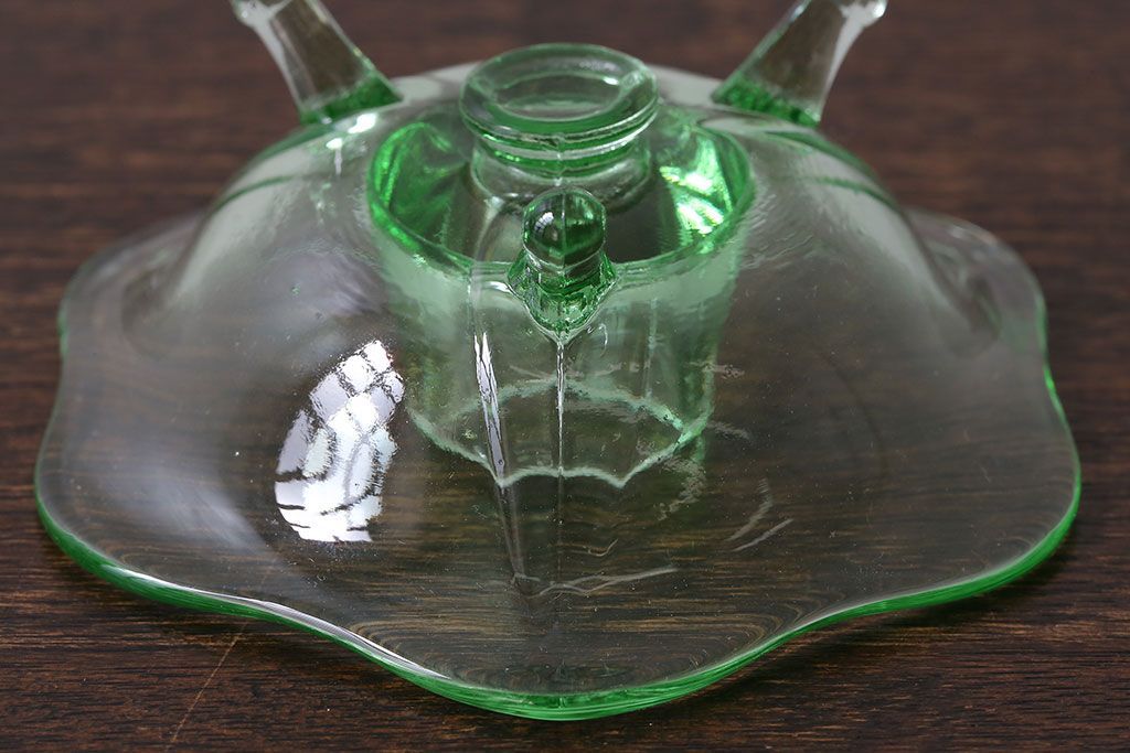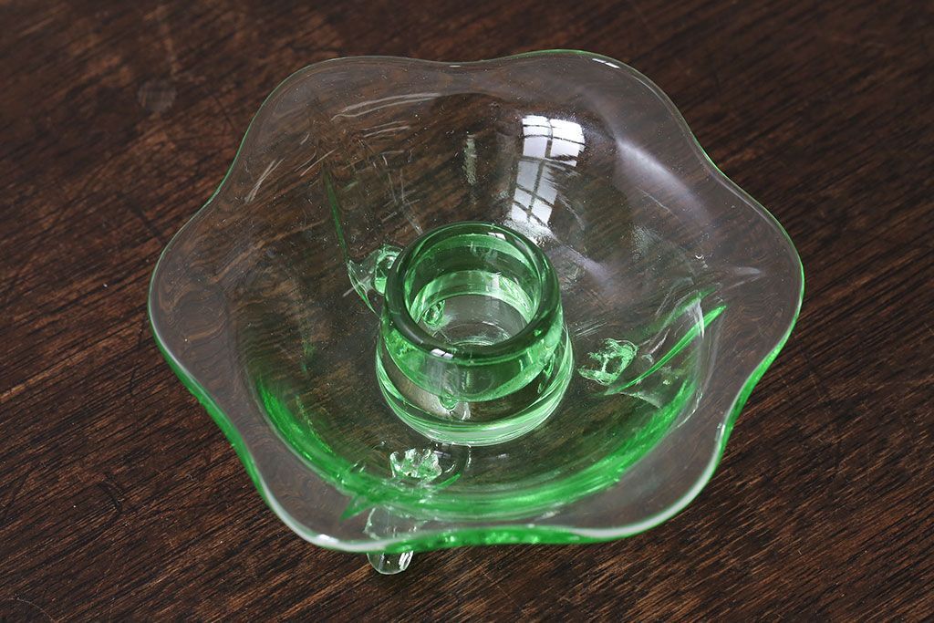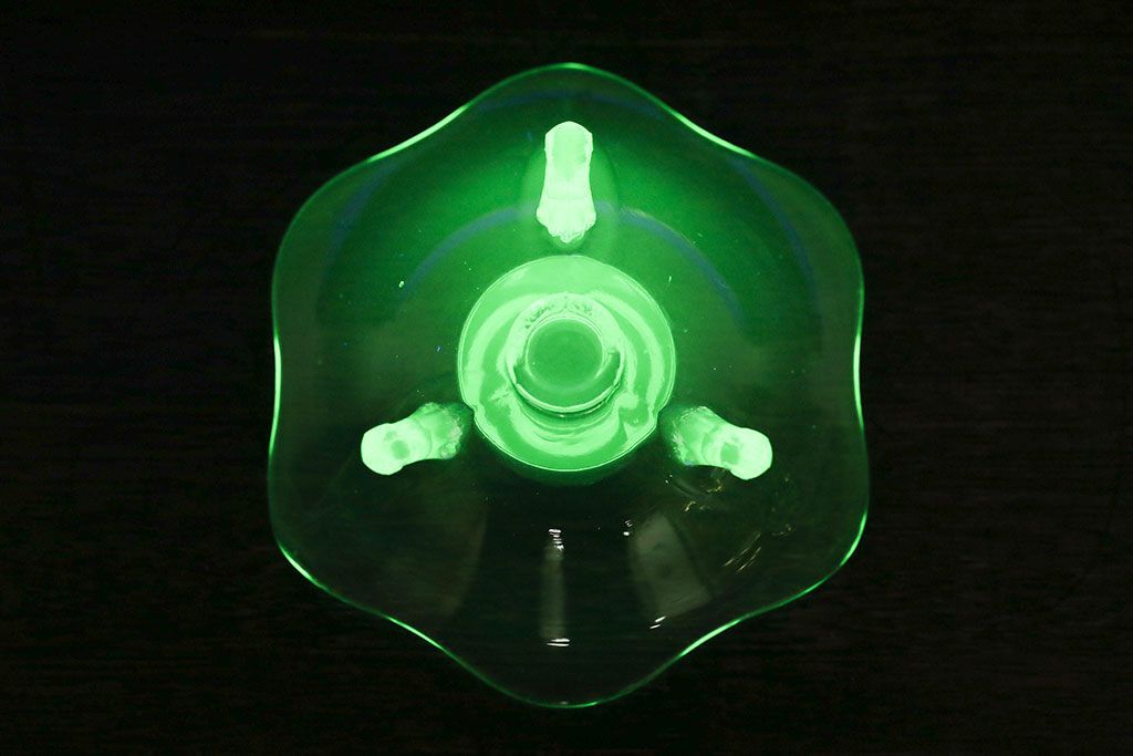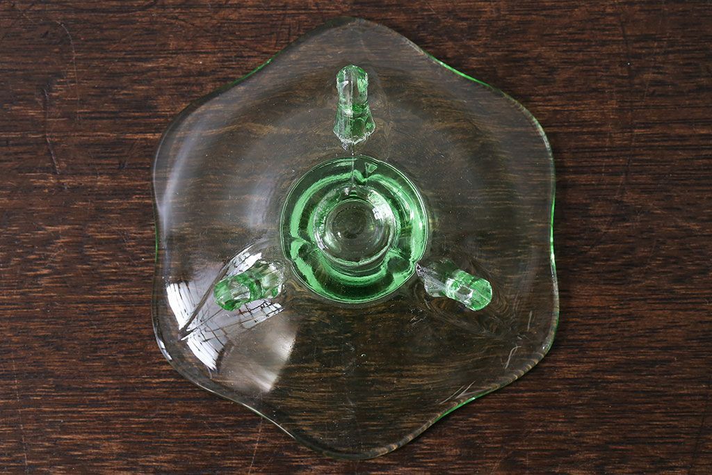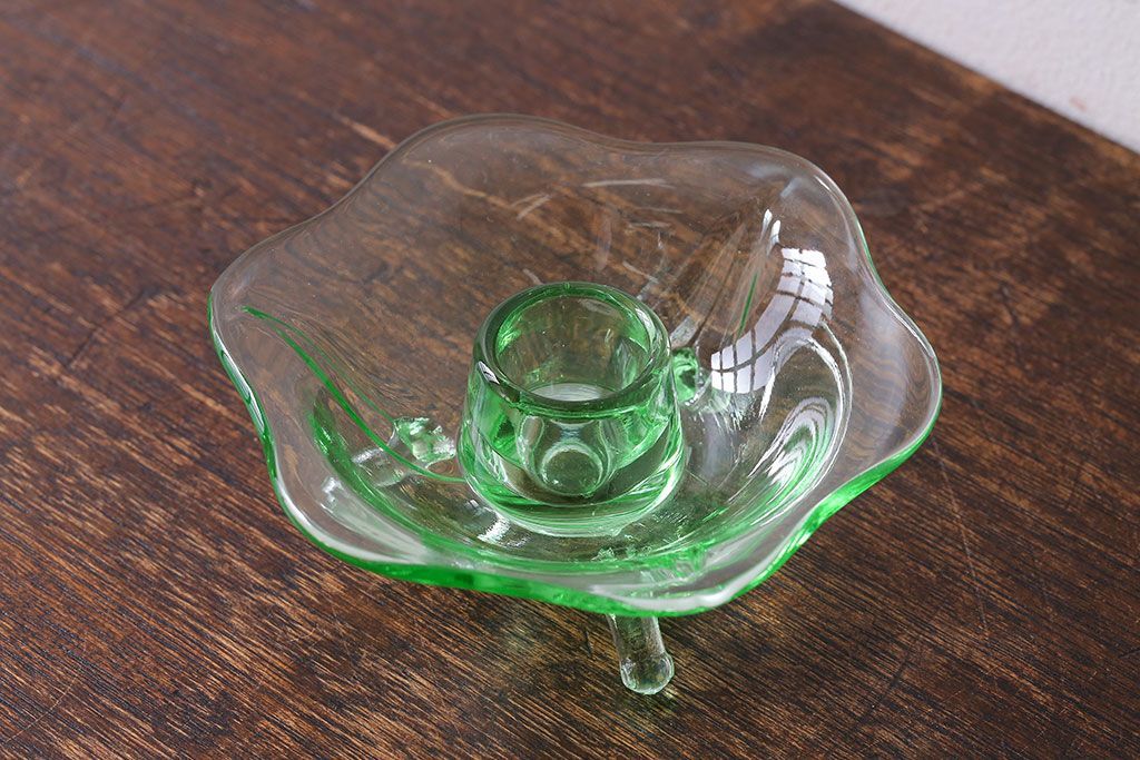 アンティーク雑貨 イギリスビンテージ ウランガラス製の小振りな三つ足キャンドルスタンド(ろうそく立て)(1)