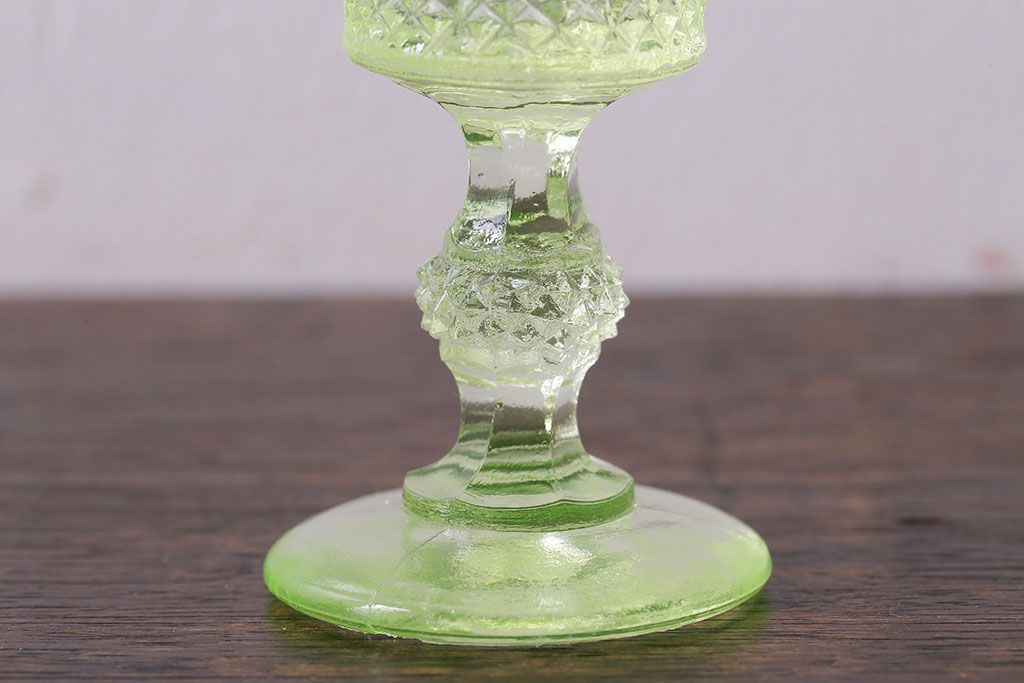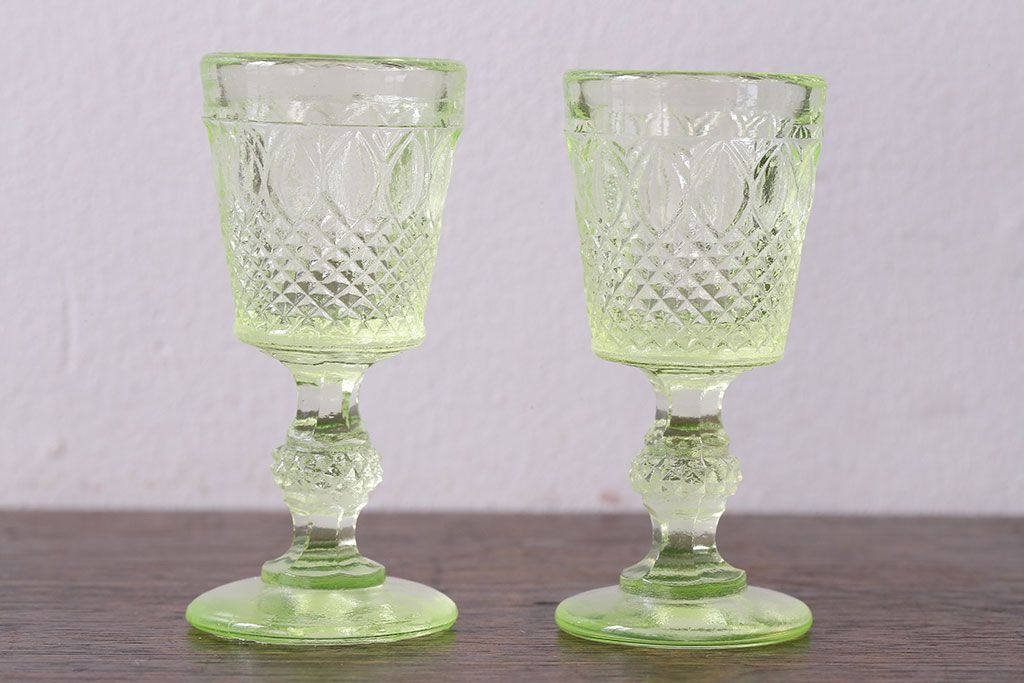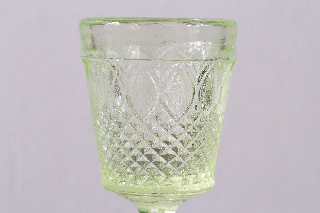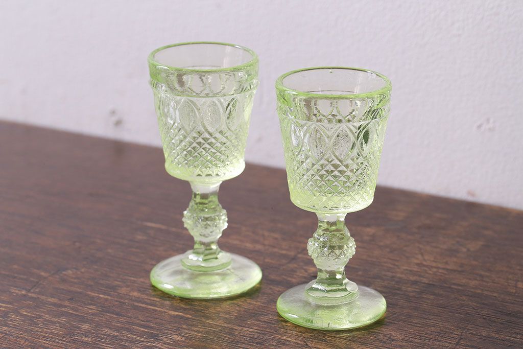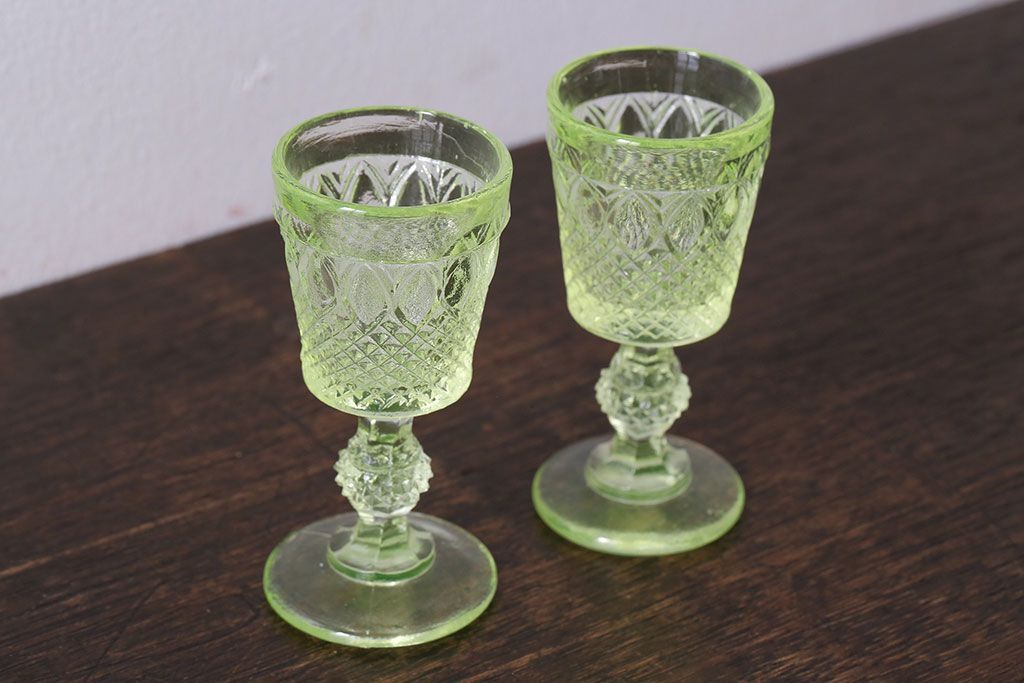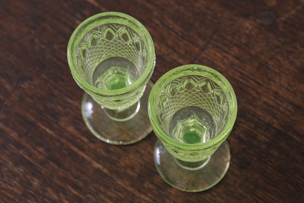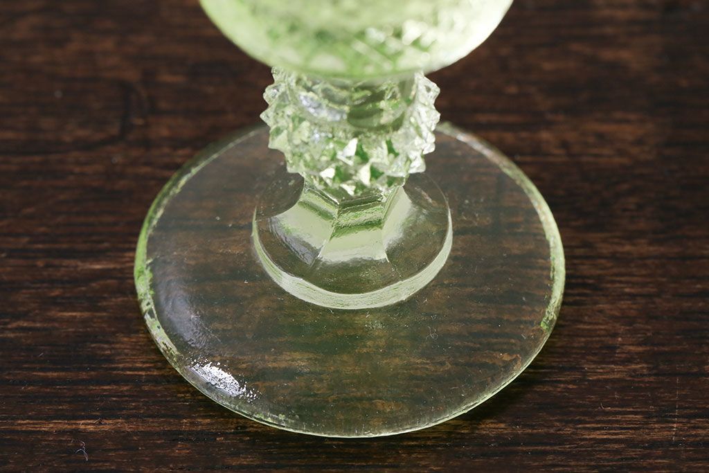 ラフジュ工房> 洋食器・キッチン用品 > アンティーク雑貨 【K様ご成約分】フランスアンティーク ウランガラス製 二つの表情が魅力的なリキュールグラス(ガラス杯、酒器、脚付コップ)