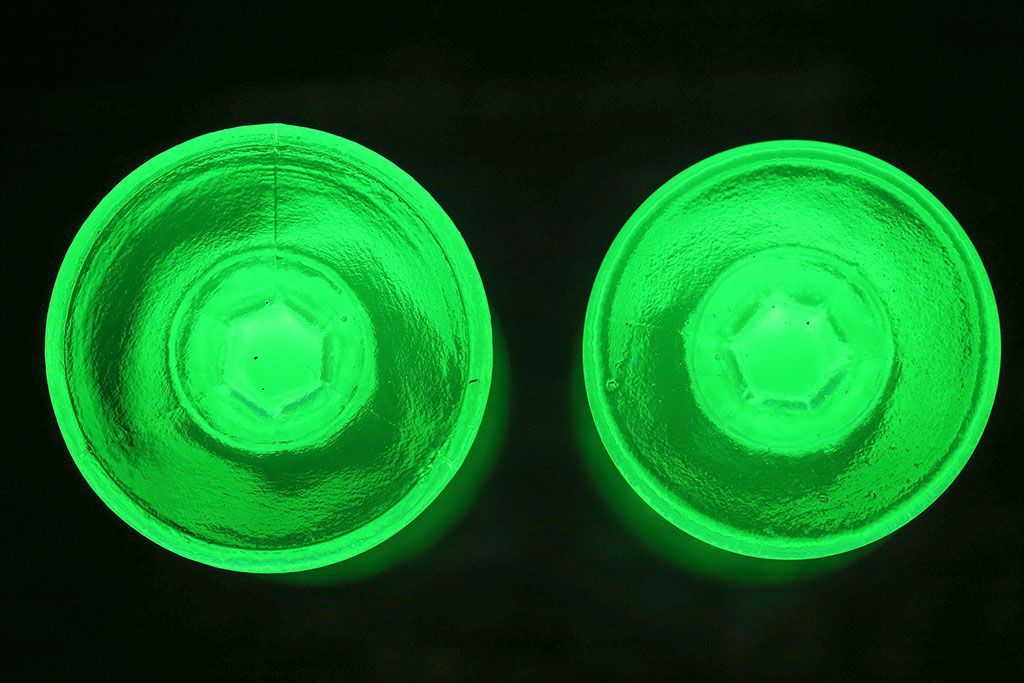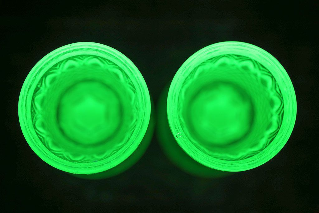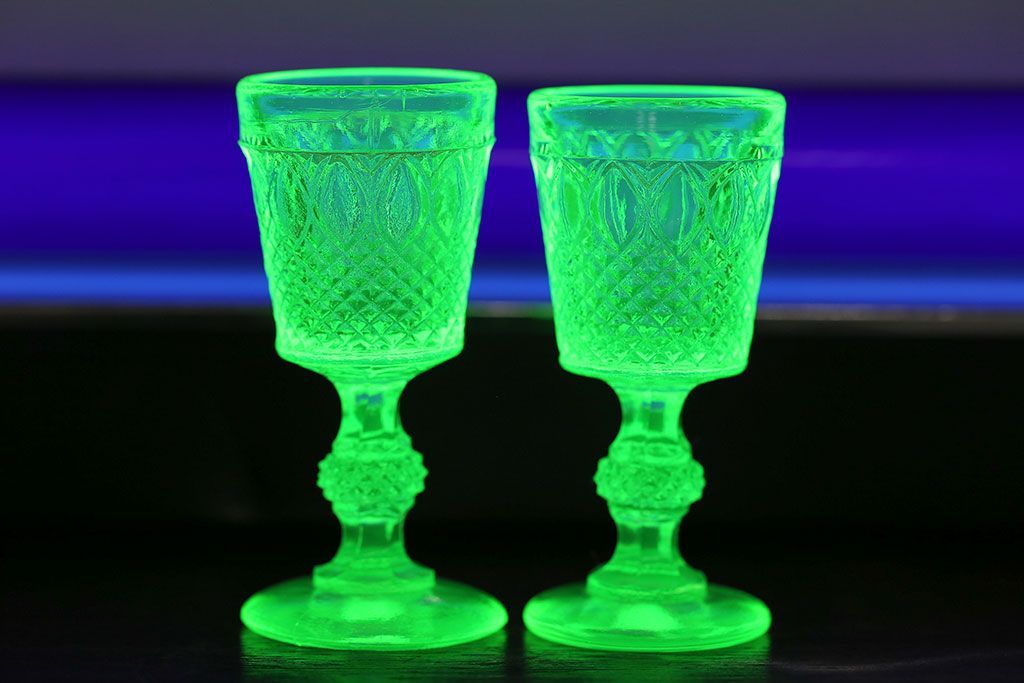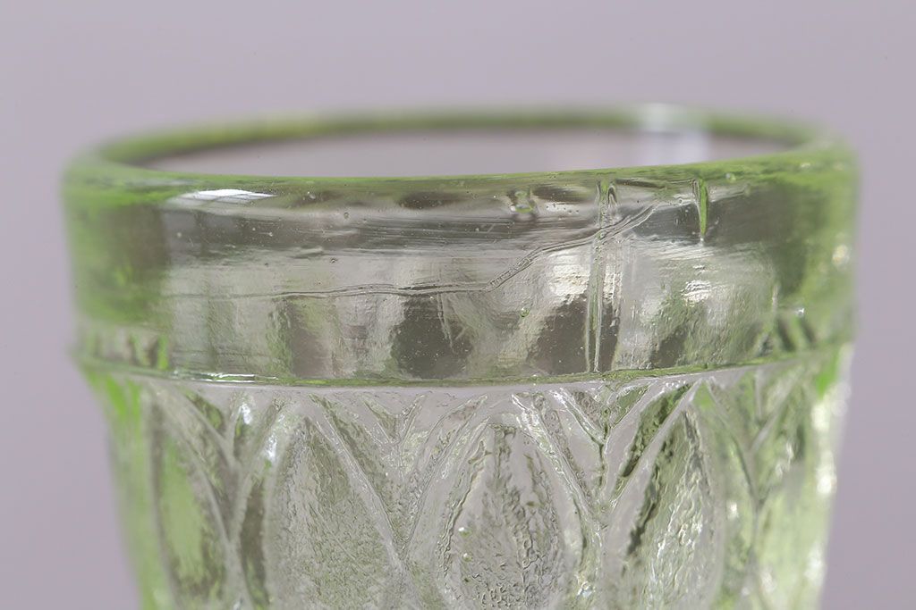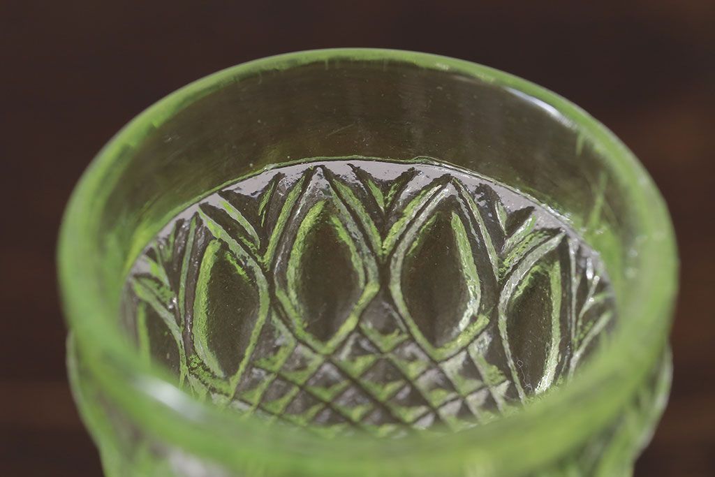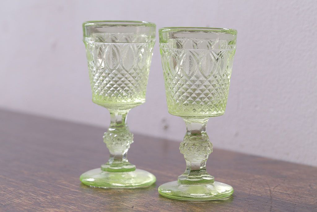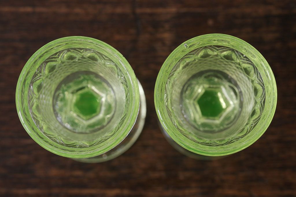 ラフジュ工房> 洋食器・キッチン用品 > アンティーク雑貨 【K様ご成約分】フランスアンティーク ウランガラス製 二つの表情が魅力的なリキュールグラス(ガラス杯、酒器、脚付コップ)