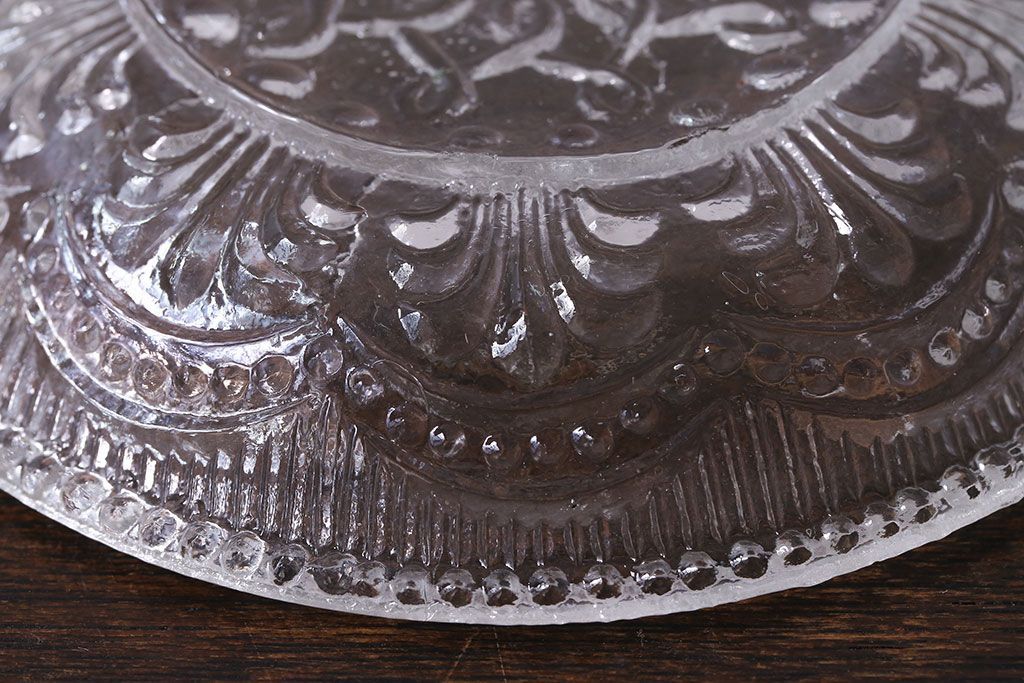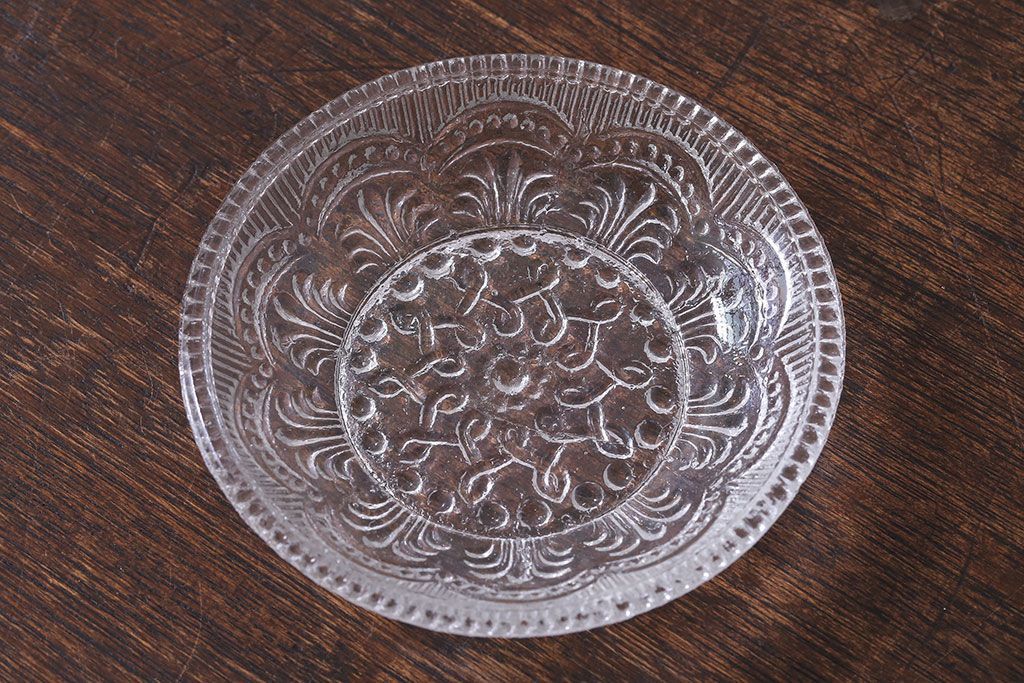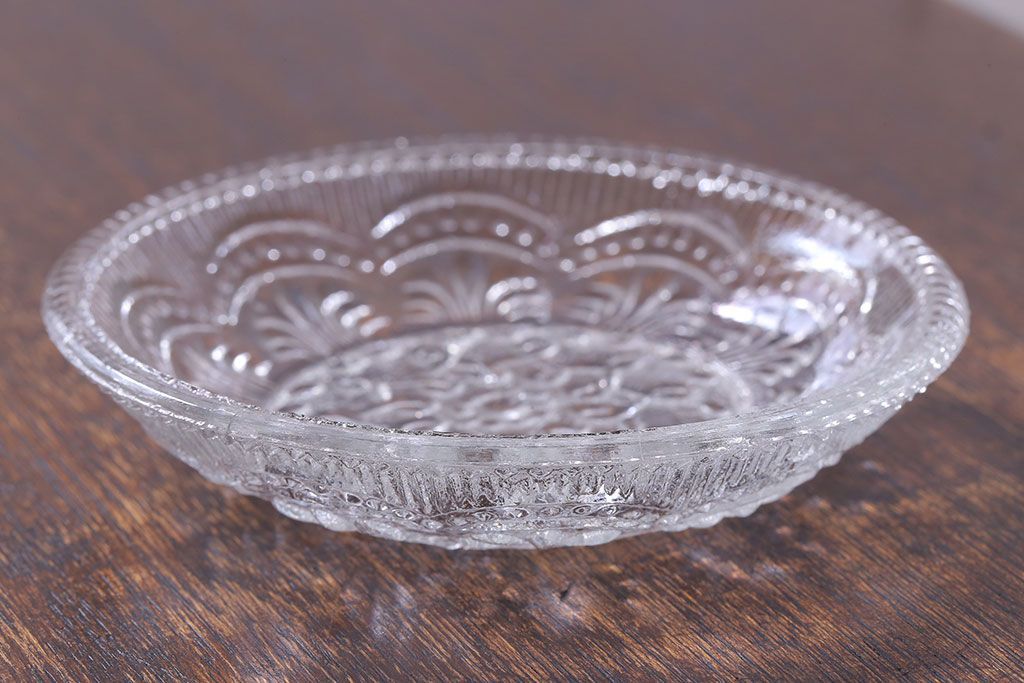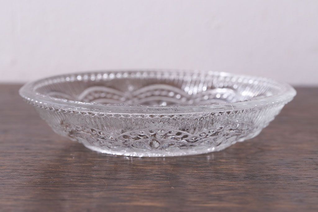 ラフジュ工房> 骨董・美術品> 骨董-ガラス食器 > アンティーク雑貨 大正期 十一曜・8字つなぎ アヤメ文 上品なデザインの小さなプレスガラス皿(深皿、レース皿)