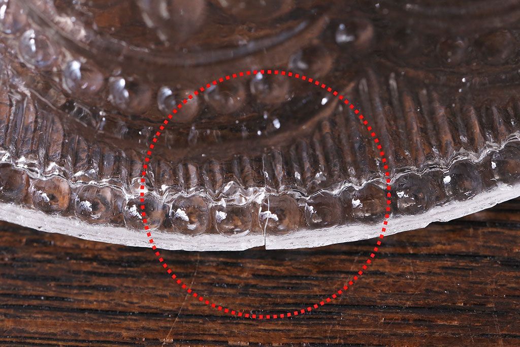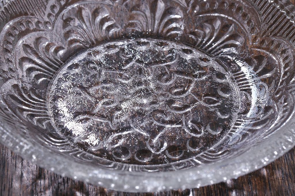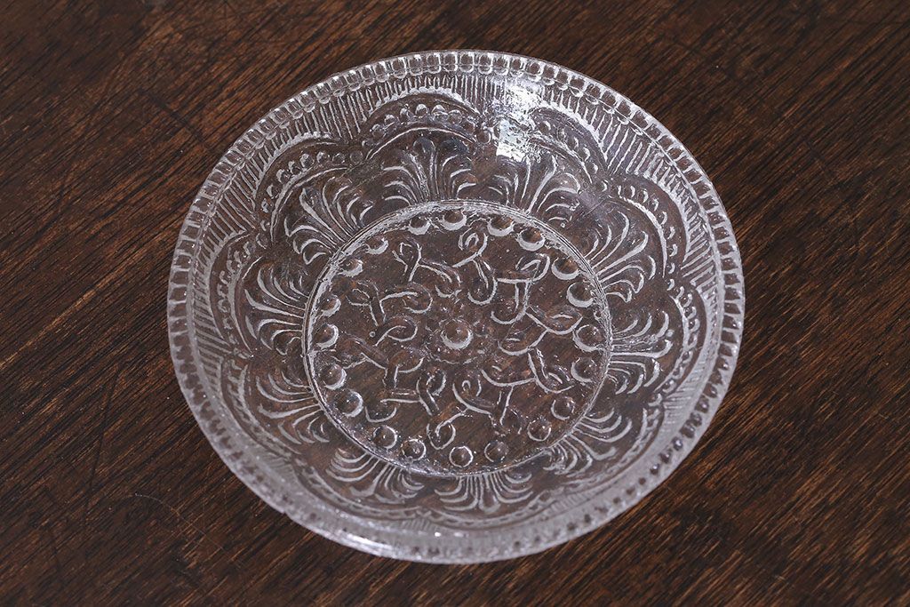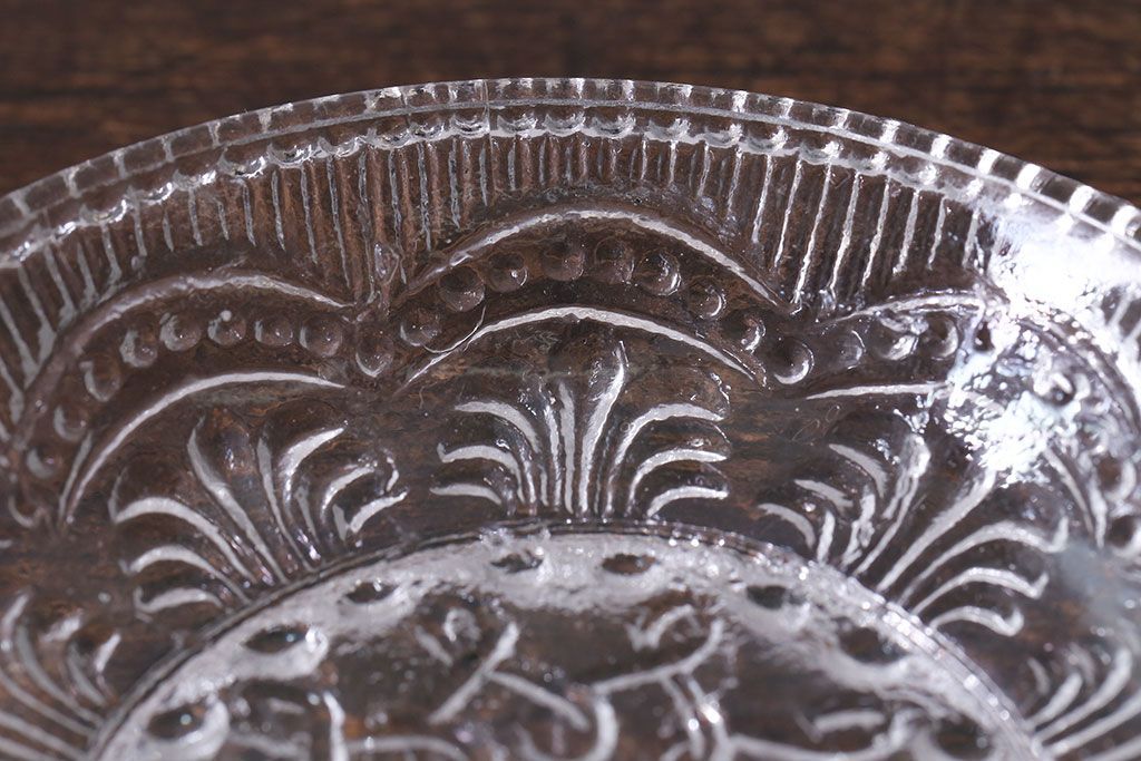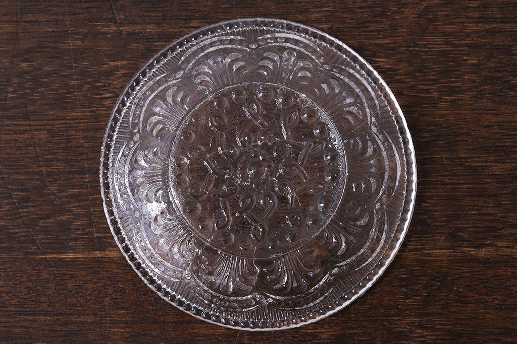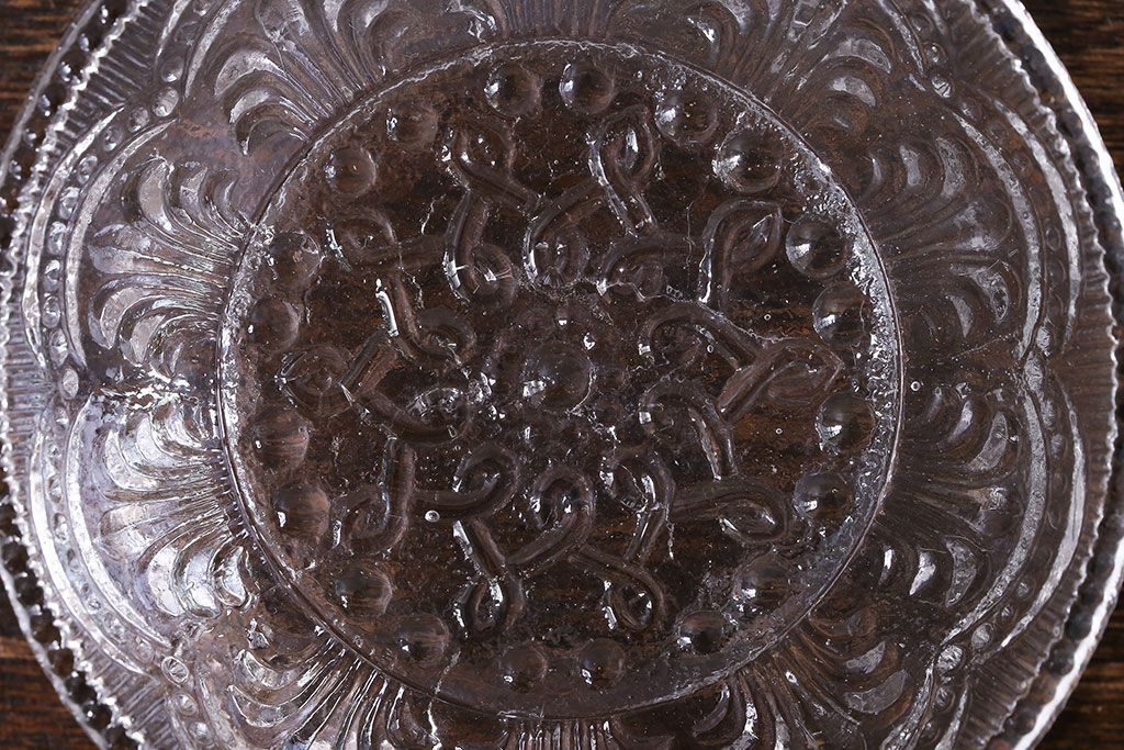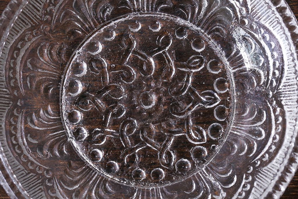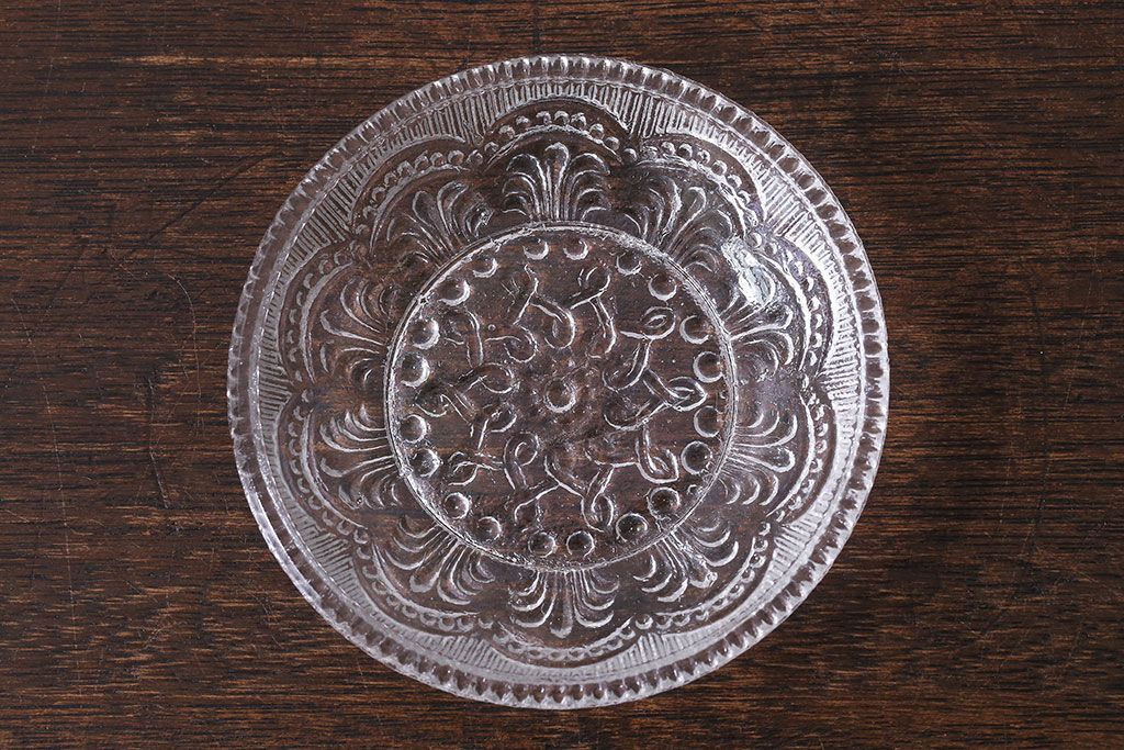ラフジュ工房> 和食器・茶道具 > アンティーク雑貨 大正期 十一曜・8字つなぎ アヤメ文 上品なデザインの小さなプレスガラス皿(深皿、レース皿)