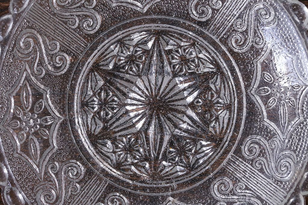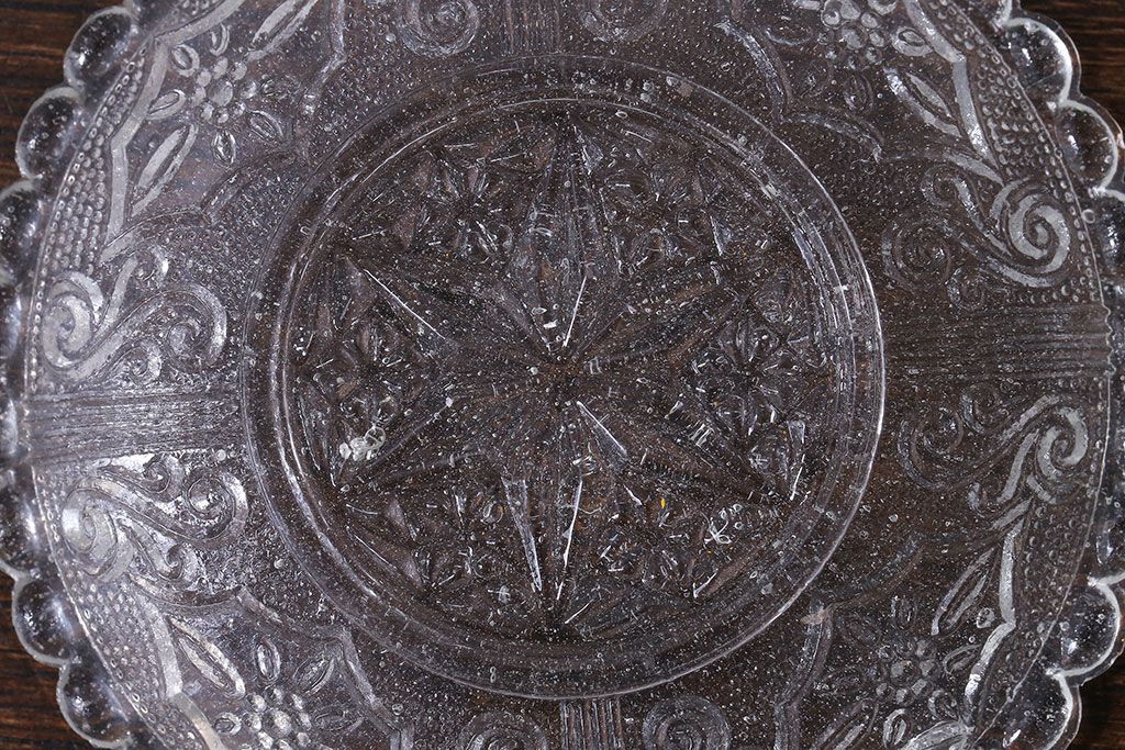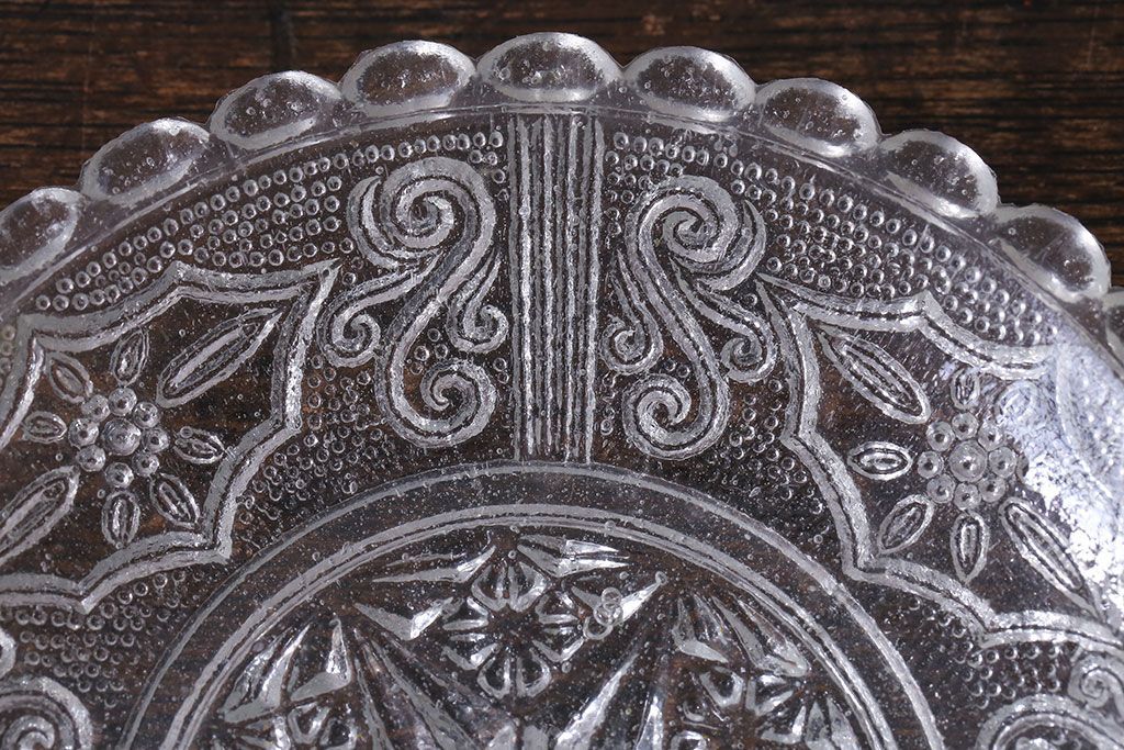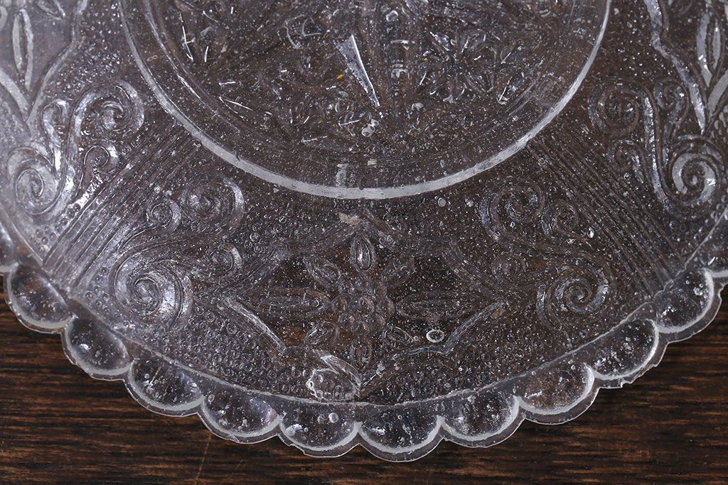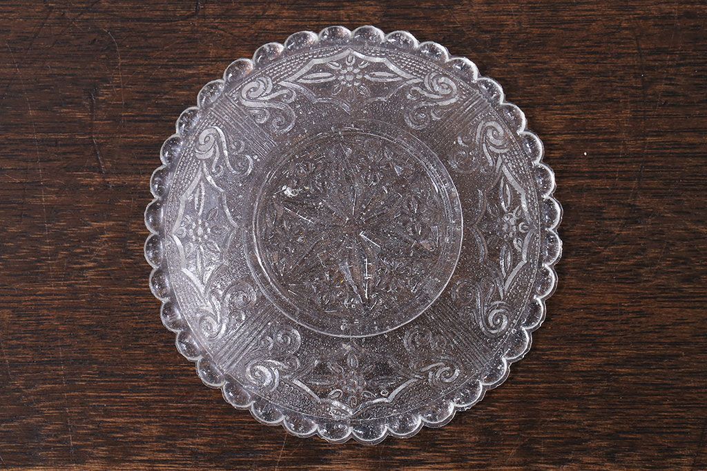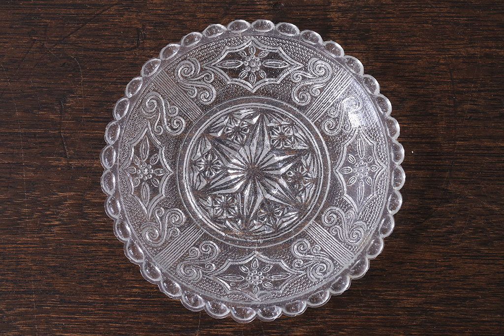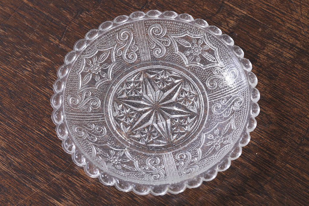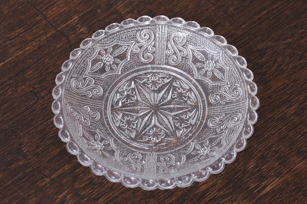 ラフジュ工房> 和食器・茶道具 > アンティーク雑貨 大正期 星・ダイヤ 唐草文 古い質感が味わい深いプレスガラスの小皿(ガラスプレート)