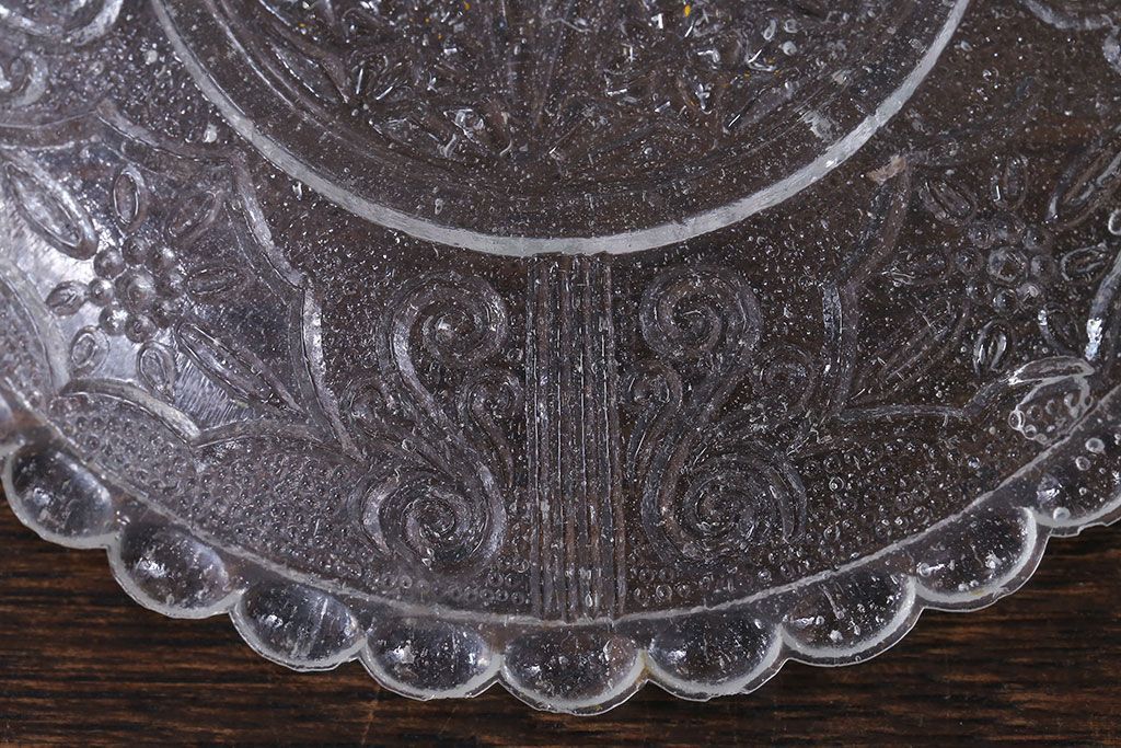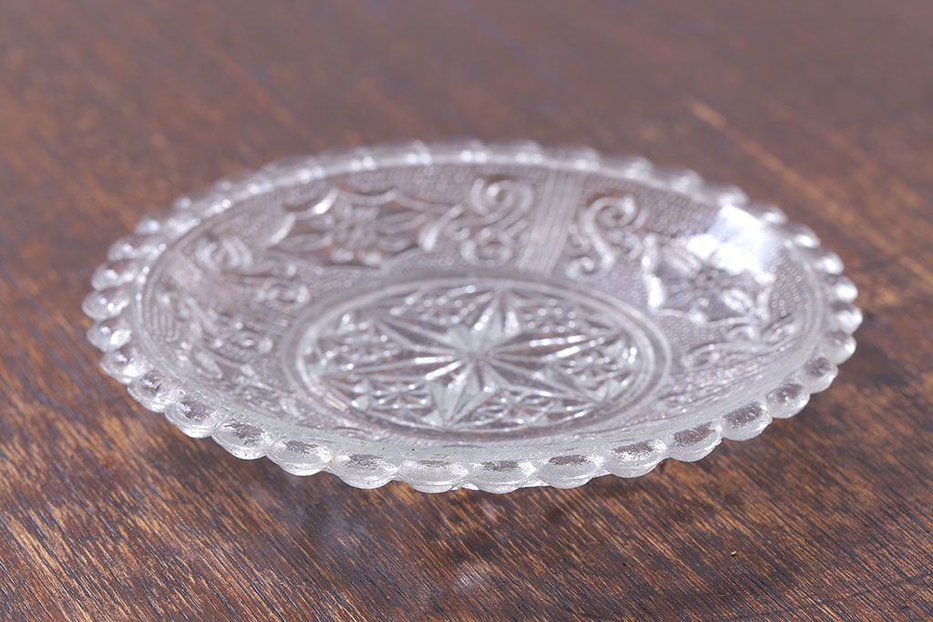 アンティーク雑貨 大正期 星・ダイヤ 唐草文 古い質感が味わい深いプレスガラスの小皿(ガラスプレート)
