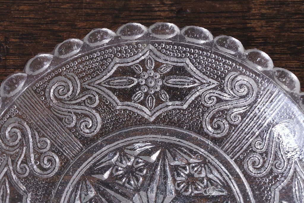ラフジュ工房> 骨董・美術品> 骨董-ガラス食器 > アンティーク雑貨 大正期 星・ダイヤ 唐草文 古い質感が味わい深いプレスガラスの小皿(ガラスプレート)