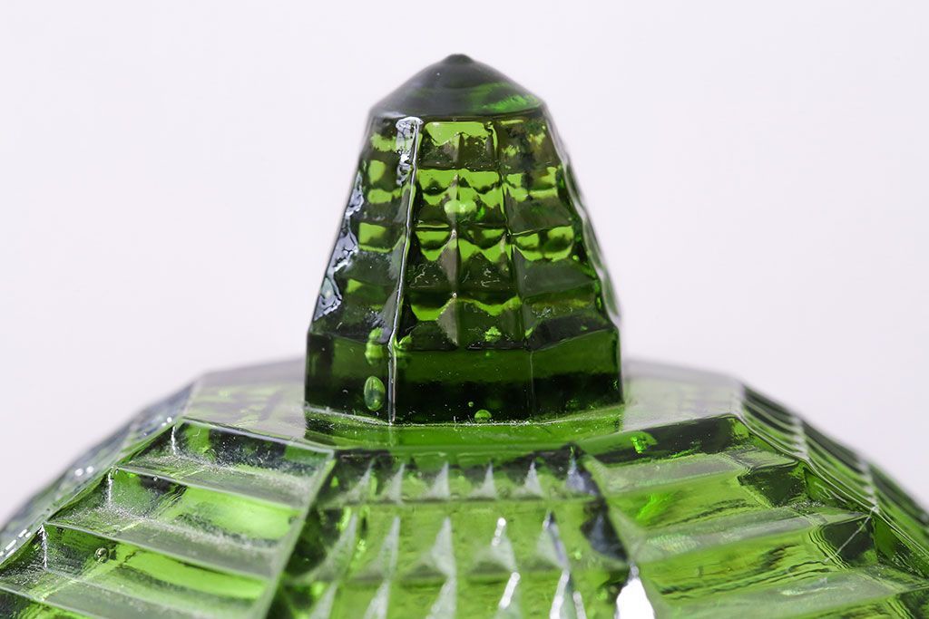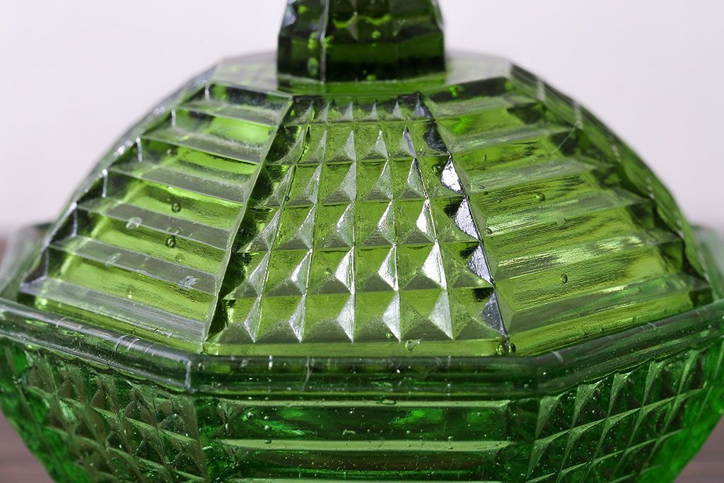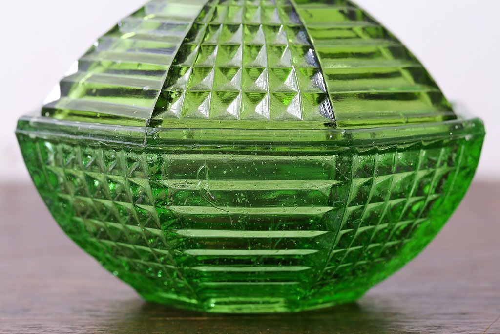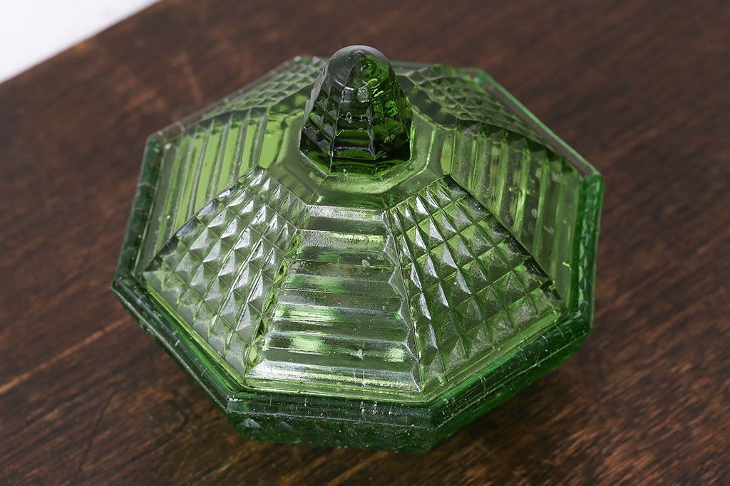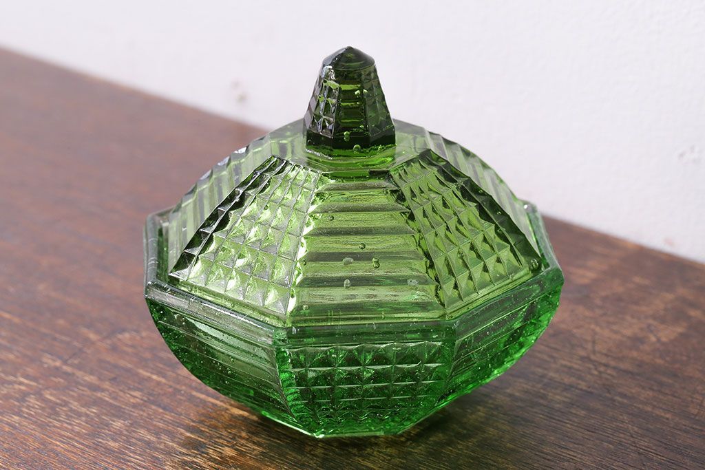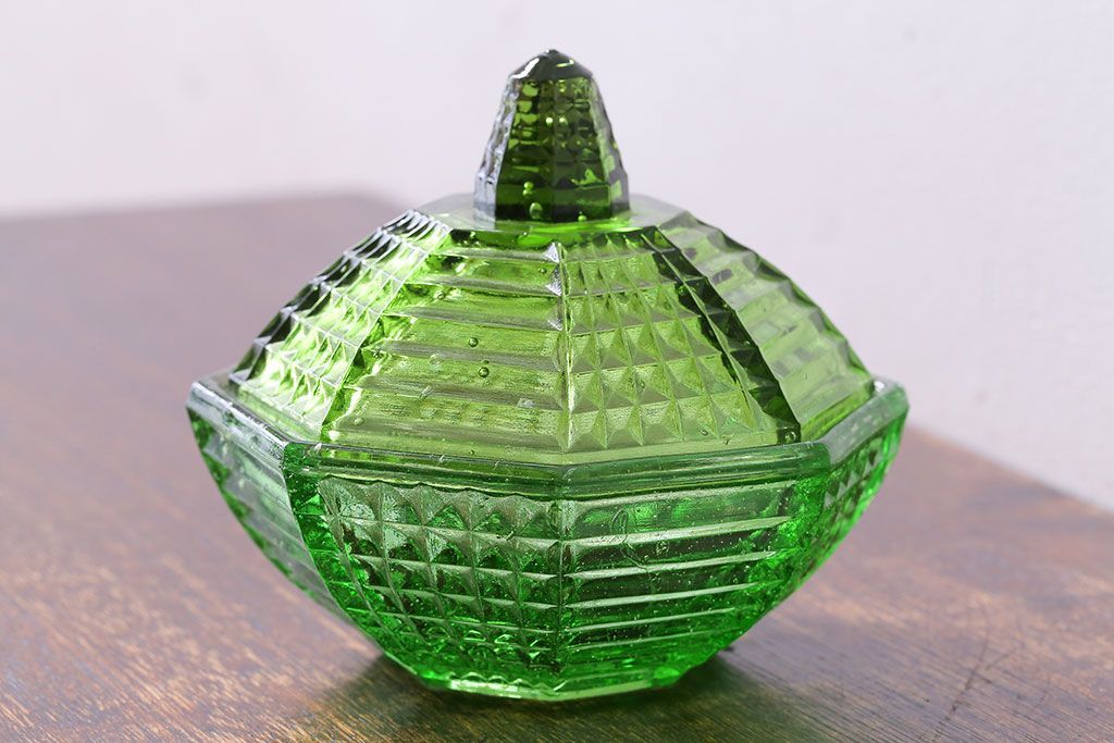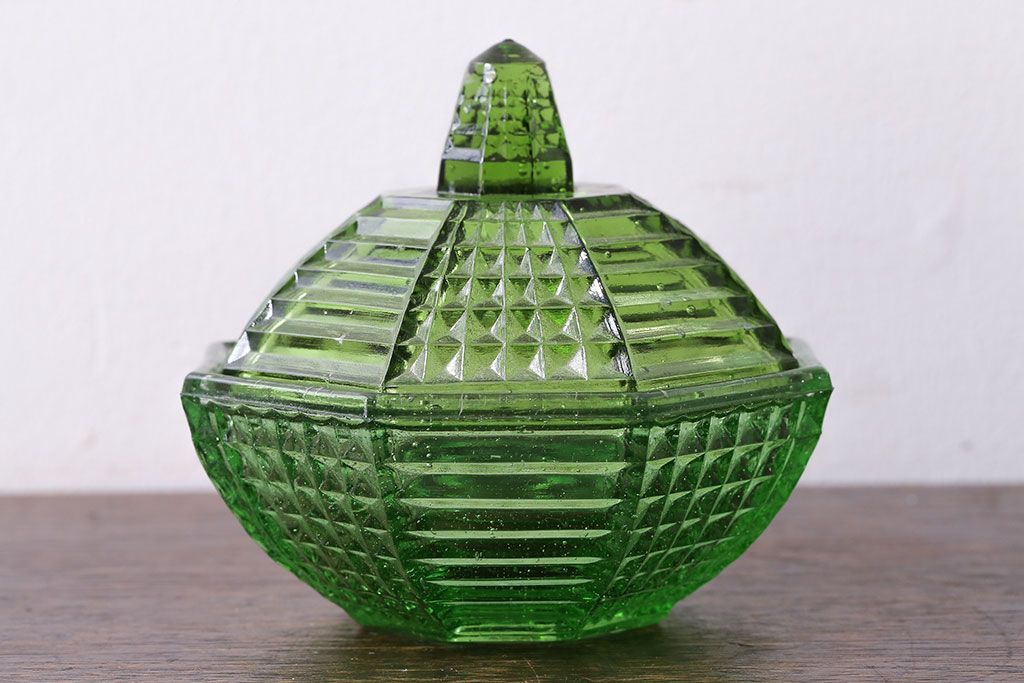 アンティーク雑貨 昭和初期! 味わい深い緑色のプレスガラスのキャンディーポット(蓋付き器、小物入れ)