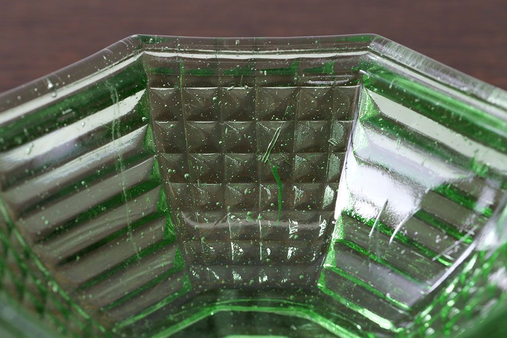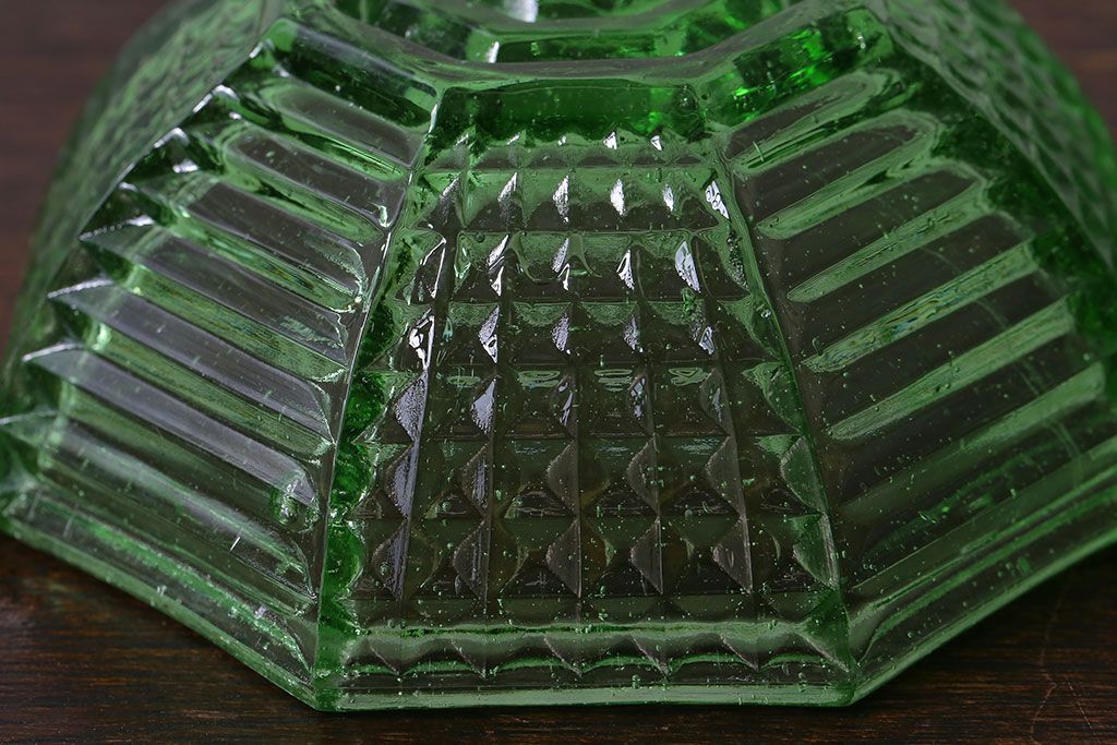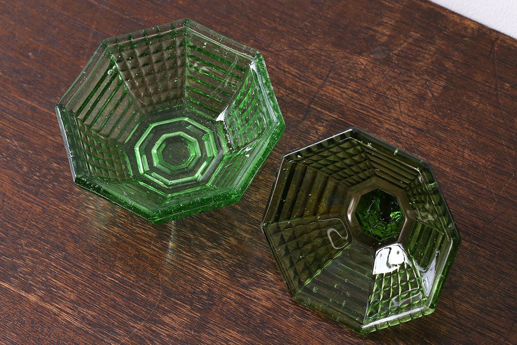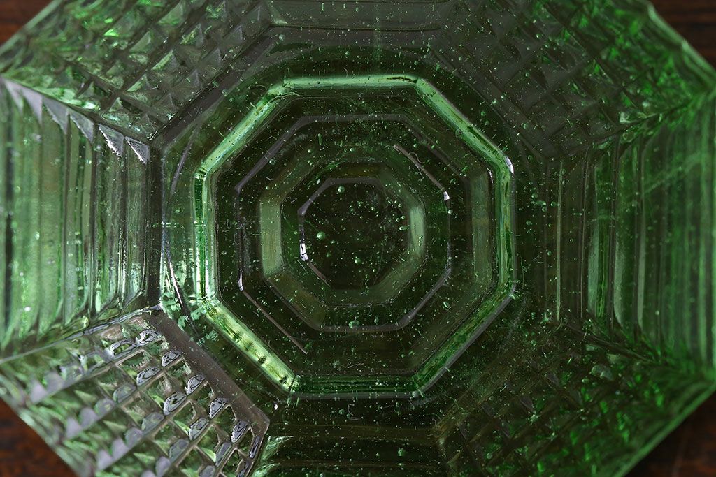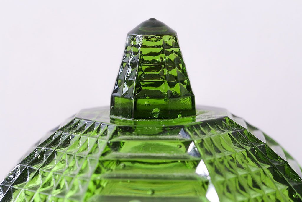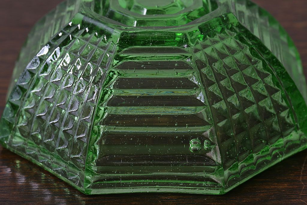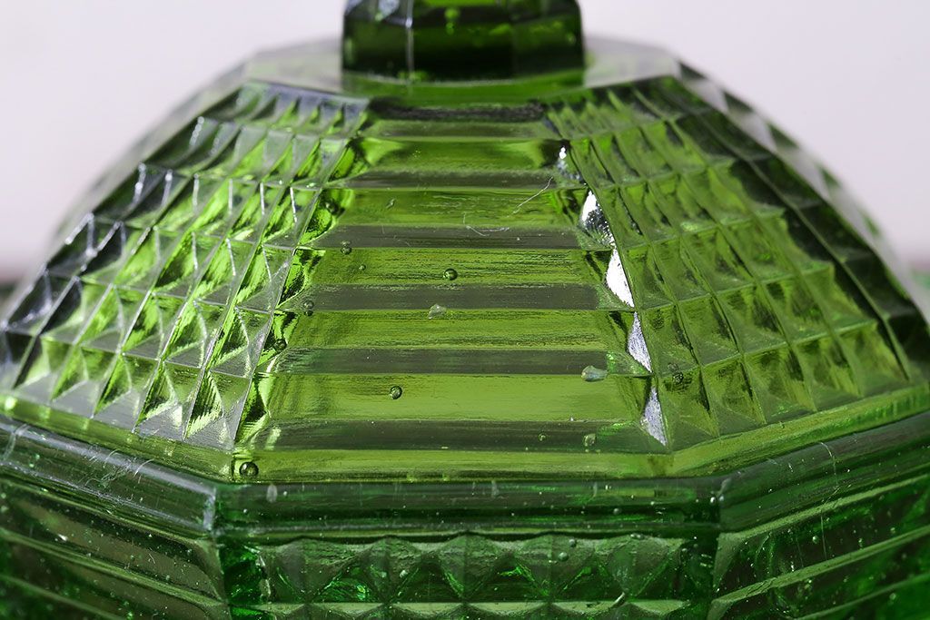 アンティーク雑貨 昭和初期! 味わい深い緑色のプレスガラスのキャンディーポット(蓋付き器、小物入れ)