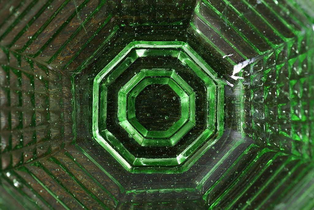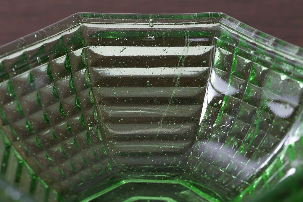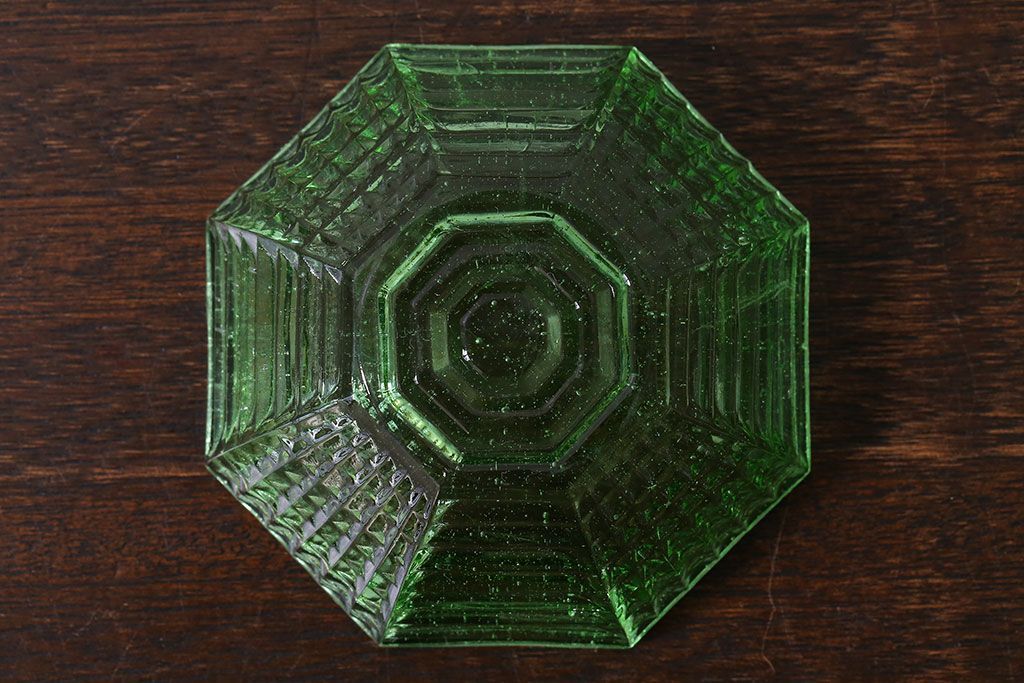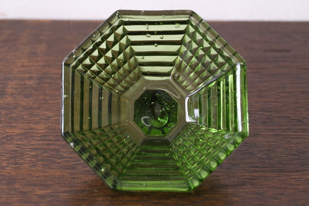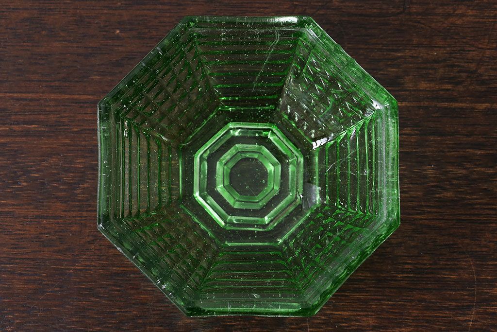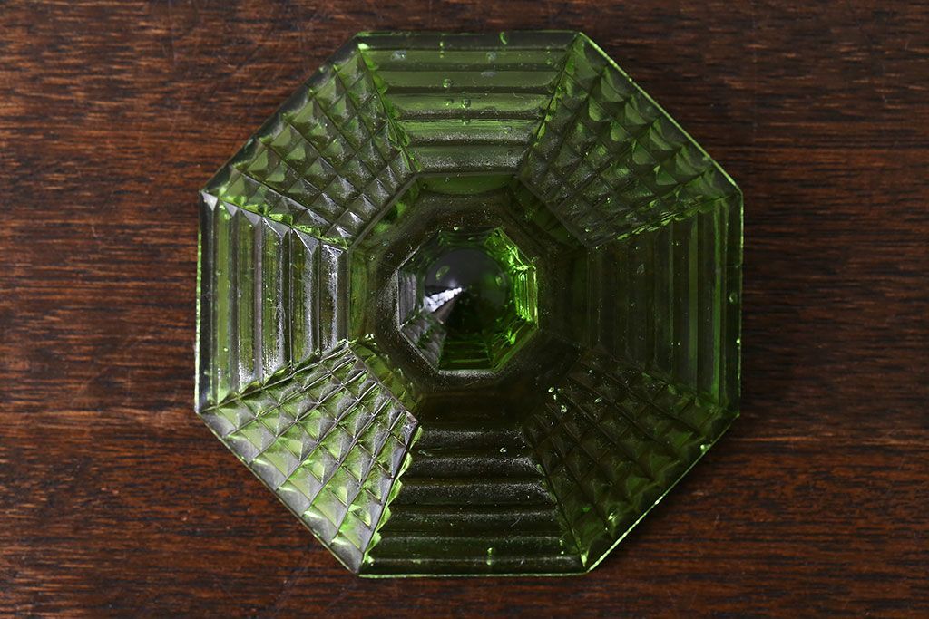 ラフジュ工房> 雑貨> ガラス瓶・花瓶 > アンティーク雑貨 昭和初期! 味わい深い緑色のプレスガラスのキャンディーポット(蓋付き器、小物入れ)