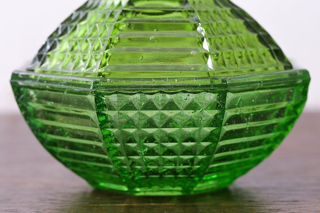 ラフジュ工房> 雑貨 > アンティーク雑貨 昭和初期! 味わい深い緑色のプレスガラスのキャンディーポット(蓋付き器、小物入れ)