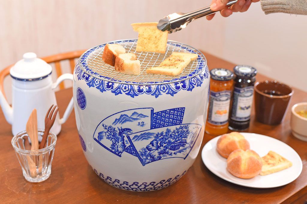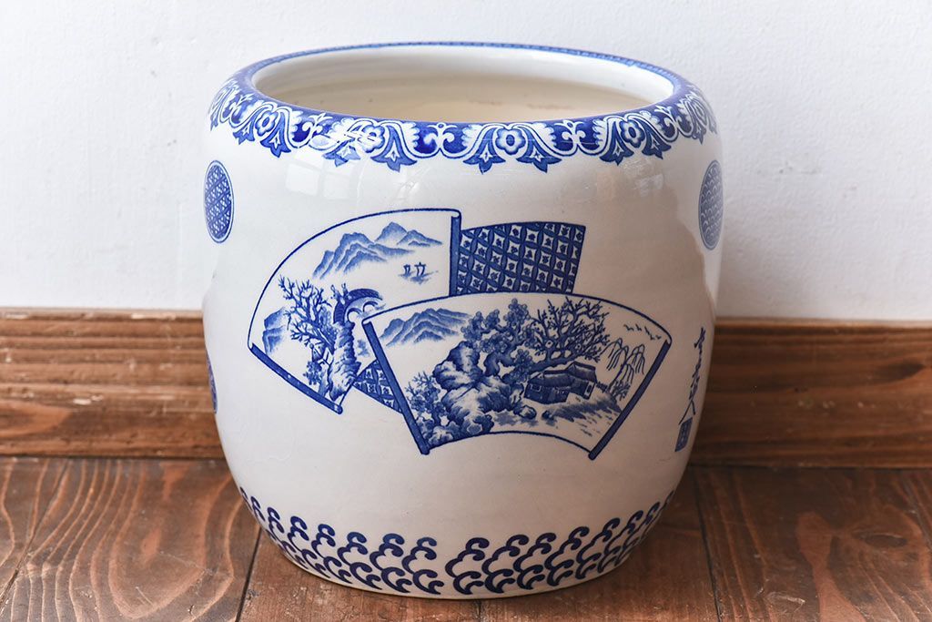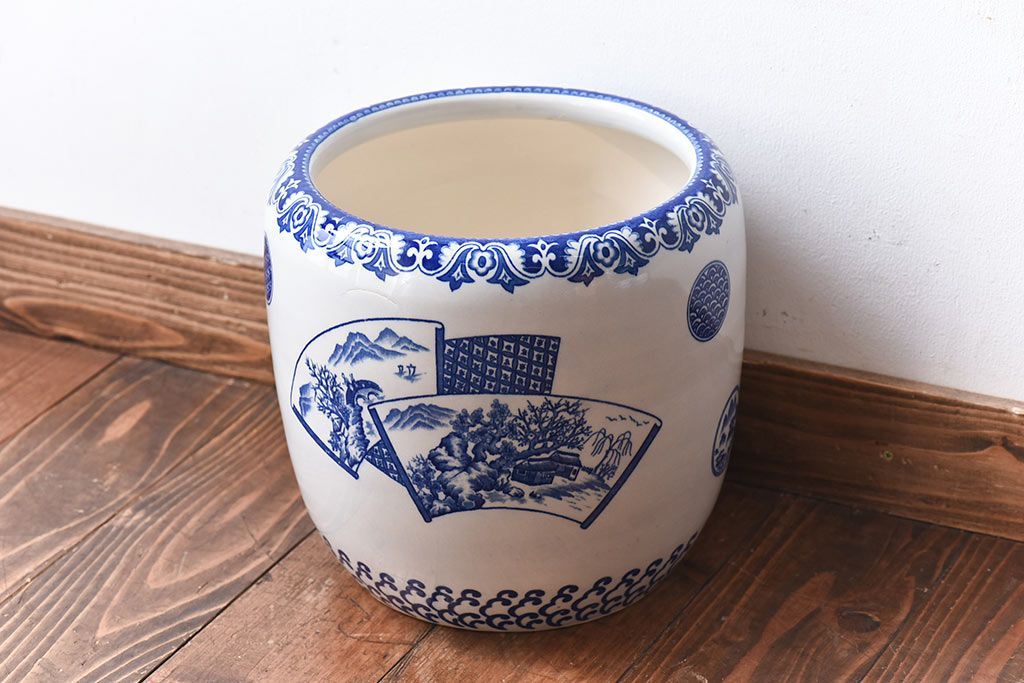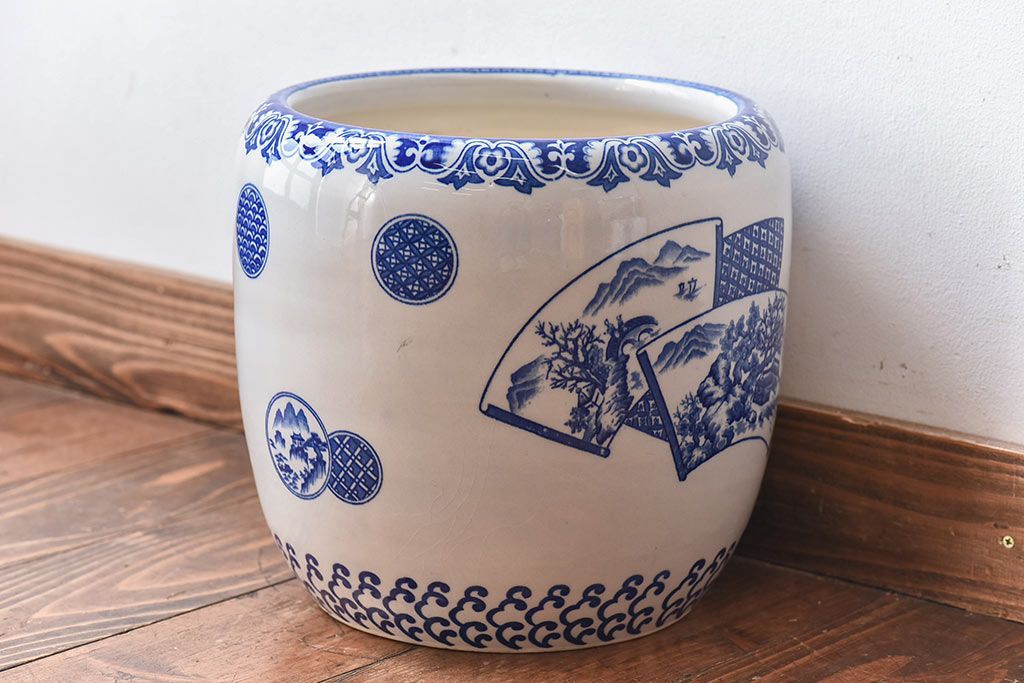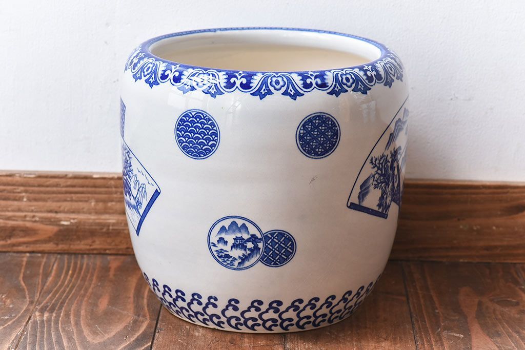 火鉢> 瀬戸火鉢 > アンティーク雑貨 昭和期 山水図 窓絵 在銘 重光山人 和の雰囲気漂う瀬戸火鉢(鉢カバー)