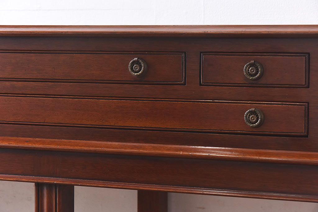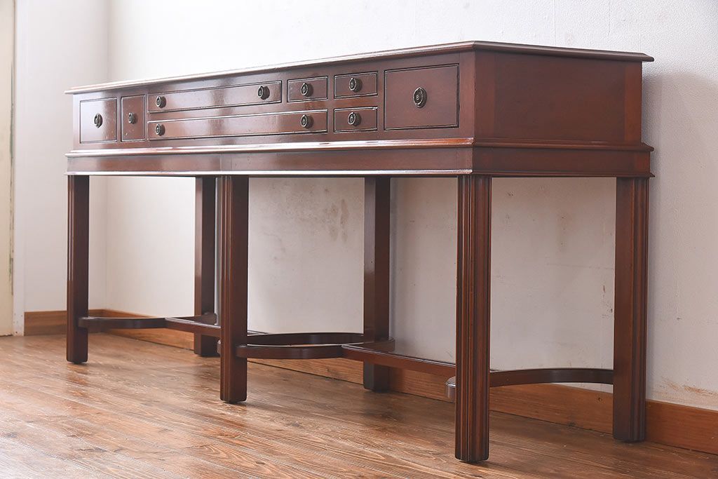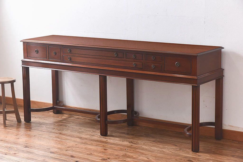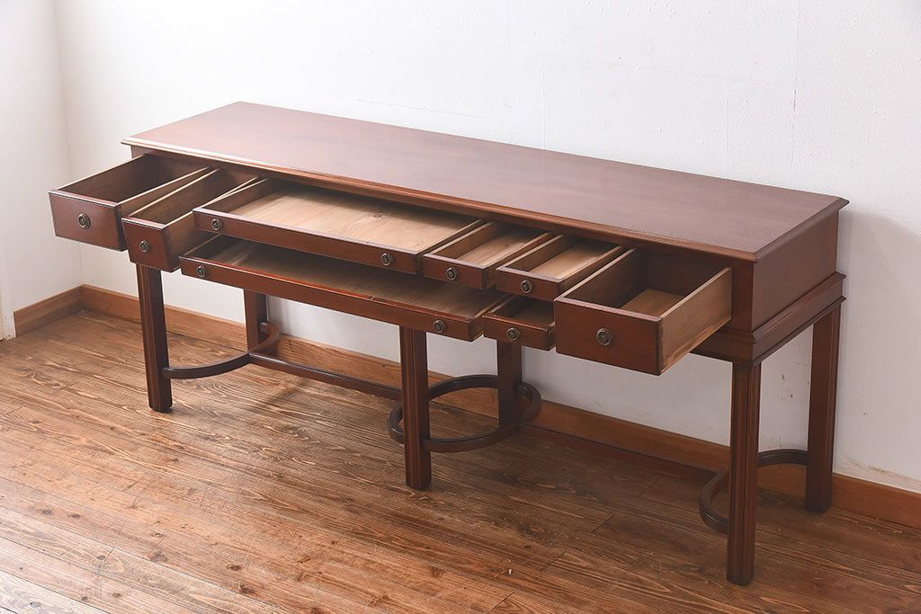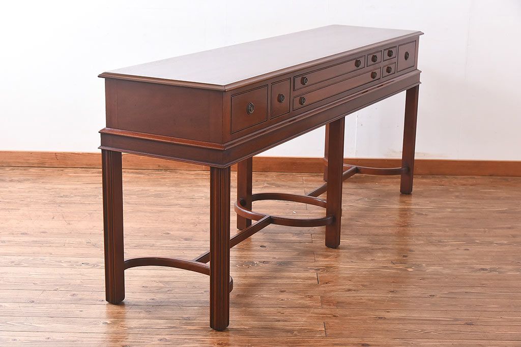 イギリスアンティーク マホガニー 細かな引き出しが魅力の薄型コンソールテーブル(サイドテーブル)です。