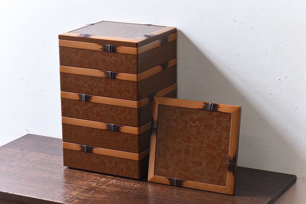 アンティーク雑貨 木製漆器 竹モチーフの縁が目を引く五段重箱(お重)