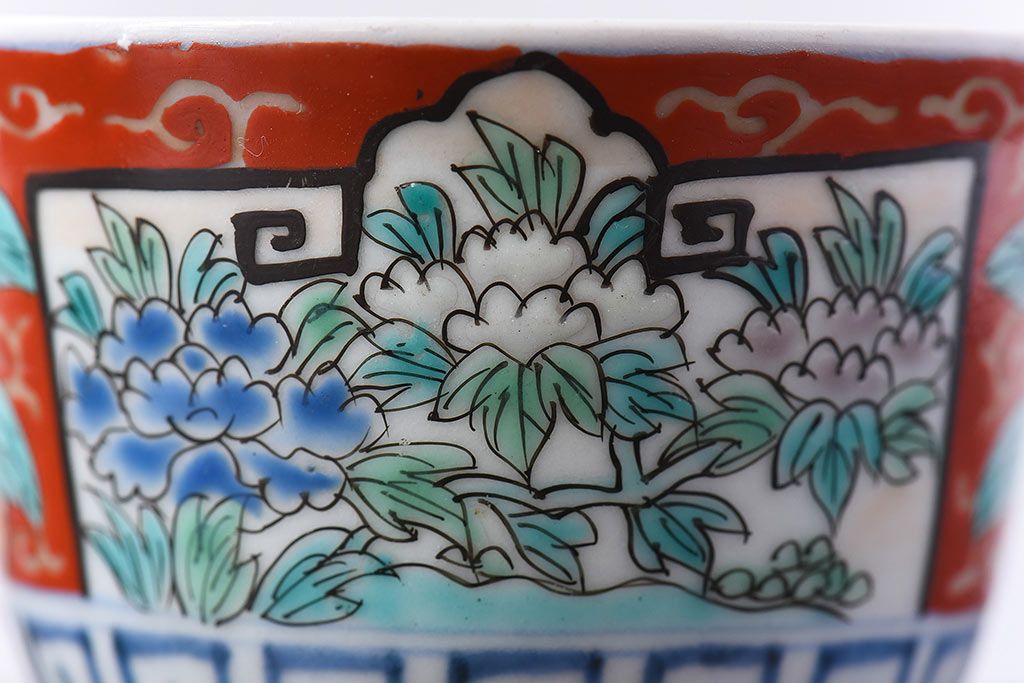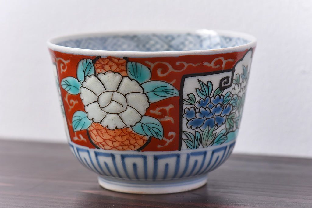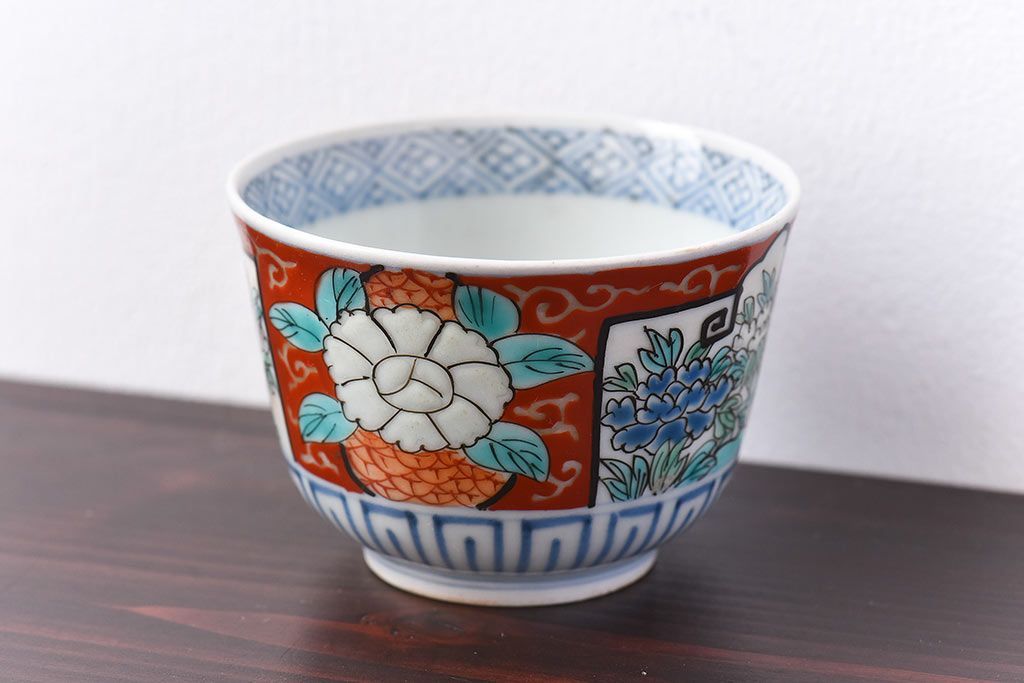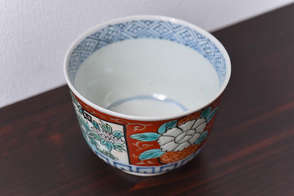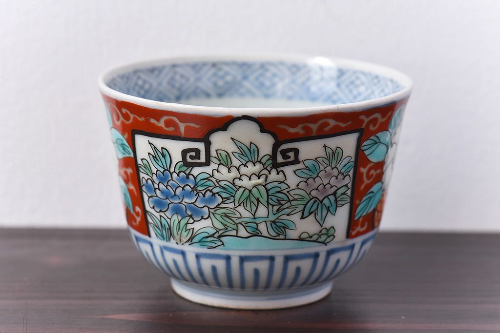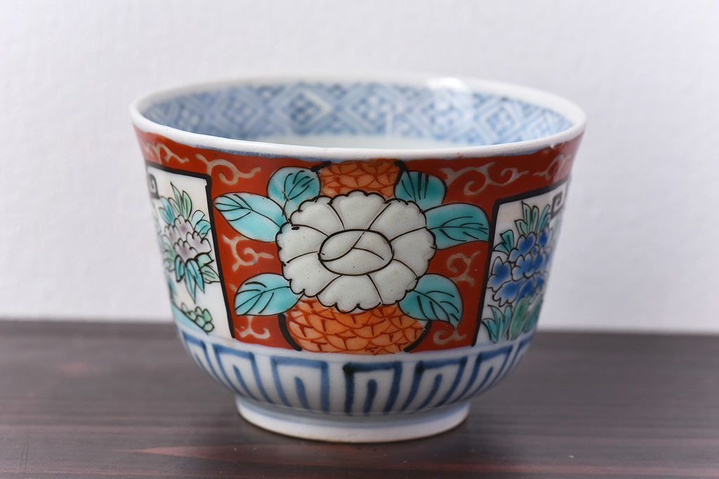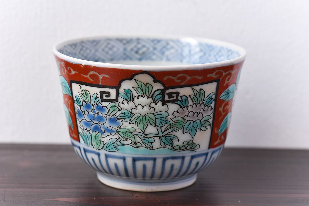 ラフジュ工房> 骨董・美術品> 骨董-陶磁器 > アンティーク雑貨 古民具・骨董 江戸期 華やかな古伊万里色絵染付 蕎麦猪口(湯呑、向付)(3)