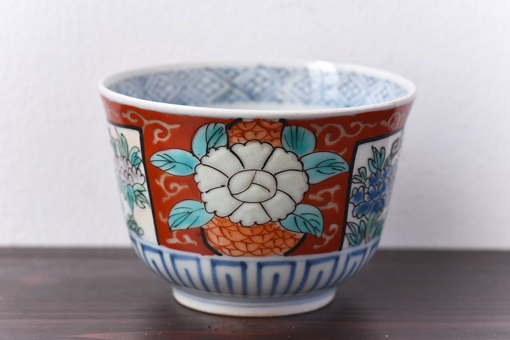 アンティーク雑貨 古民具・骨董 江戸期 華やかな古伊万里色絵染付 蕎麦猪口(湯呑、向付)(3)