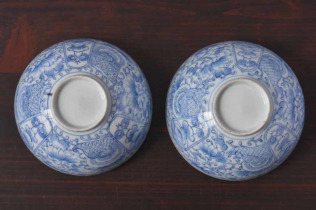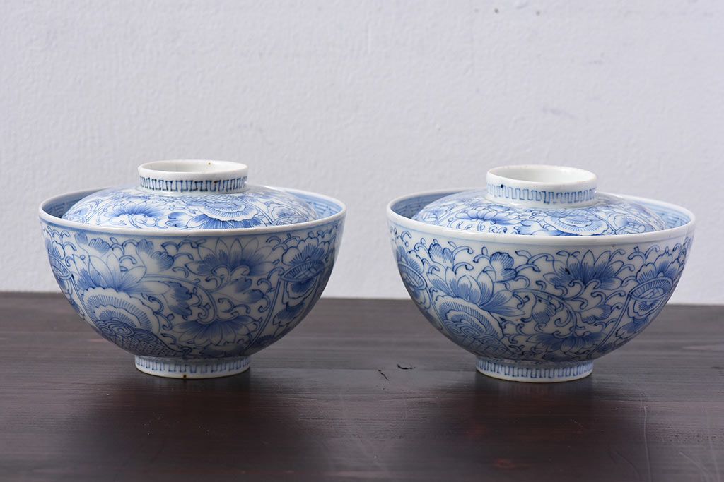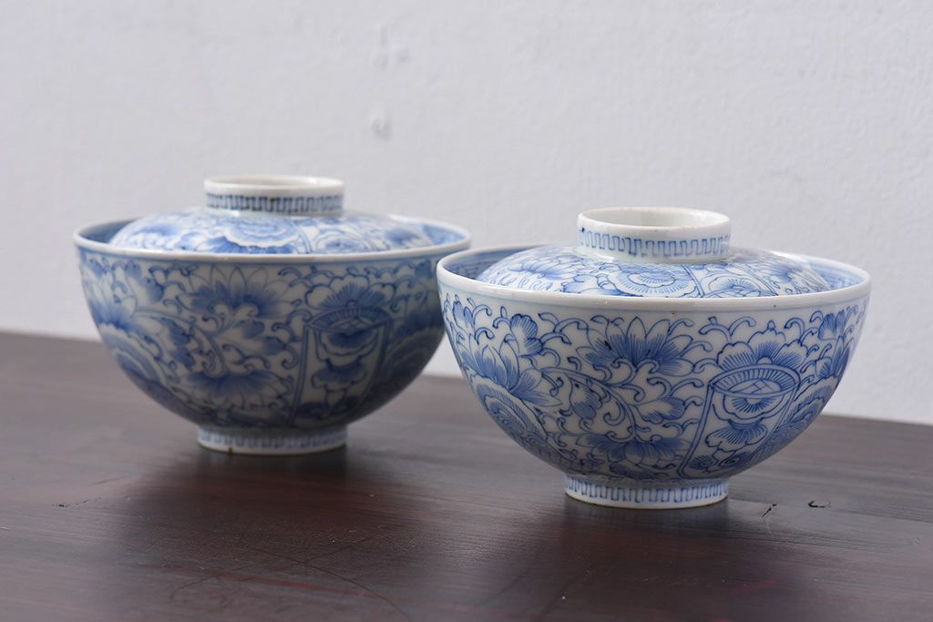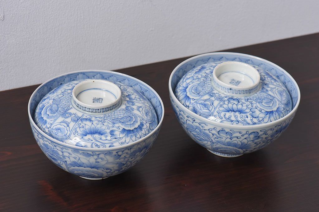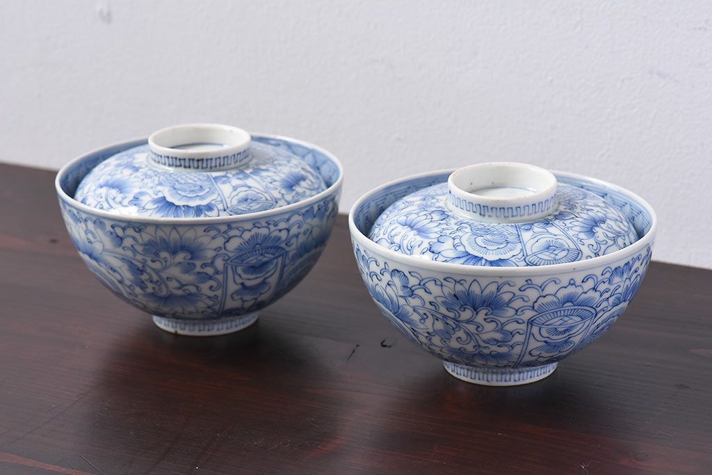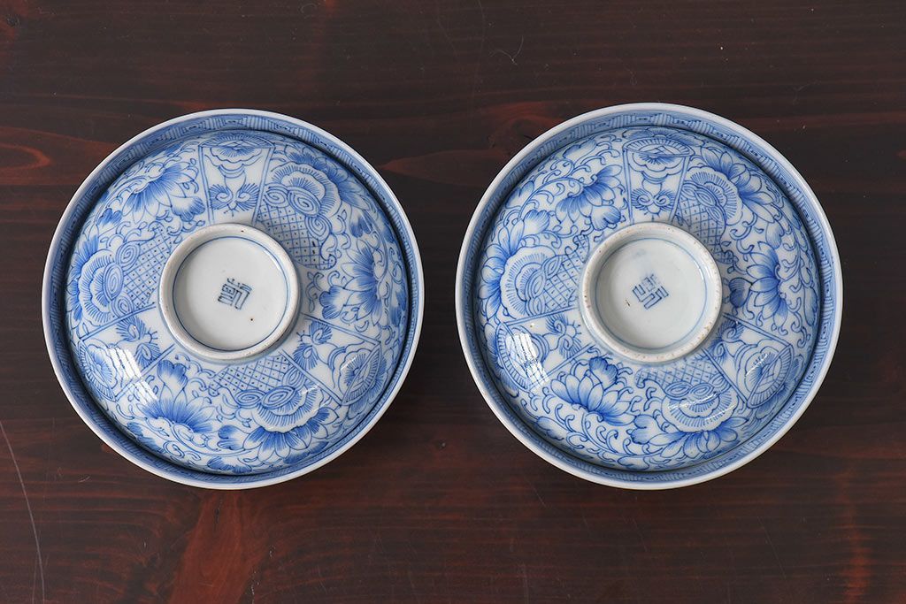 アンティーク雑貨 江戸時代後期 伊万里焼 線描染付 蓋茶碗2客セット(1)