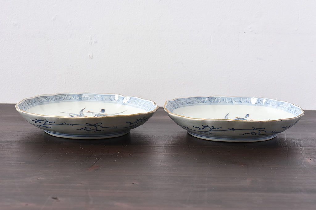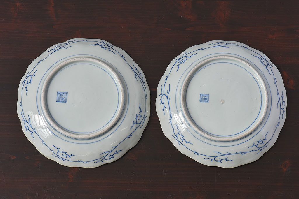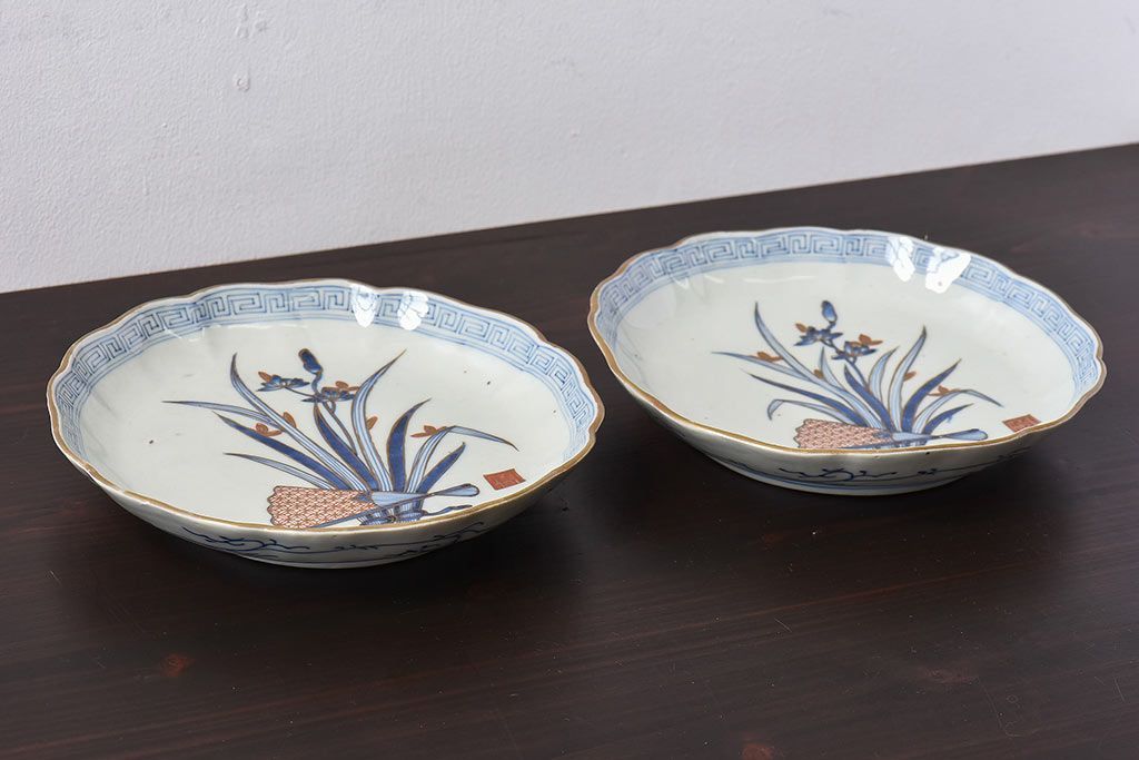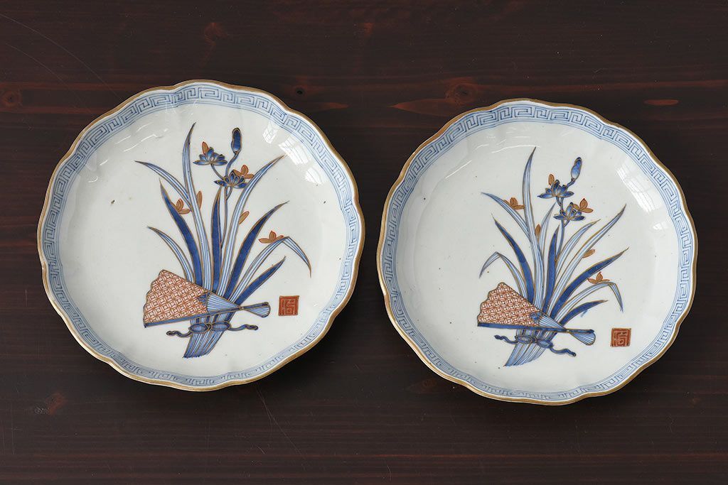 ラフジュ工房> 骨董・美術品> 骨董-陶磁器 > アンティーク雑貨 江戸期 古伊万里 水仙に扇面図 染付 七寸皿(中皿)2枚セット(2)