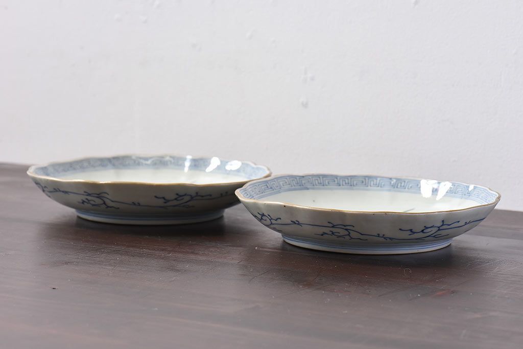 アンティーク雑貨 江戸期 古伊万里 水仙に扇面図 染付 七寸皿(中皿)2枚セット(2)
