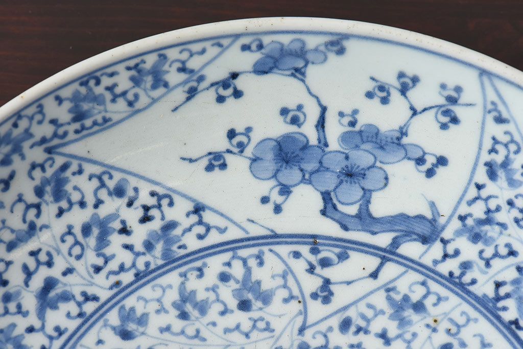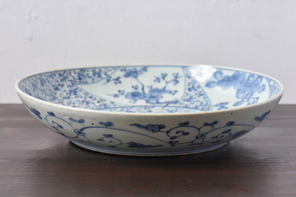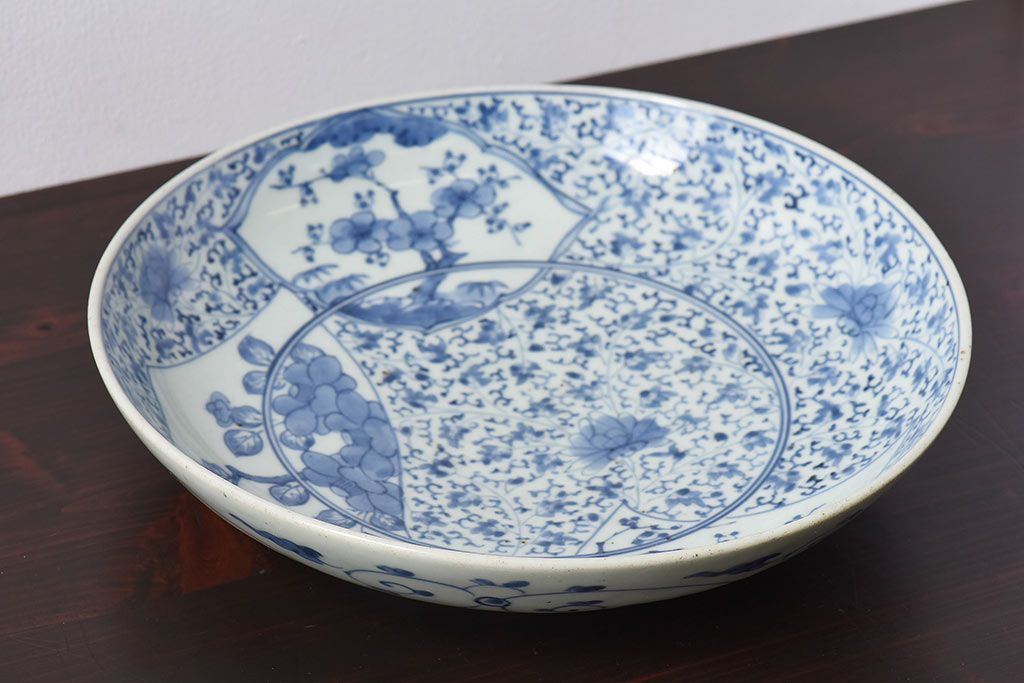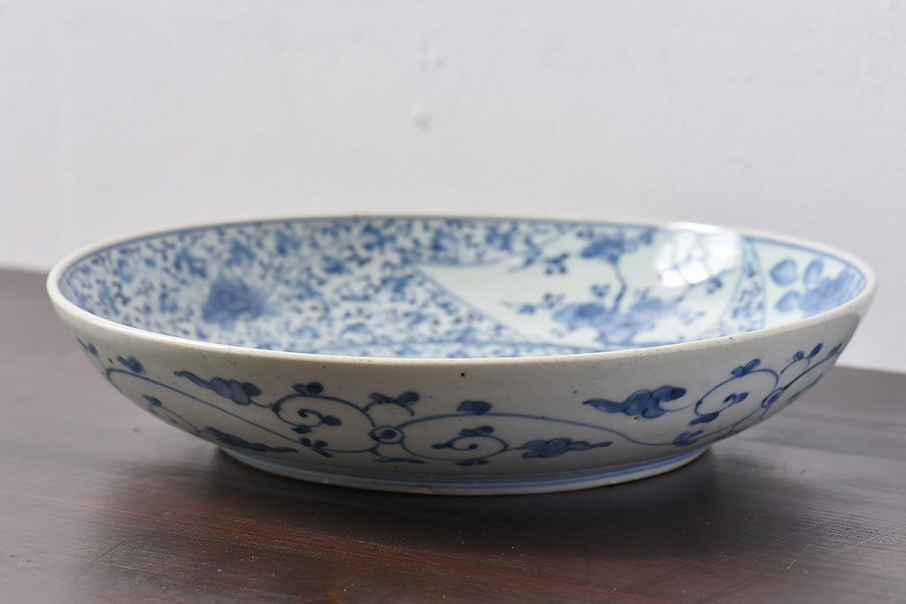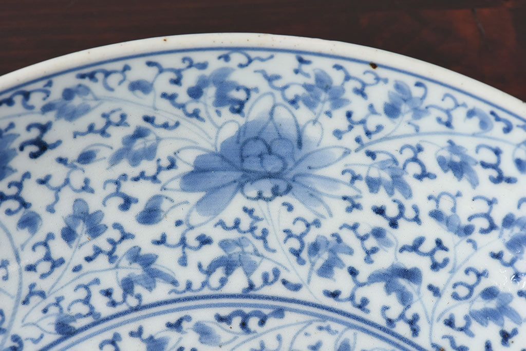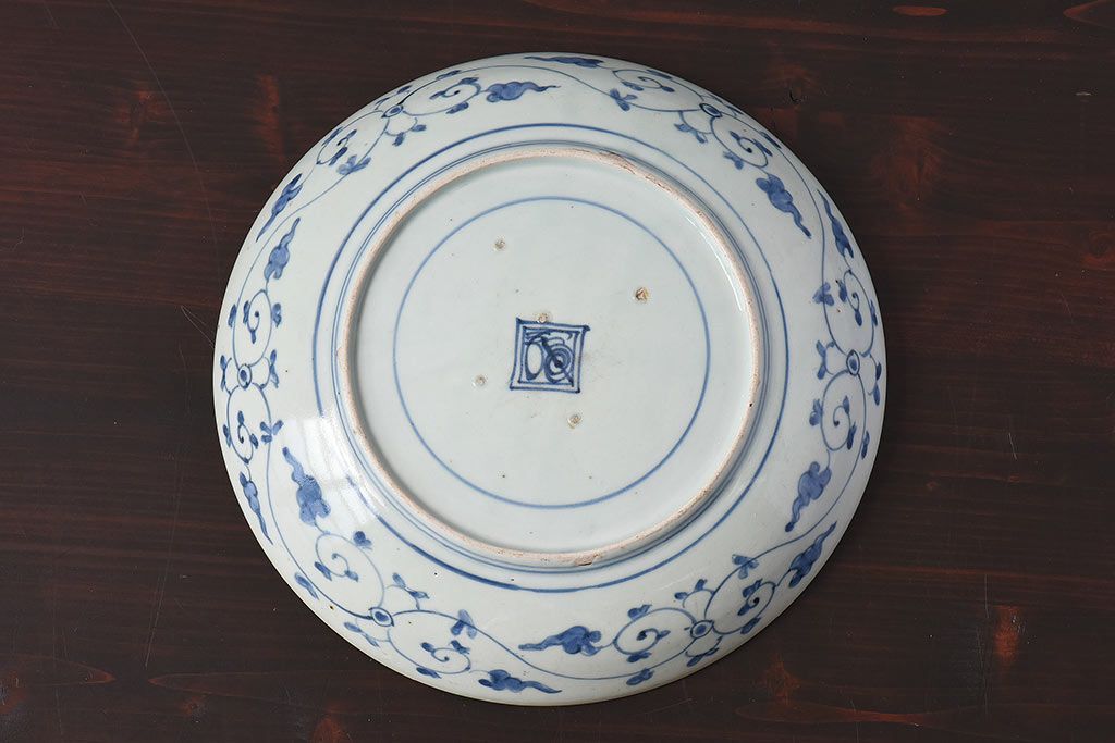 ラフジュ工房> 骨董・美術品> 骨董-陶磁器 > アンティーク雑貨 江戸期 古伊万里 花唐草文 染付 九寸深皿(渦福)