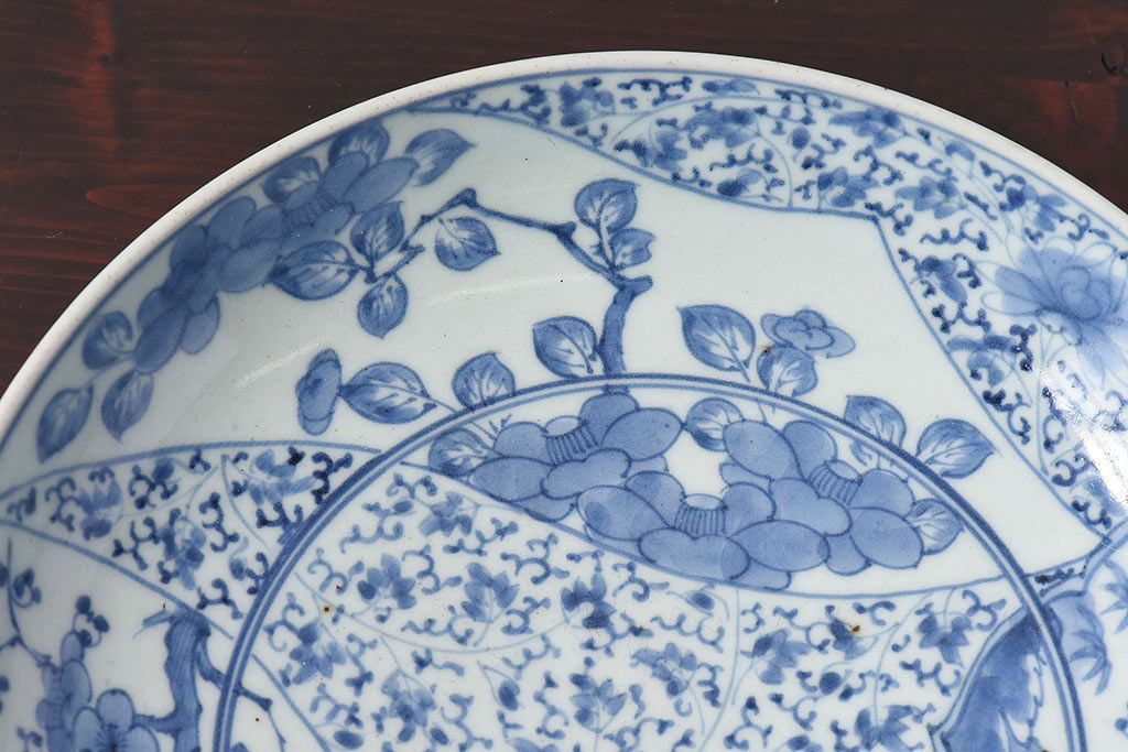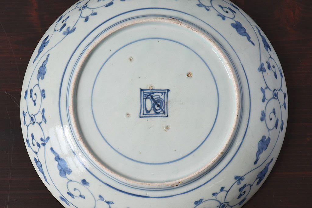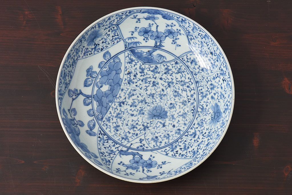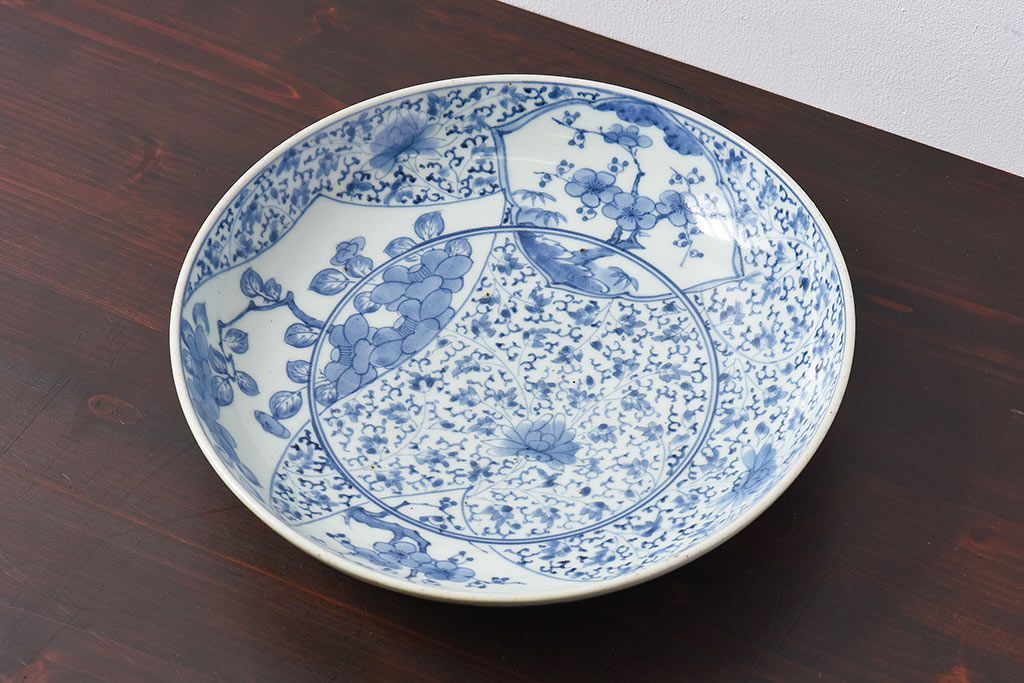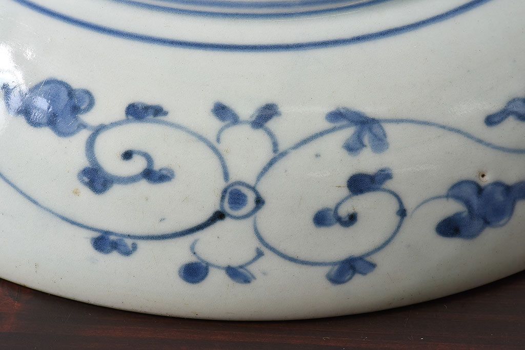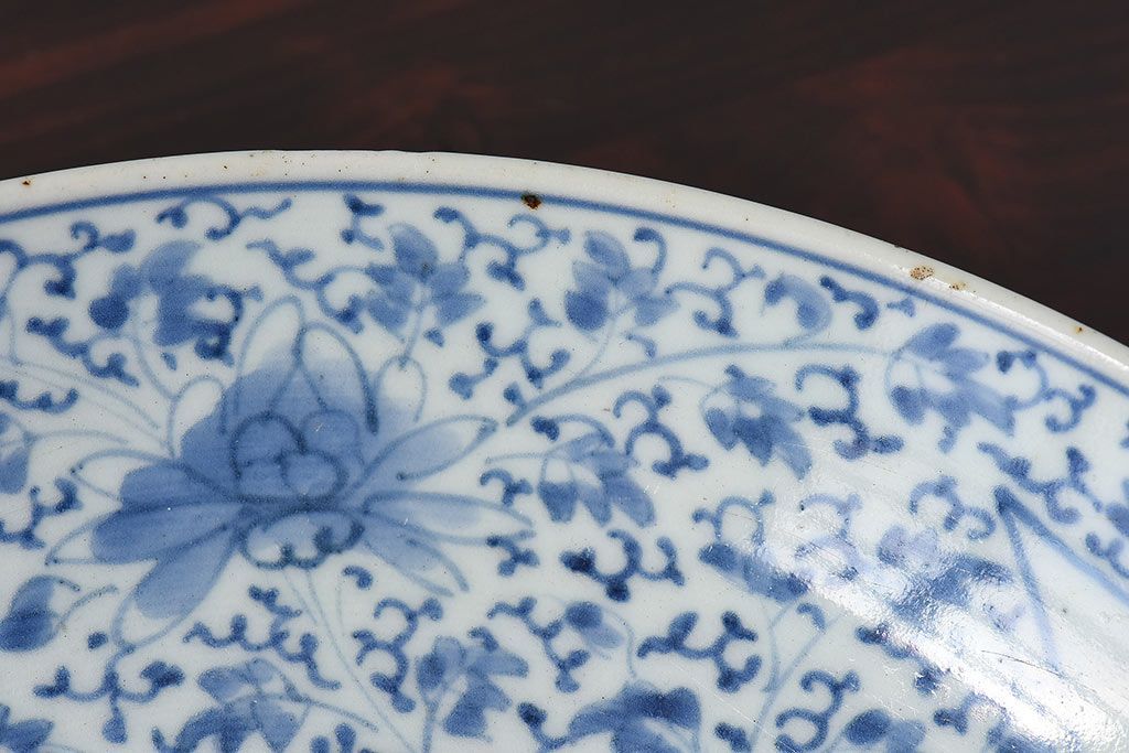 ラフジュ工房> 骨董・美術品> 骨董-陶磁器 > アンティーク雑貨 江戸期 古伊万里 花唐草文 染付 九寸深皿(渦福)