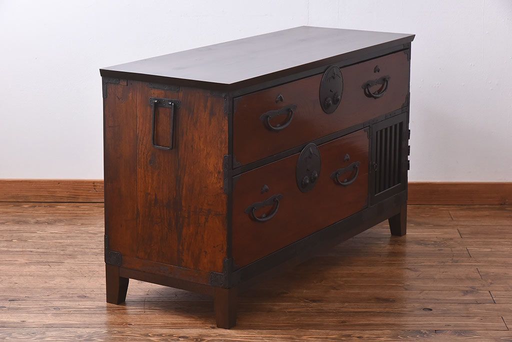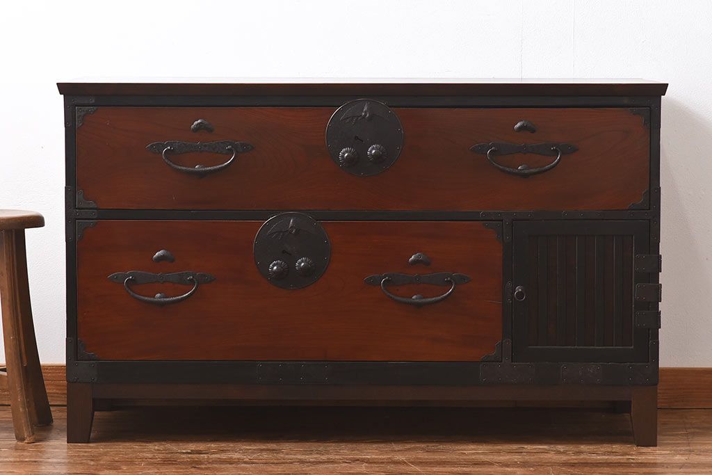アンティーク家具 和製アンティーク リメイク 前面ケヤキ材の脚付き二本松箪笥ローボード(和タンス、衣装箪笥)