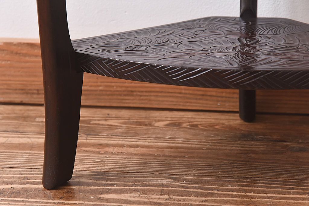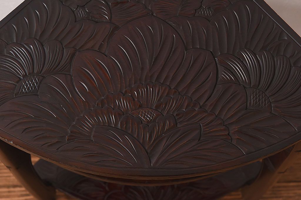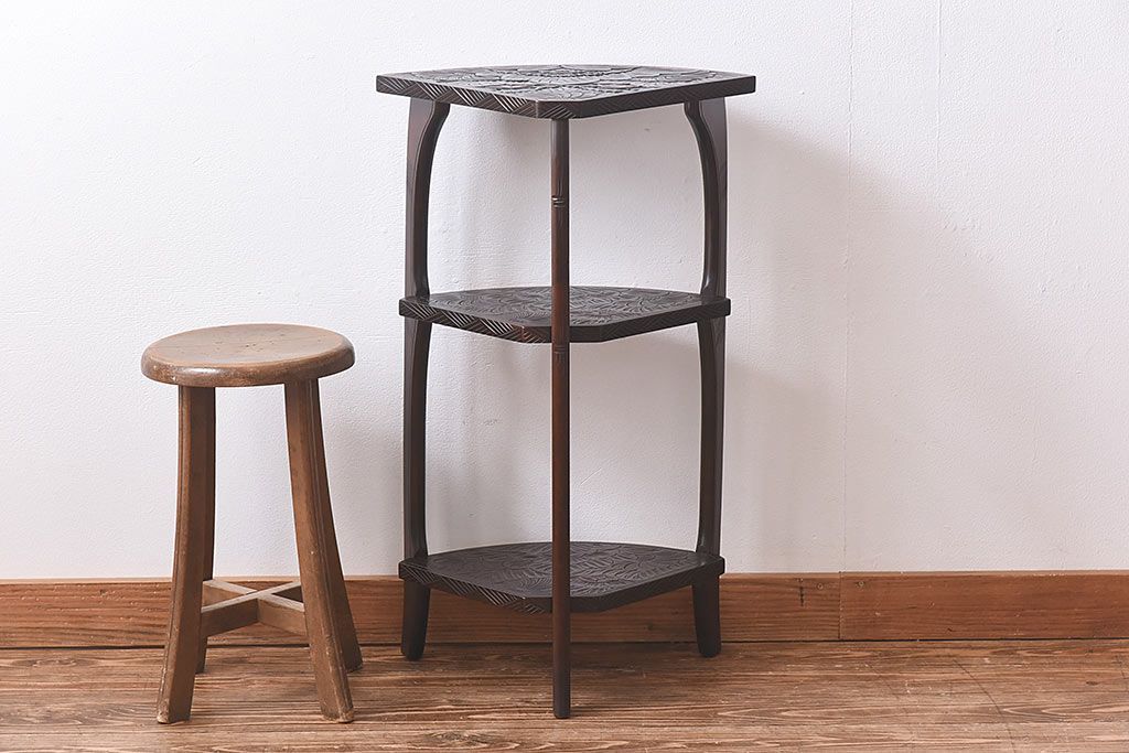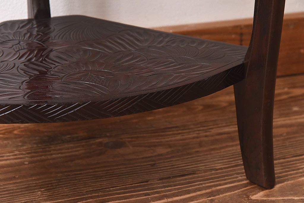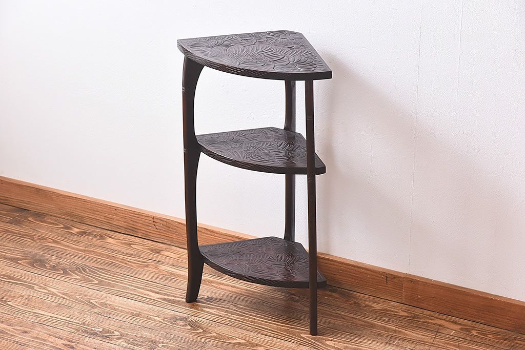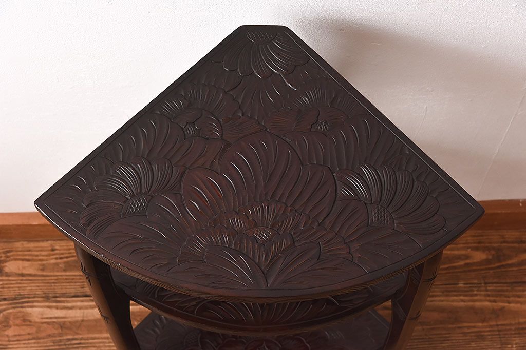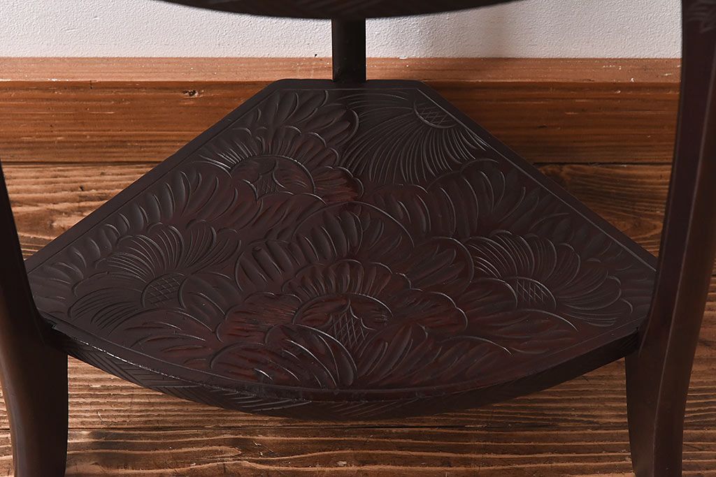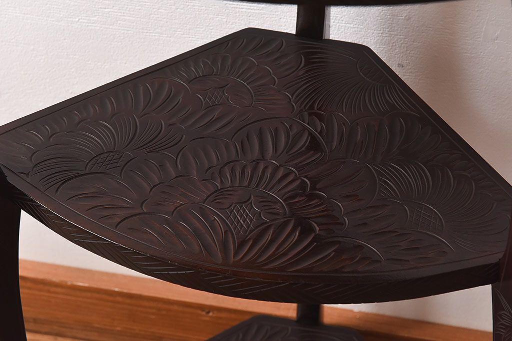 ラフジュ工房> テーブル> サイドテーブル > アンティーク雑貨 中古 伝統工芸 日光彫り 花の意匠が美しいコーナーラック(飾り台、花台)(1)