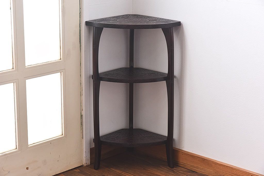 ラフジュ工房> オープンラック・シェルフ> コーナーラック > アンティーク雑貨 中古 伝統工芸 日光彫り 花の意匠が美しいコーナーラック(飾り台、花台)(1)