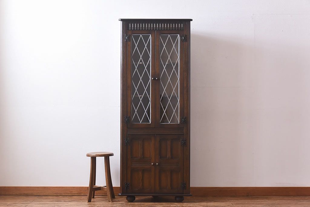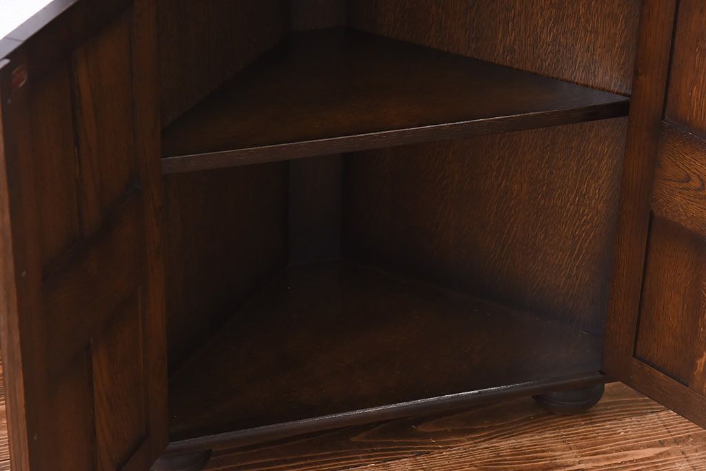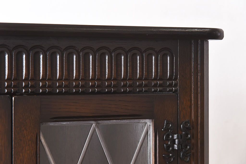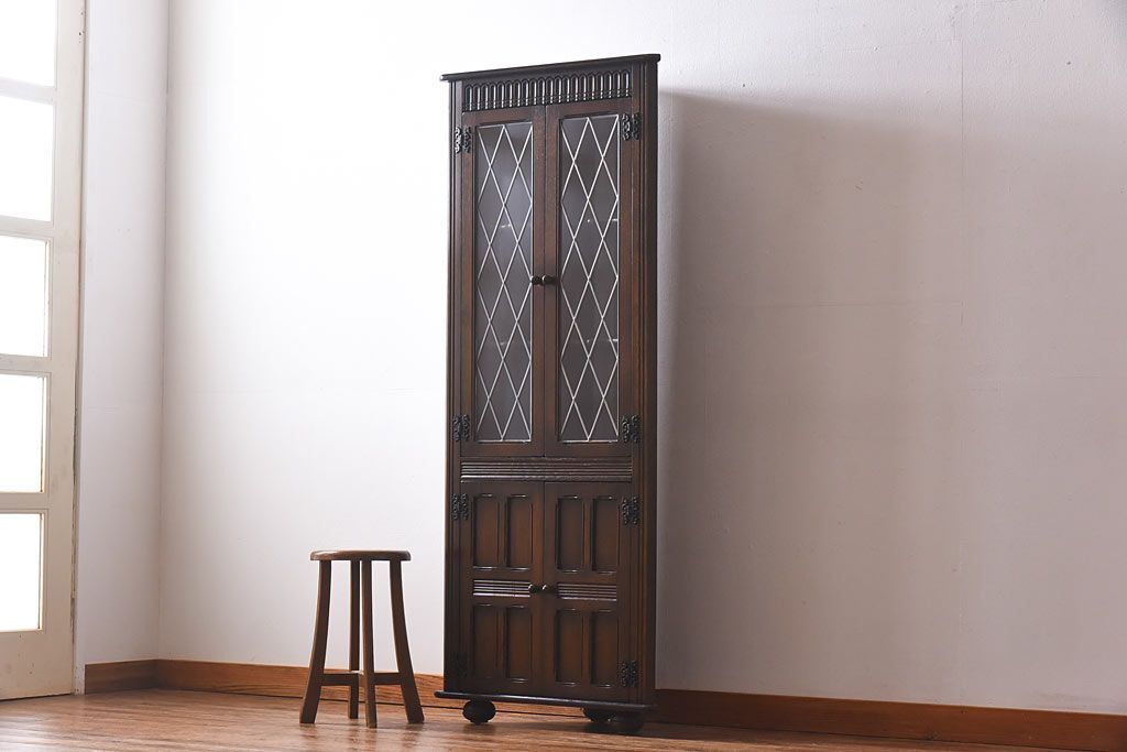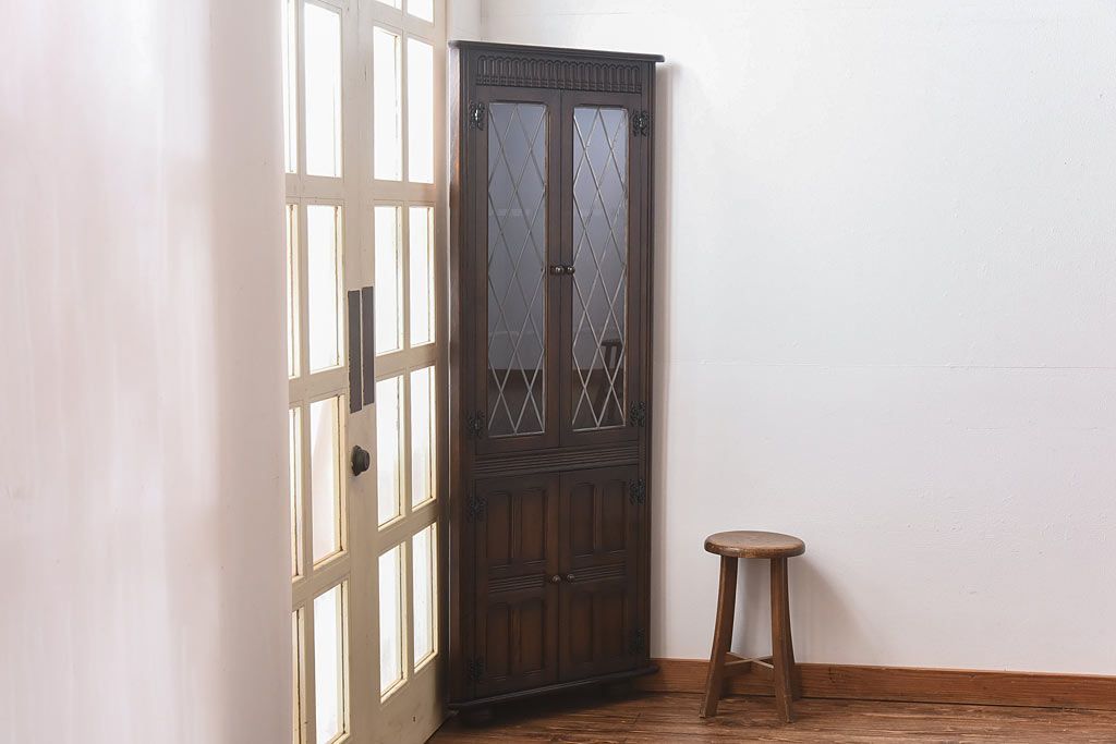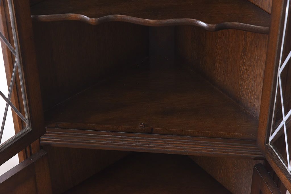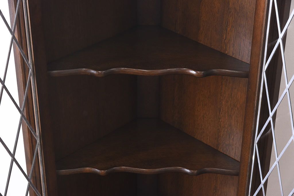 ヴィンテージ家具 イギリスビンテージ オーク材 ステンドグラスがシックなコーナーラック(飾り棚、収納棚)