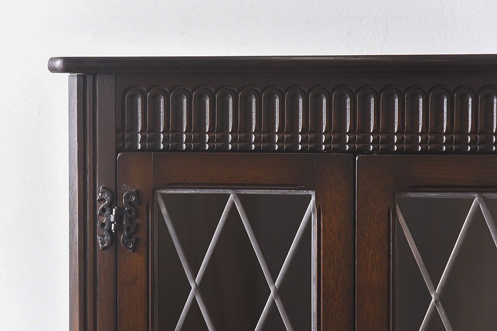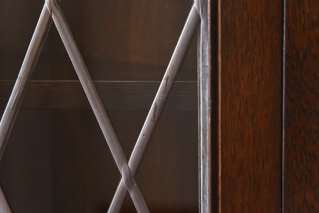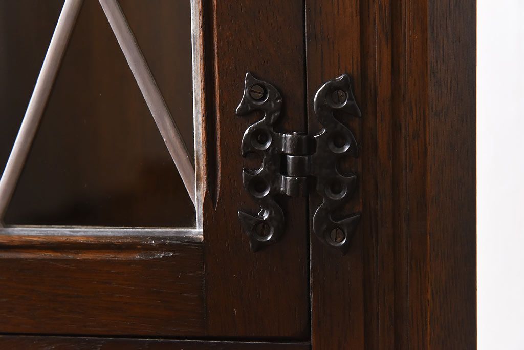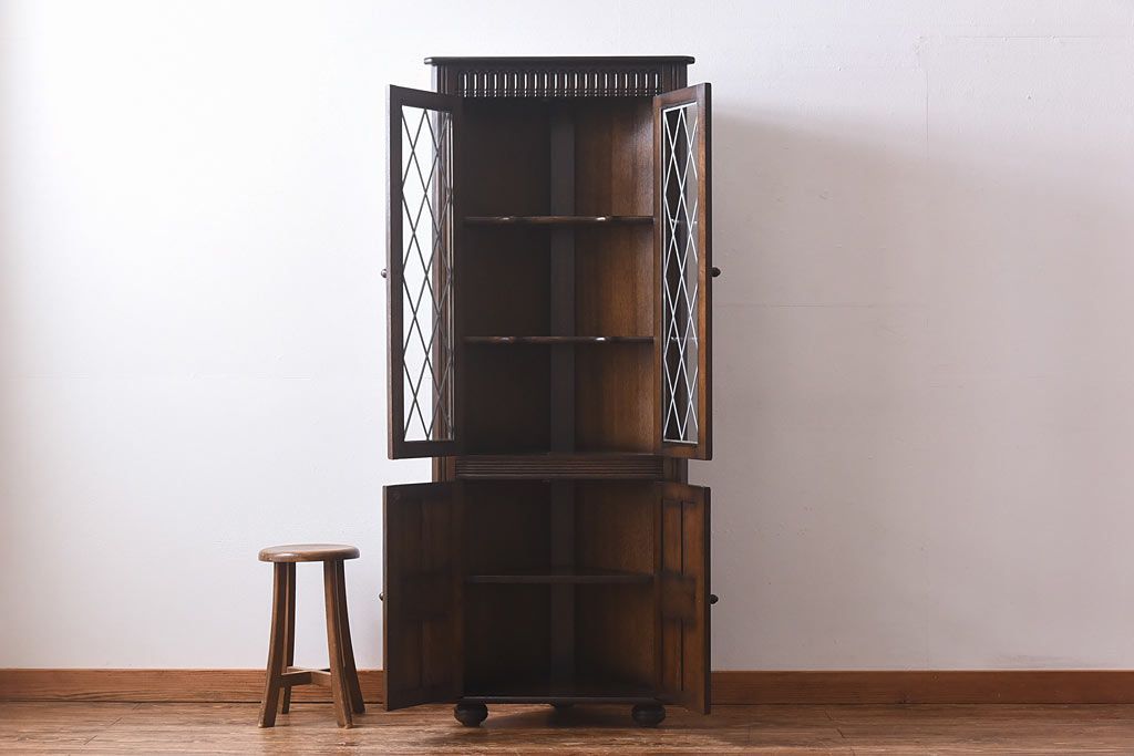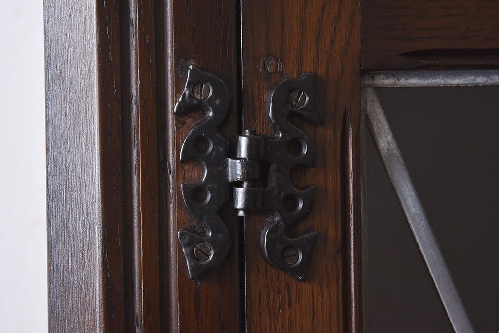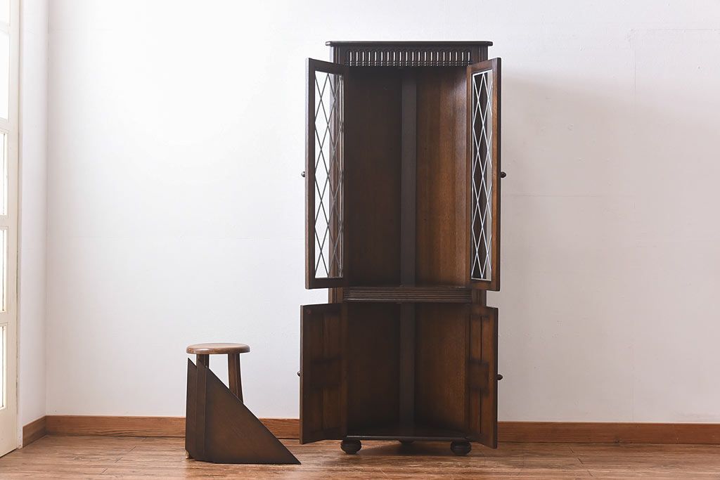 ラフジュ工房> オープンラック・シェルフ> コーナーラック > ヴィンテージ家具 イギリスビンテージ オーク材 ステンドグラスがシックなコーナーラック(飾り棚、収納棚)