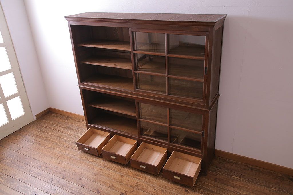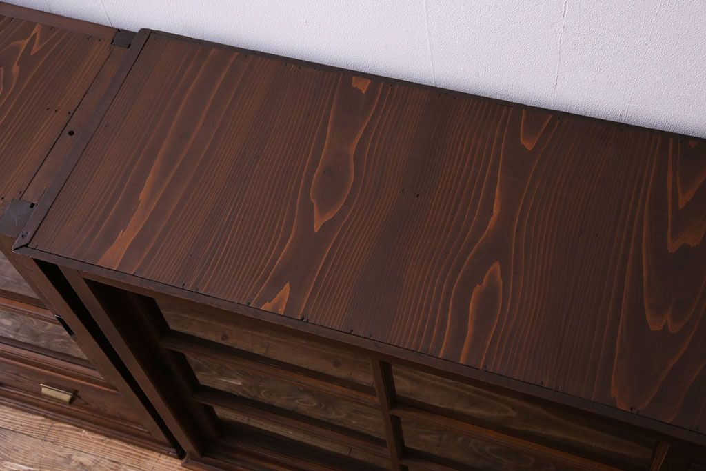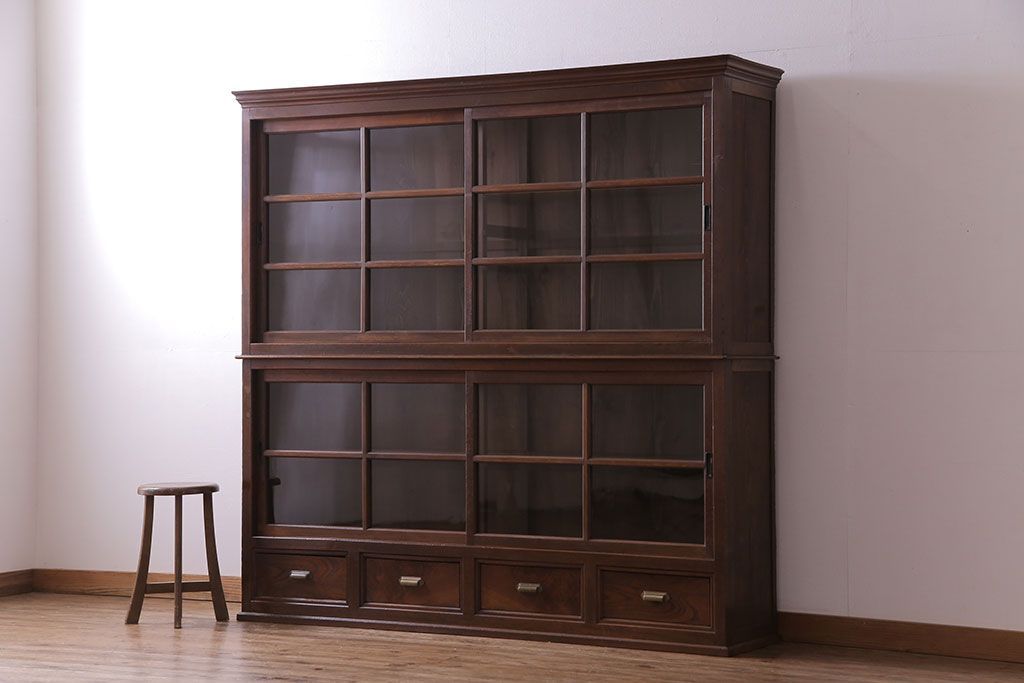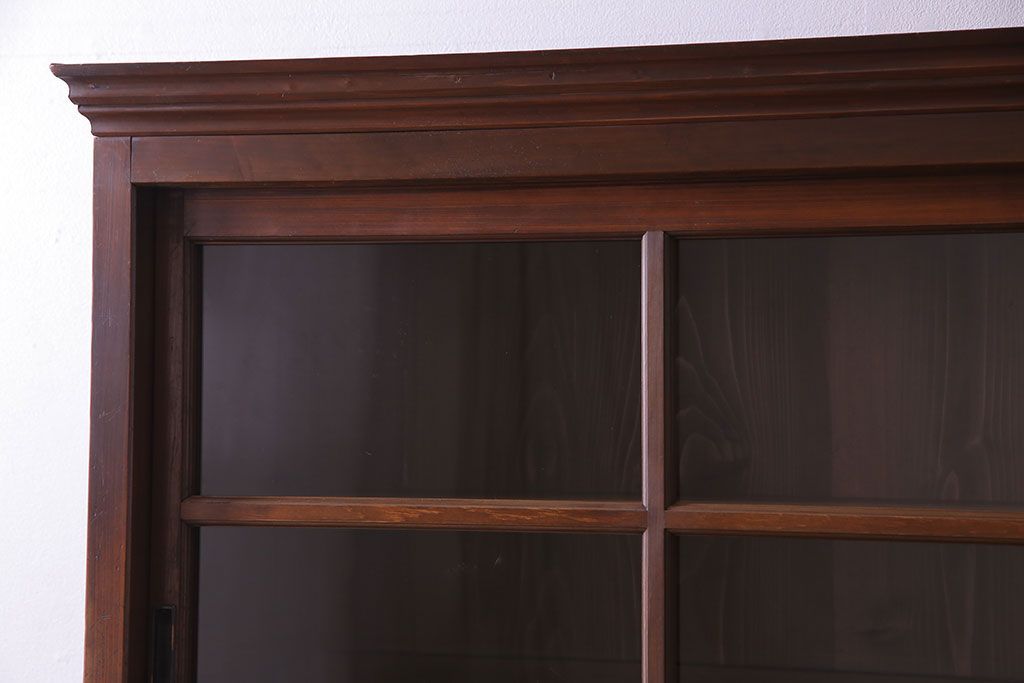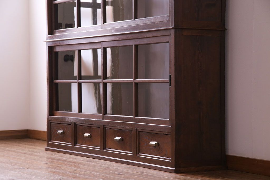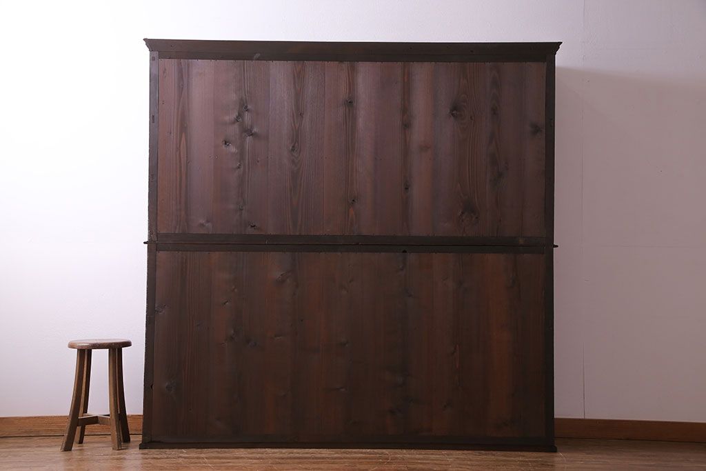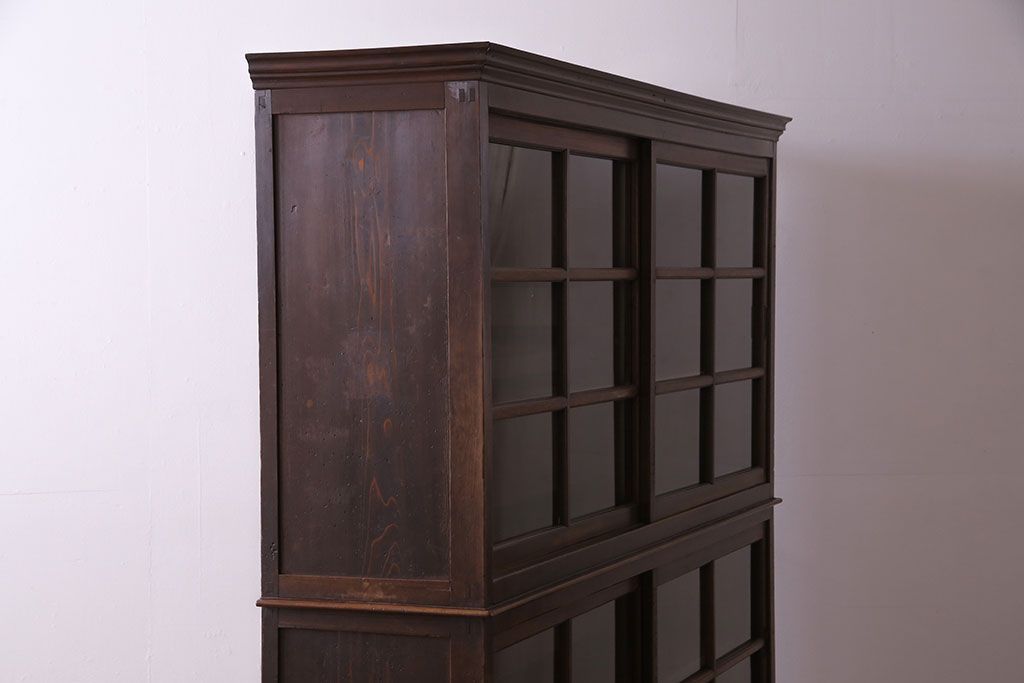 和製アンティーク 堂々とした佇まいの二段重ねガラス戸棚(収納棚、食器棚、飾り棚、ショーケース)です。