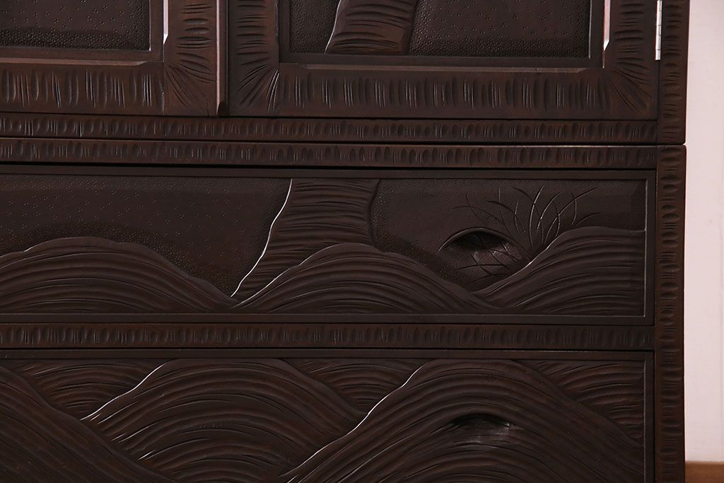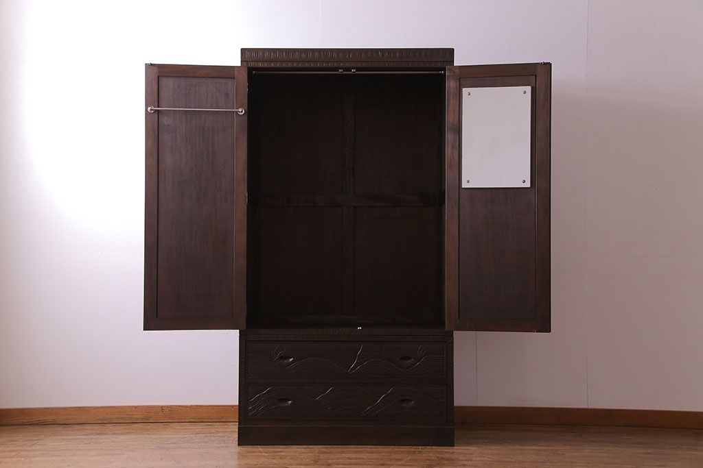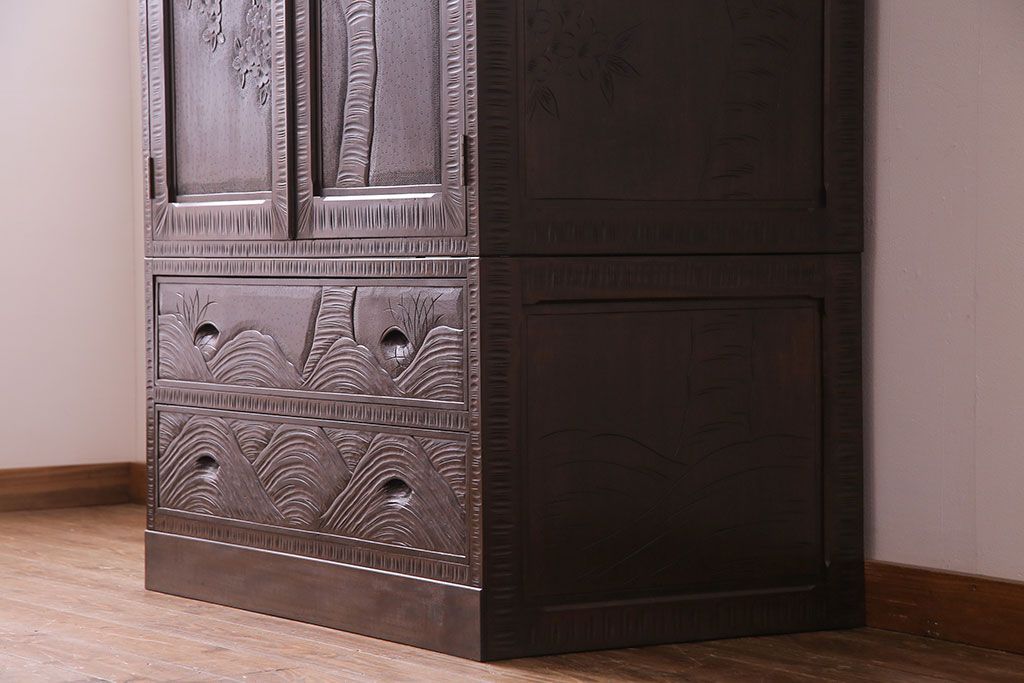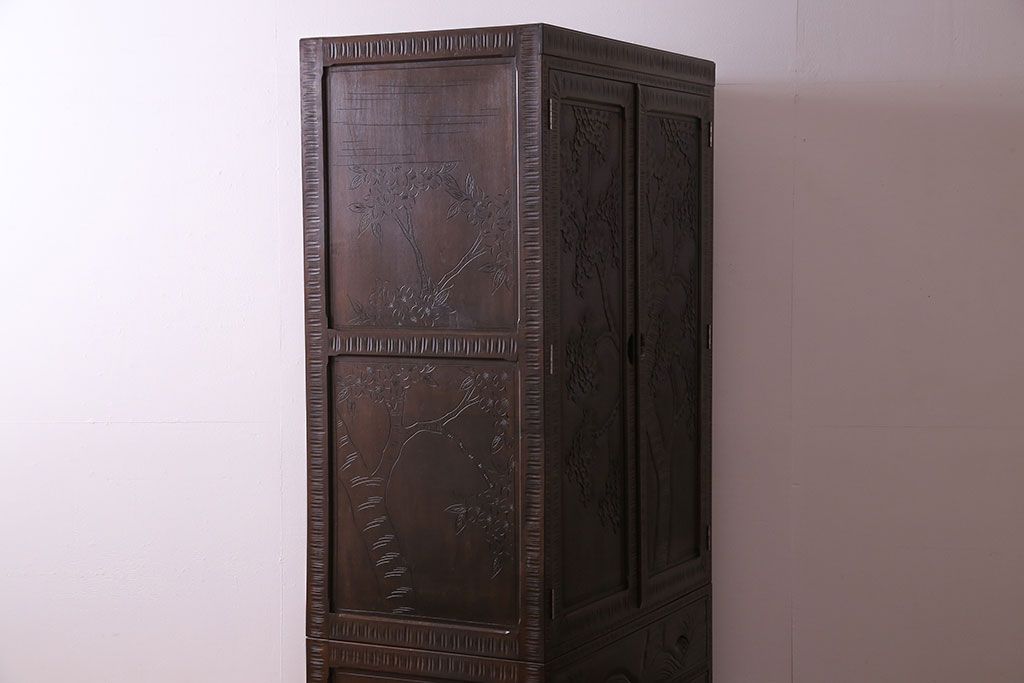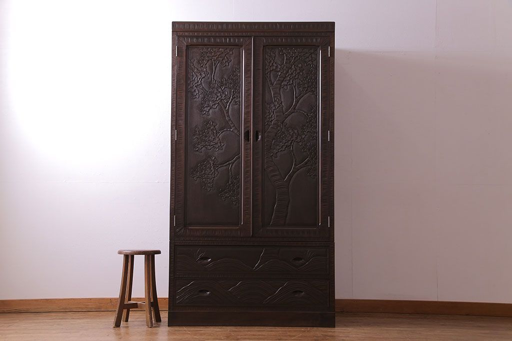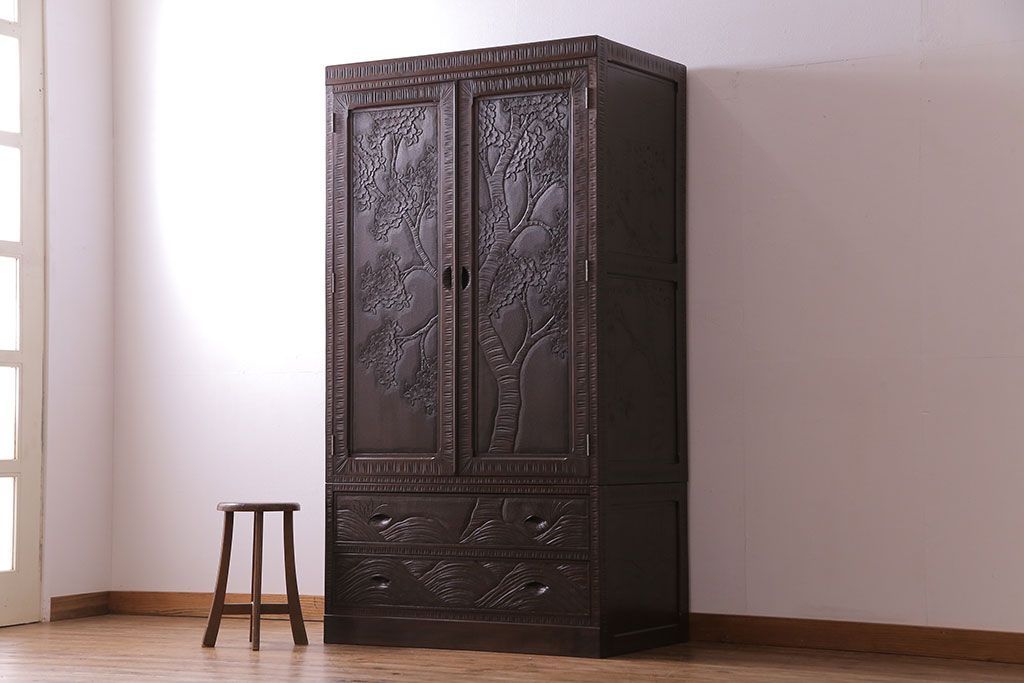 中古 伝統工芸 軽井沢彫り 迫力のある意匠が魅力のワードローブ(洋服タンス)
