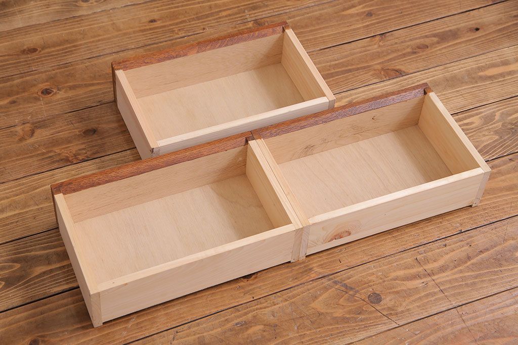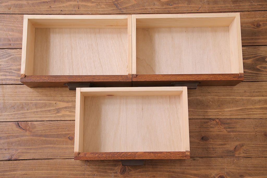 - 黒みを帯びた木目が落ち着いた雰囲気で、素朴な木の風合いを楽しめます。新しく引き出しを取り付けリメイクした後、元からある天板の良さを損なわないよう、丁寧に仕上げを行いました。