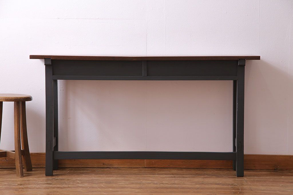 味わいのある木味のブナ材をベースに天板には丈夫なナラ材を使用した昭和レトロな平机です。当店で引き出しを付け、ペイントを施したリメイク品です。リビングに置いてお子様の勉強スペースとしたり、キッチンのカウンターテーブルにしたりと様々なシーンで活躍しますよ。圧迫感を感じにくい薄型のデザインです。どこか懐かしい雰囲気が漂う温かな空間づくりにいかがでしょうか。