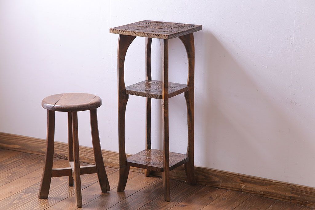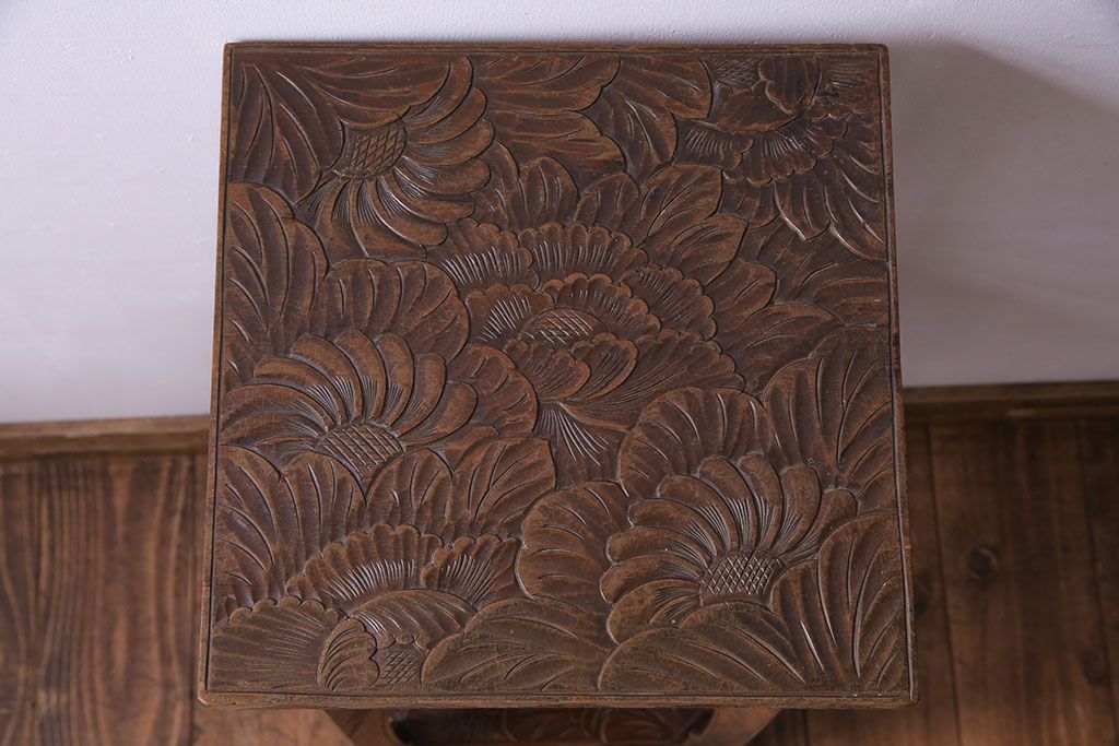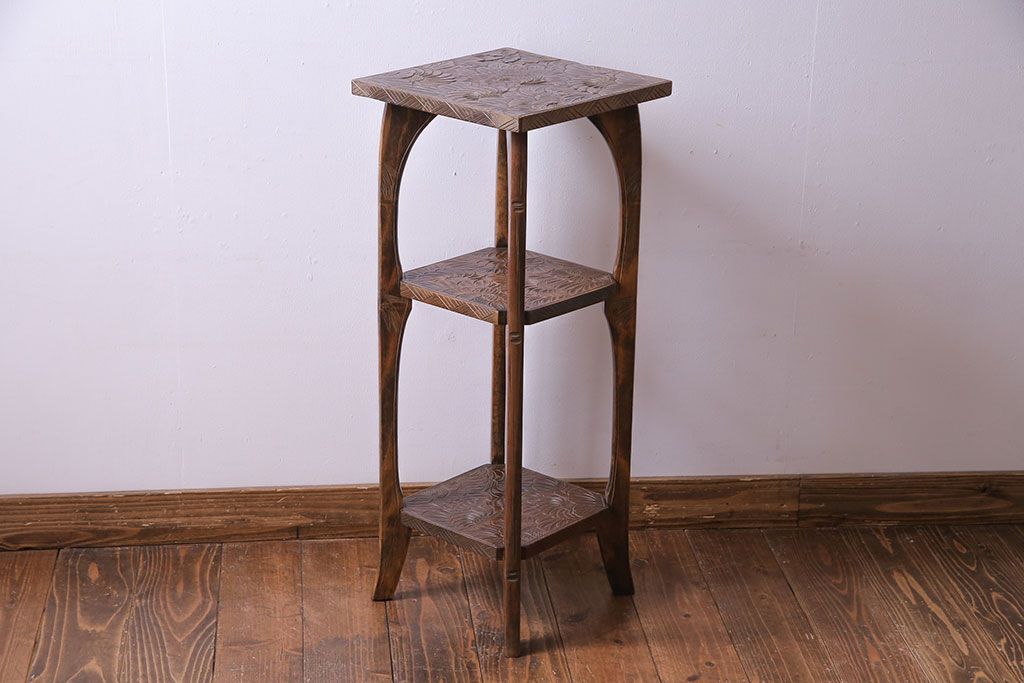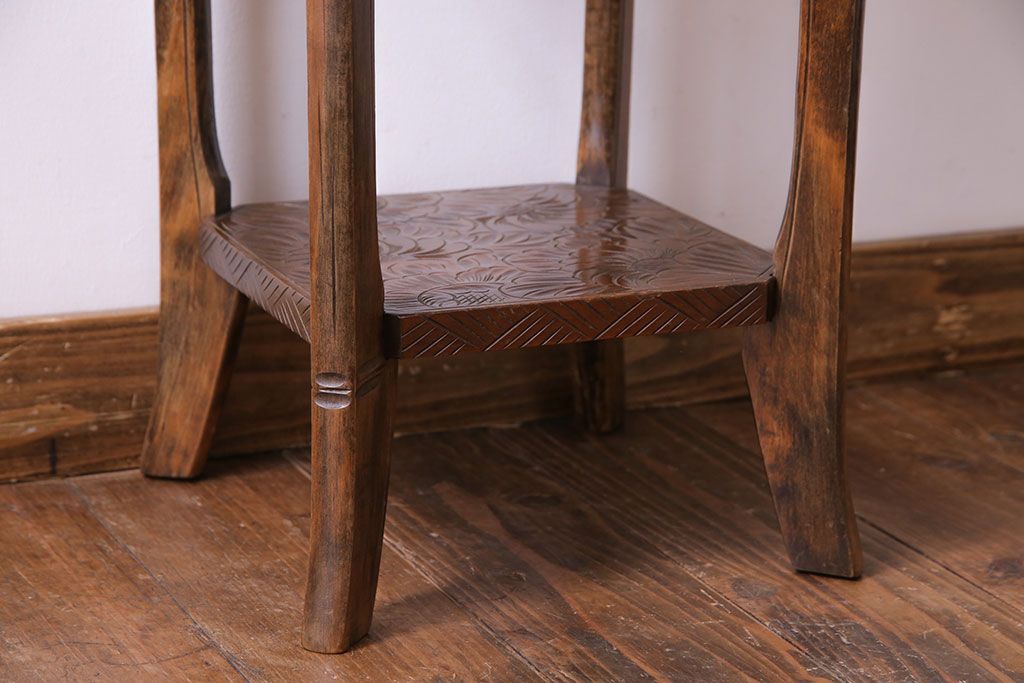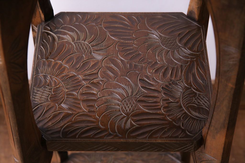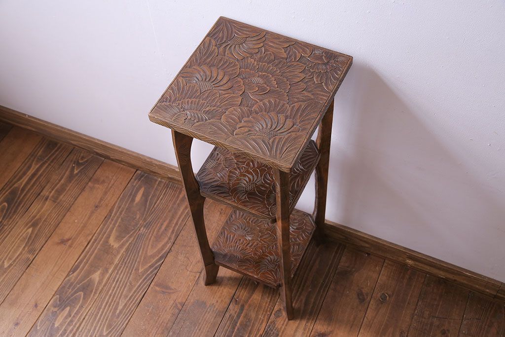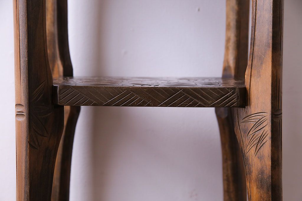 アンティーク雑貨 中古 伝統工芸 日光彫り 大胆な花の彫りが魅力的な飾り棚(花台)