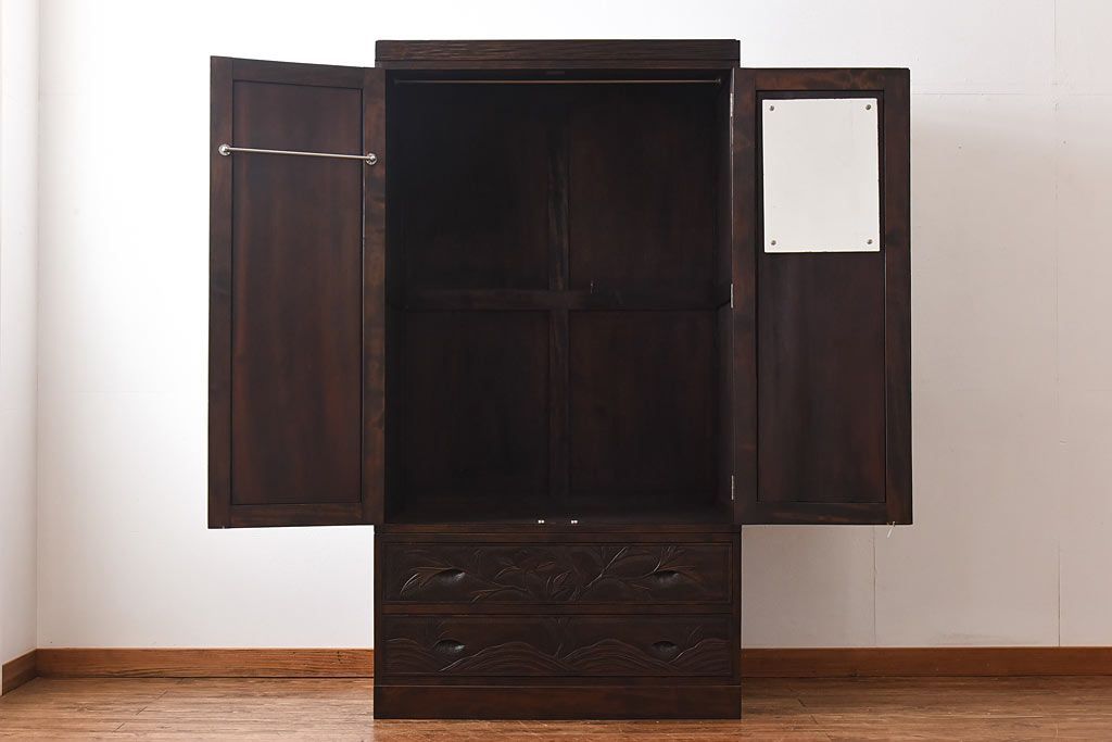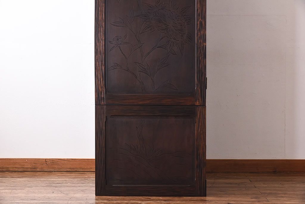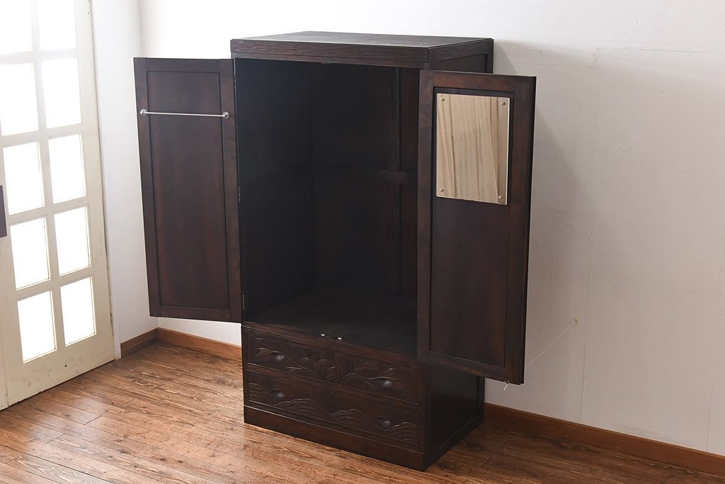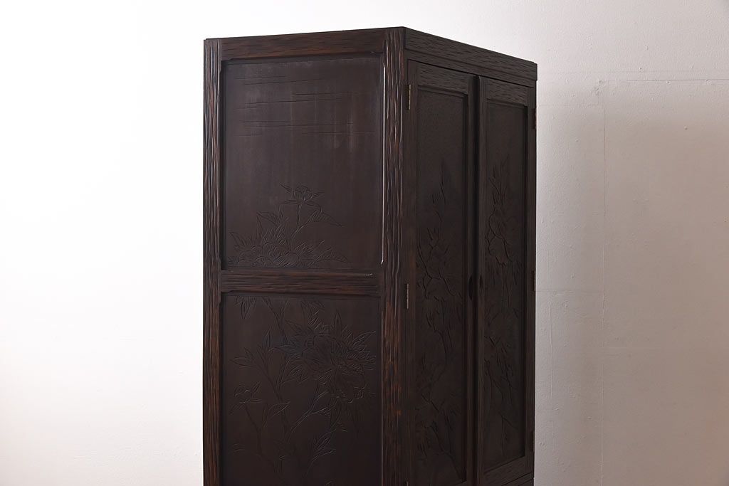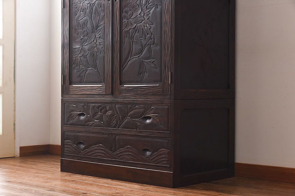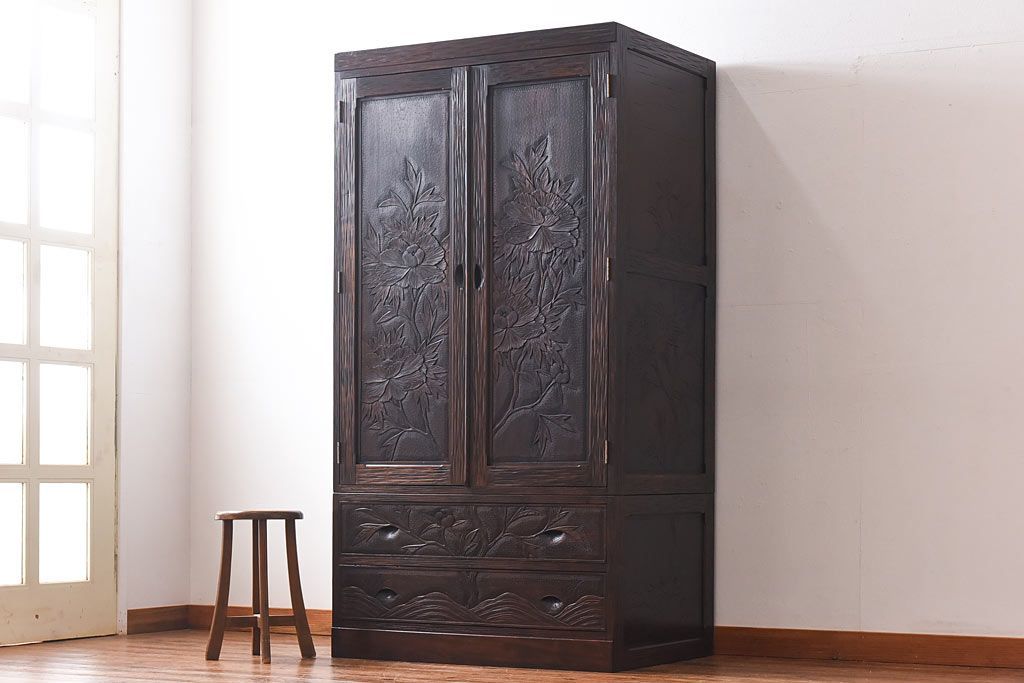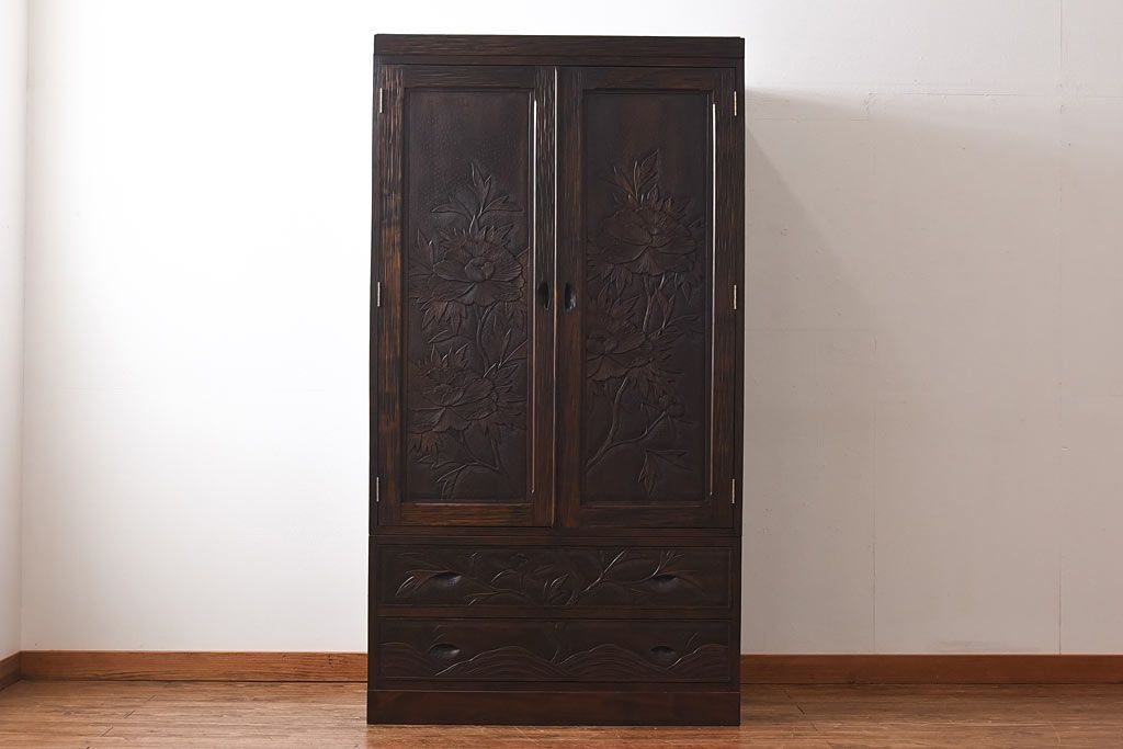 中古 伝統工芸 軽井沢彫り 牡丹の意匠が目を引くワードローブ(洋服タンス)