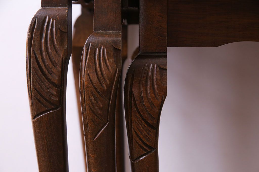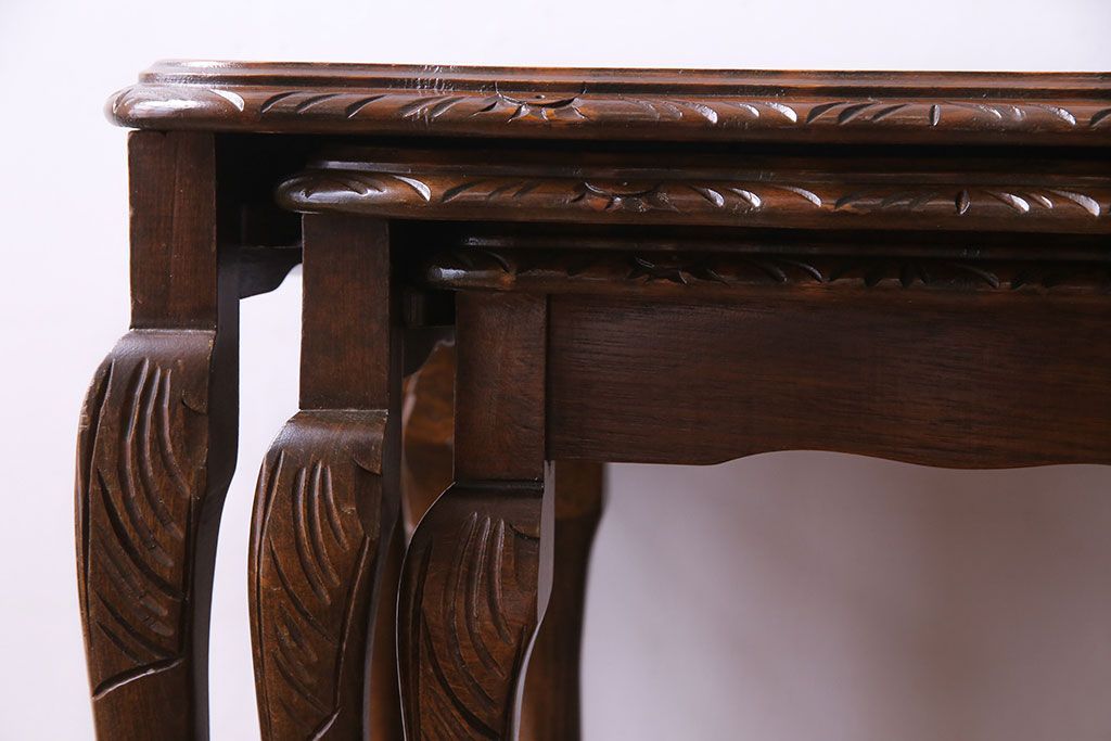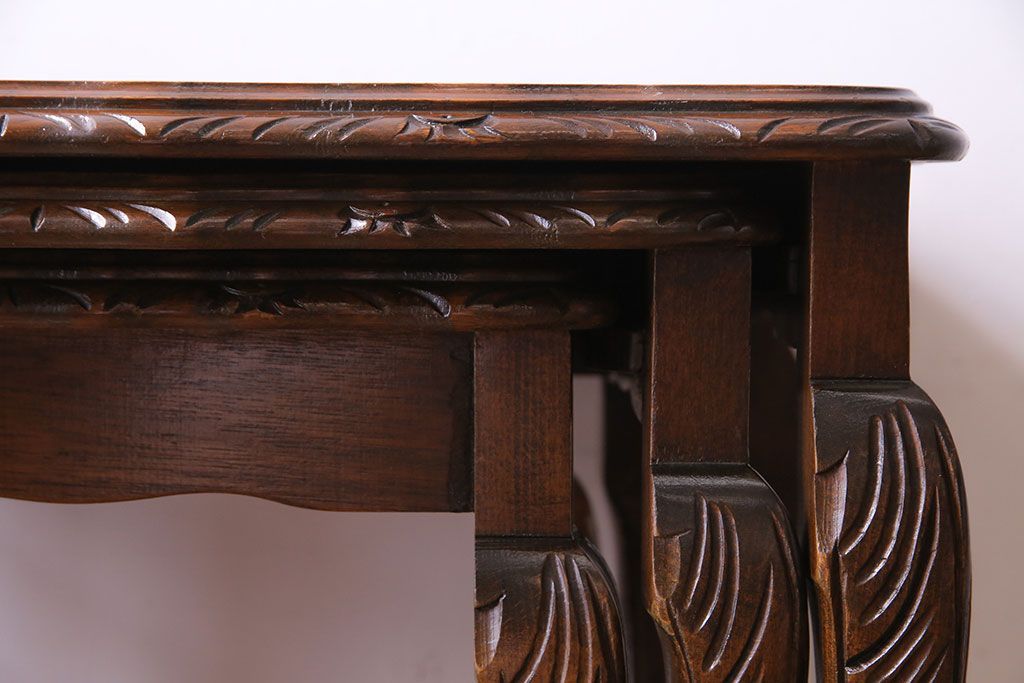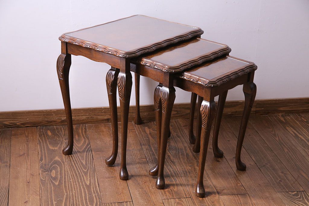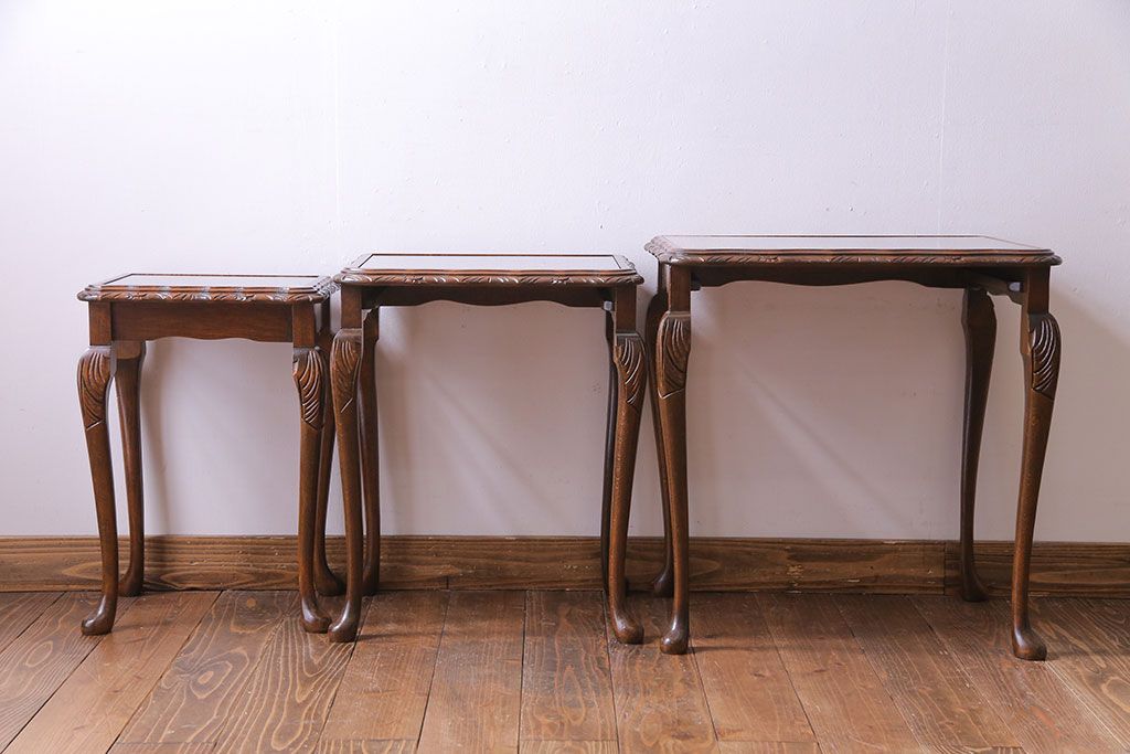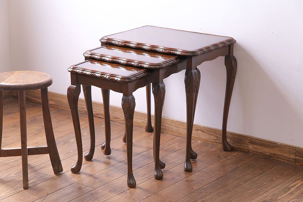 ラフジュ工房> テーブル> ネストテーブル > アンティーク雑貨 イギリスビンテージ 流れるような曲線の猫脚が美しいネストテーブル(サイドテーブル、カフェテーブル、花台)