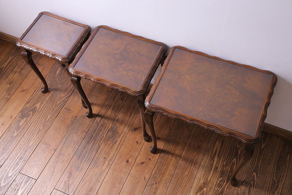 アンティーク雑貨 イギリスビンテージ 流れるような曲線の猫脚が美しいネストテーブル(サイドテーブル、カフェテーブル、花台)