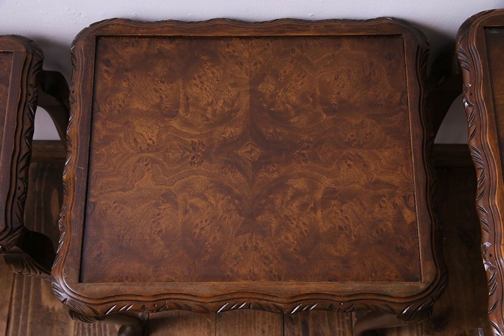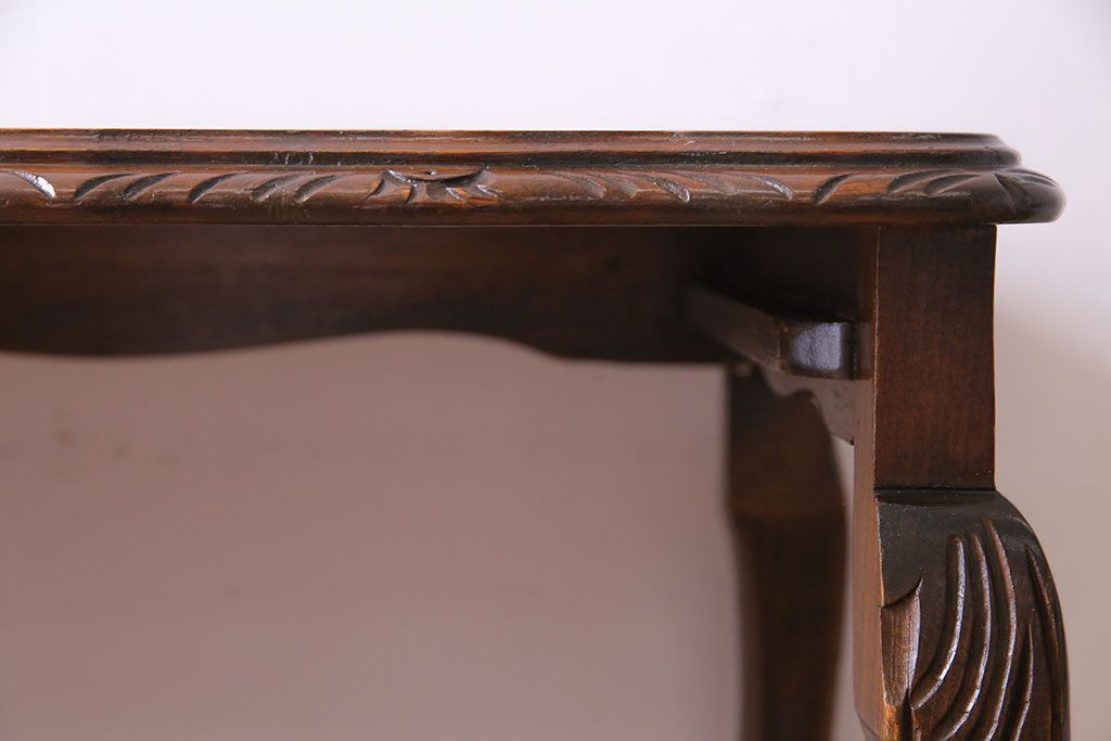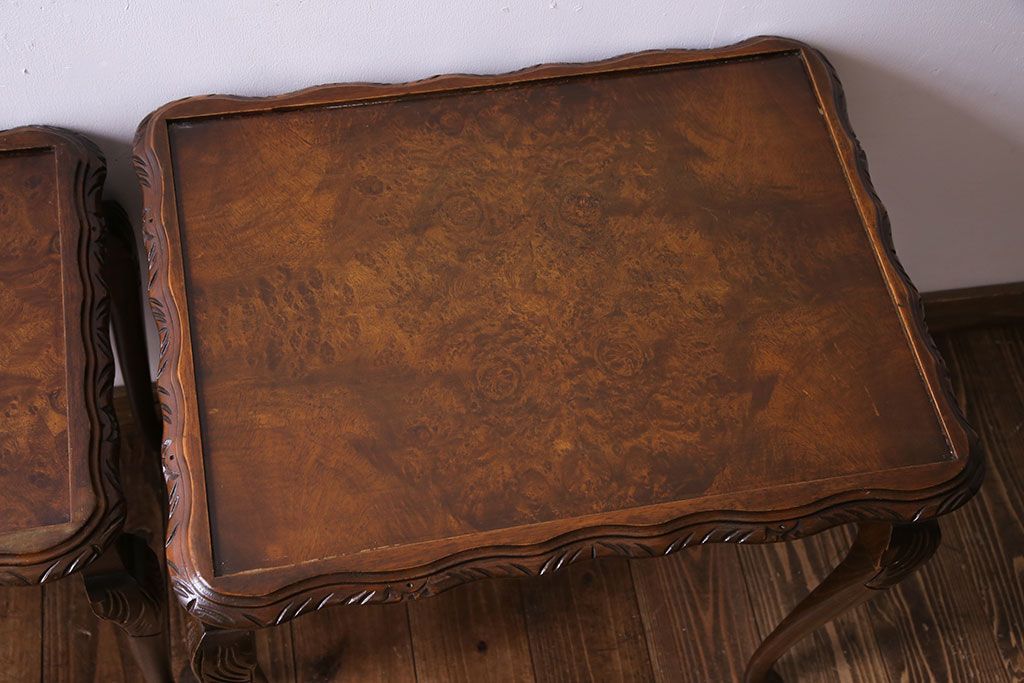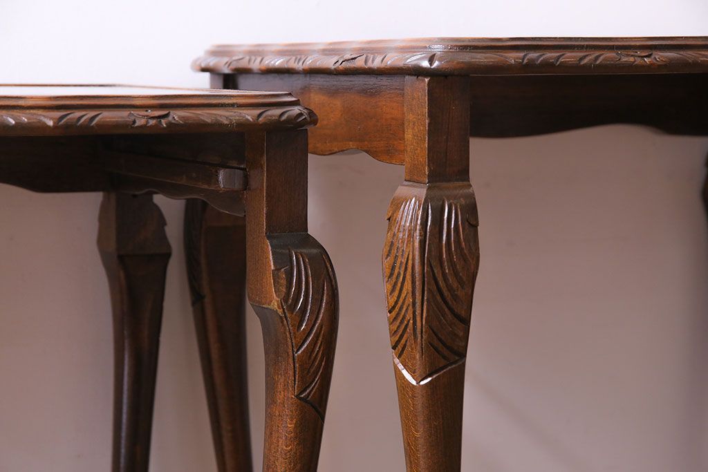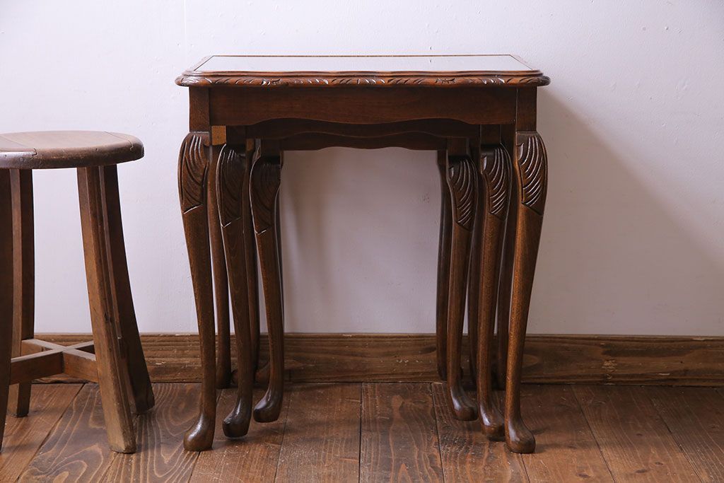ラフジュ工房> テーブル> カフェテーブル・コーヒーテーブル > アンティーク雑貨 イギリスビンテージ 流れるような曲線の猫脚が美しいネストテーブル(サイドテーブル、カフェテーブル、花台)