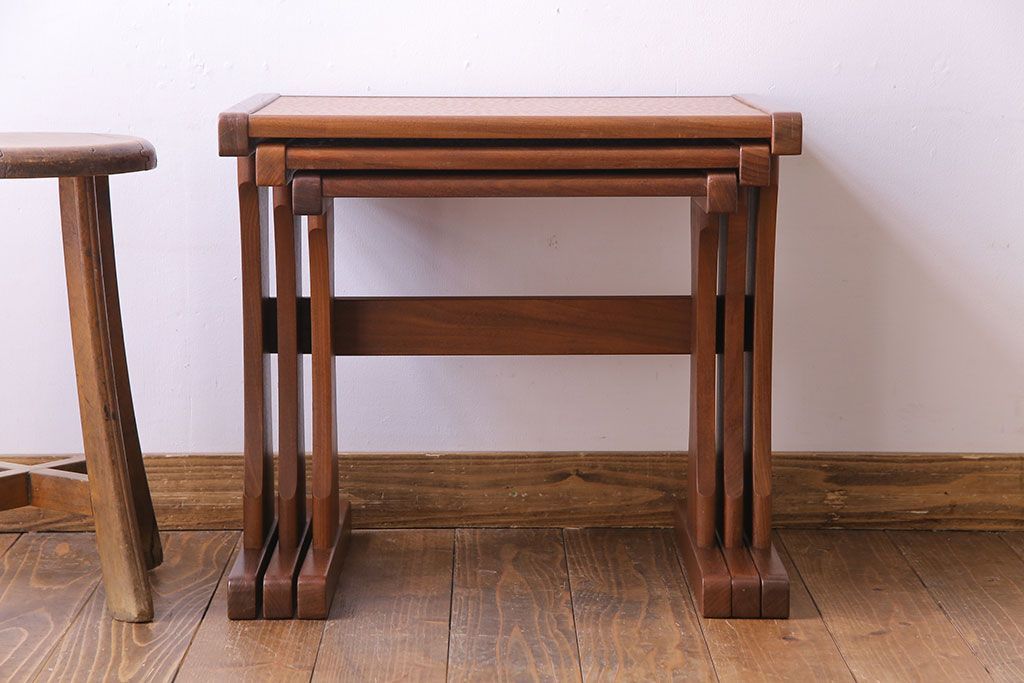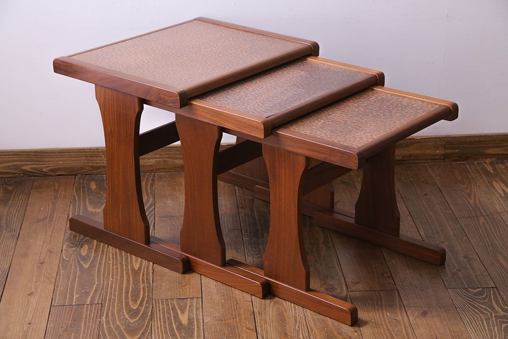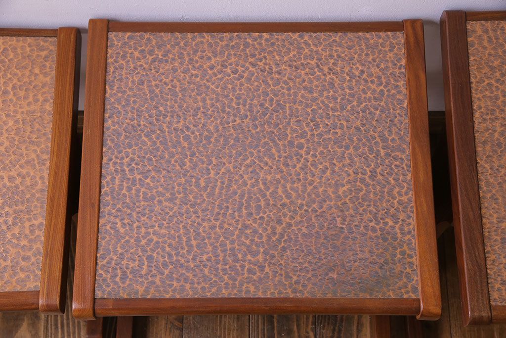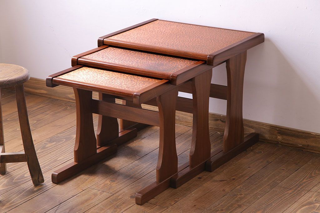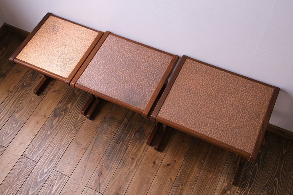 ラフジュ工房> テーブル> ネストテーブル > アンティーク雑貨 イギリスビンテージ チーク材 銅製の天板が個性的なネストテーブル(サイドテーブル、カフェテーブル、花台)