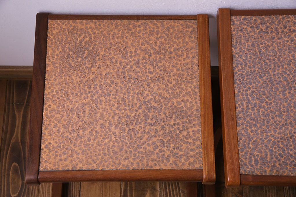 アンティーク雑貨 イギリスビンテージ チーク材 銅製の天板が個性的なネストテーブル(サイドテーブル、カフェテーブル、花台)