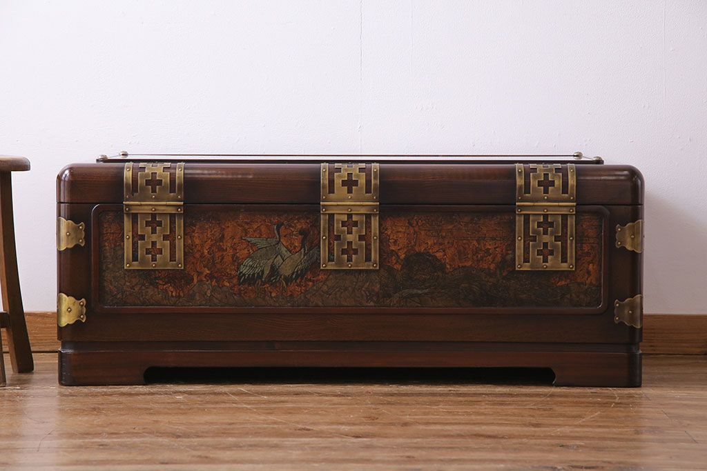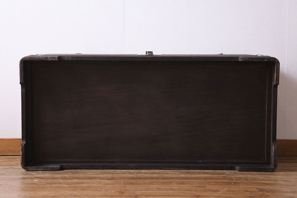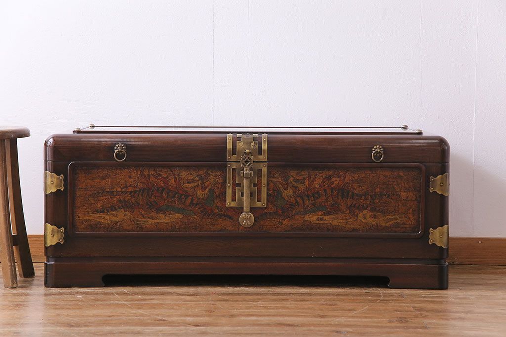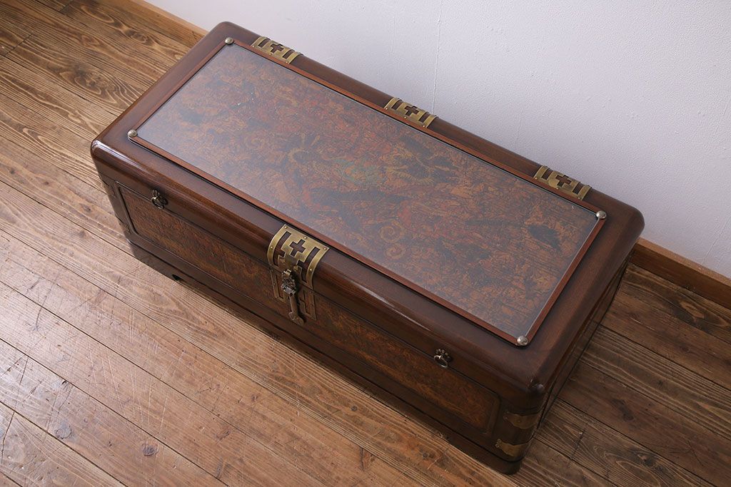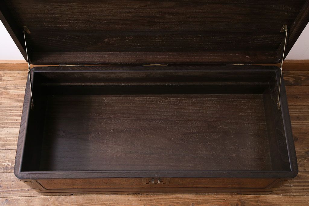 中古 海外製 ニレ材 重厚な佇まいが目を引くトランクケース(衣装箱、銭箱、センターテーブル)(定価約20万円)です。