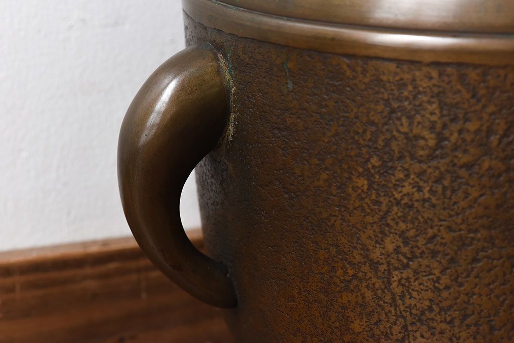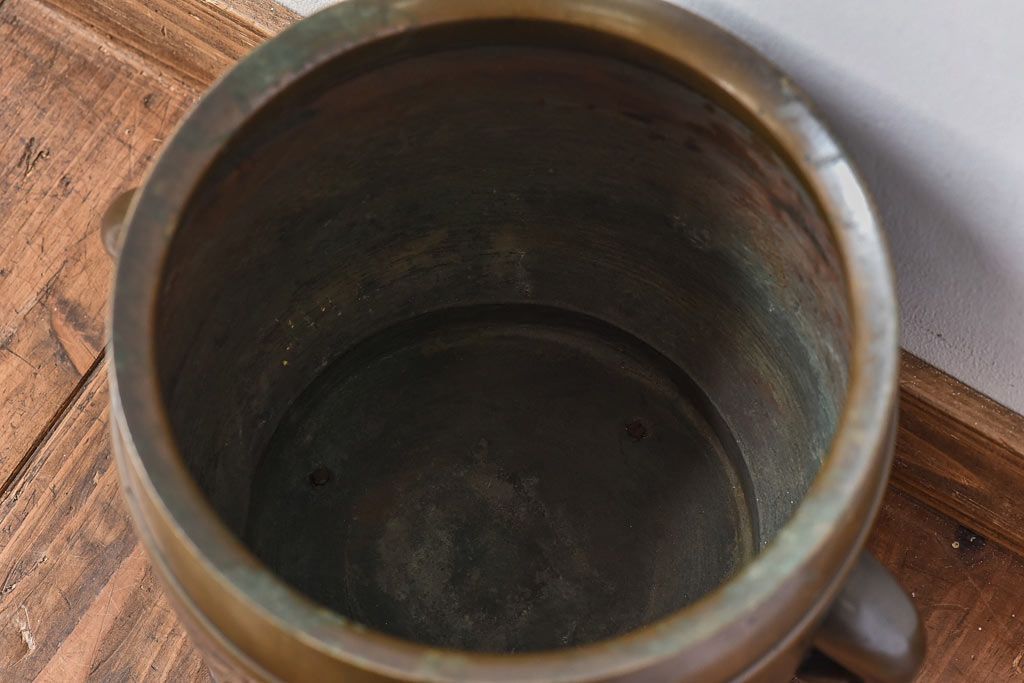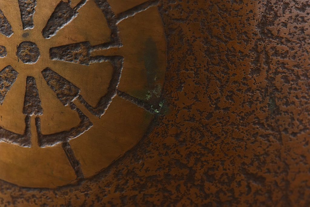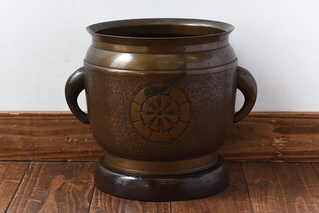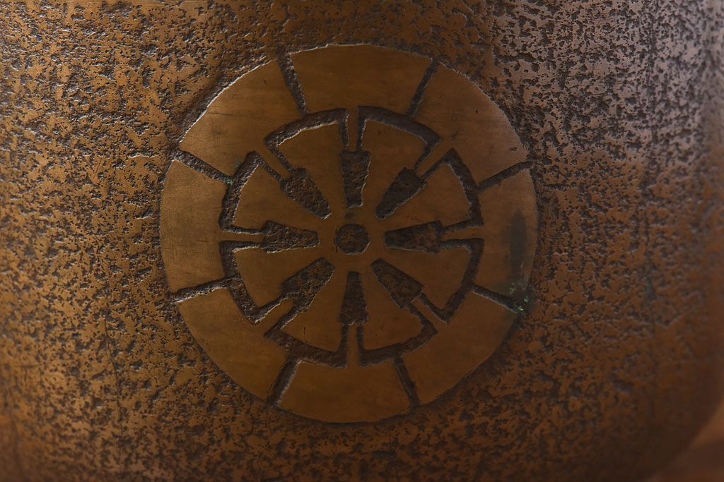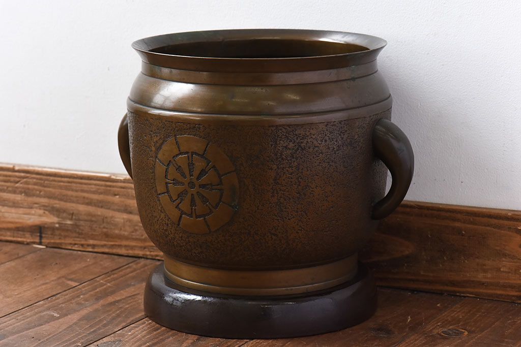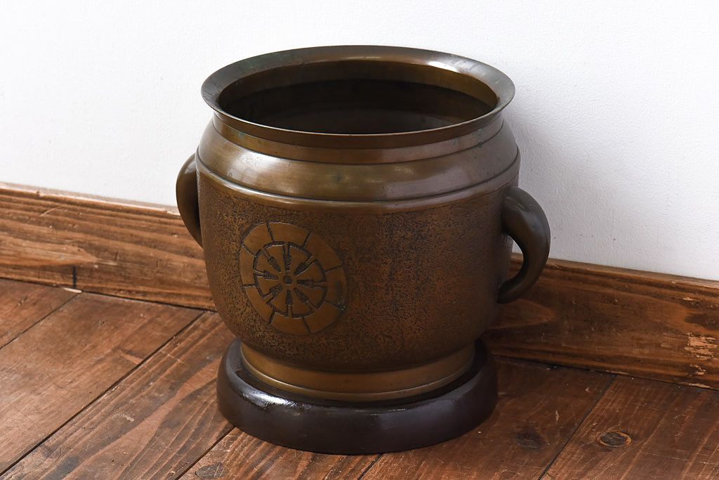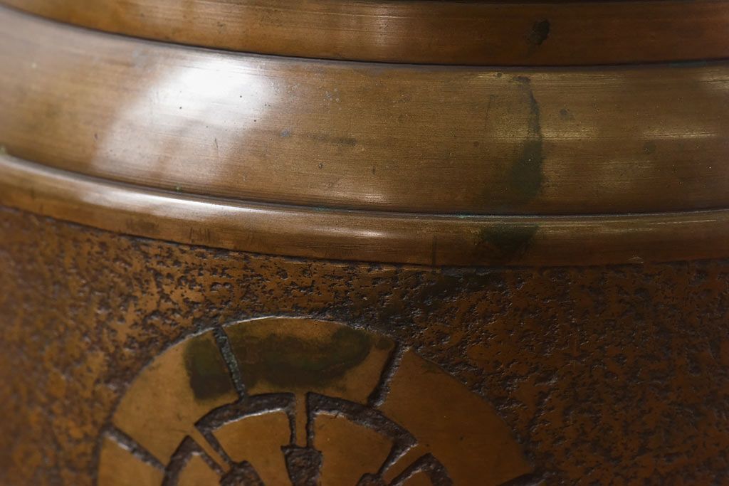 火鉢> 金属火鉢 > アンティーク雑貨 和製アンティーク 上手物 紋入りで風格のある耳付銅火鉢(鉢カバー)(1)