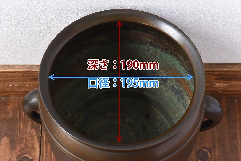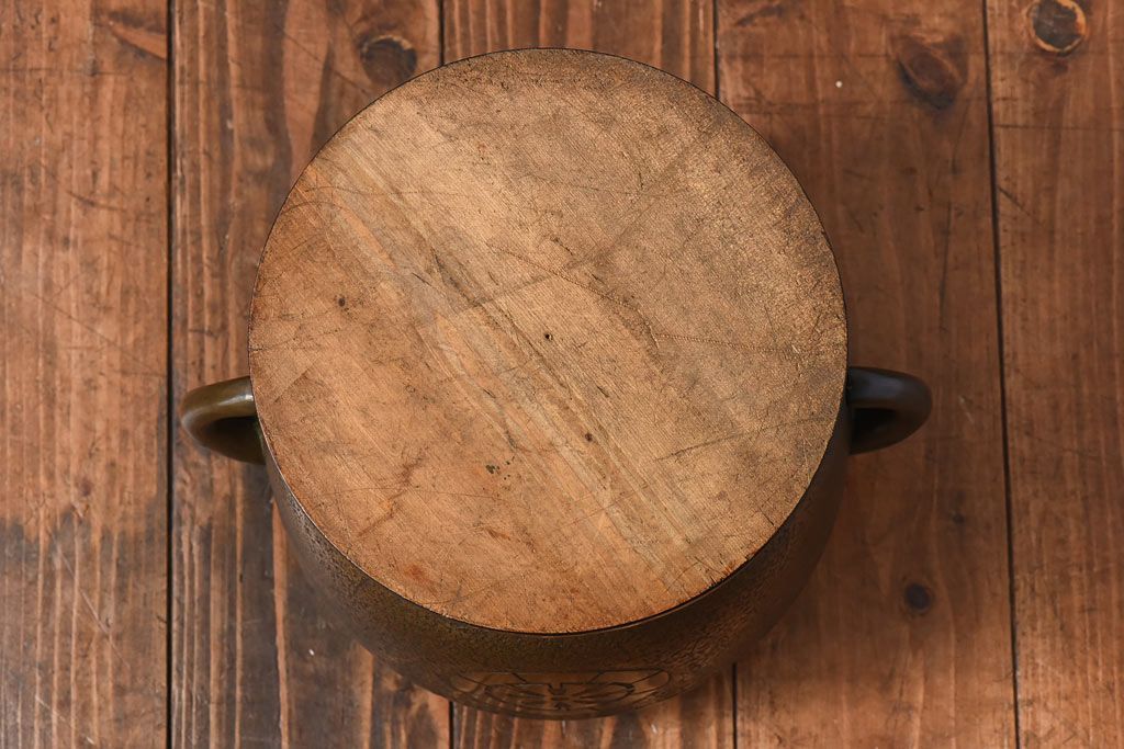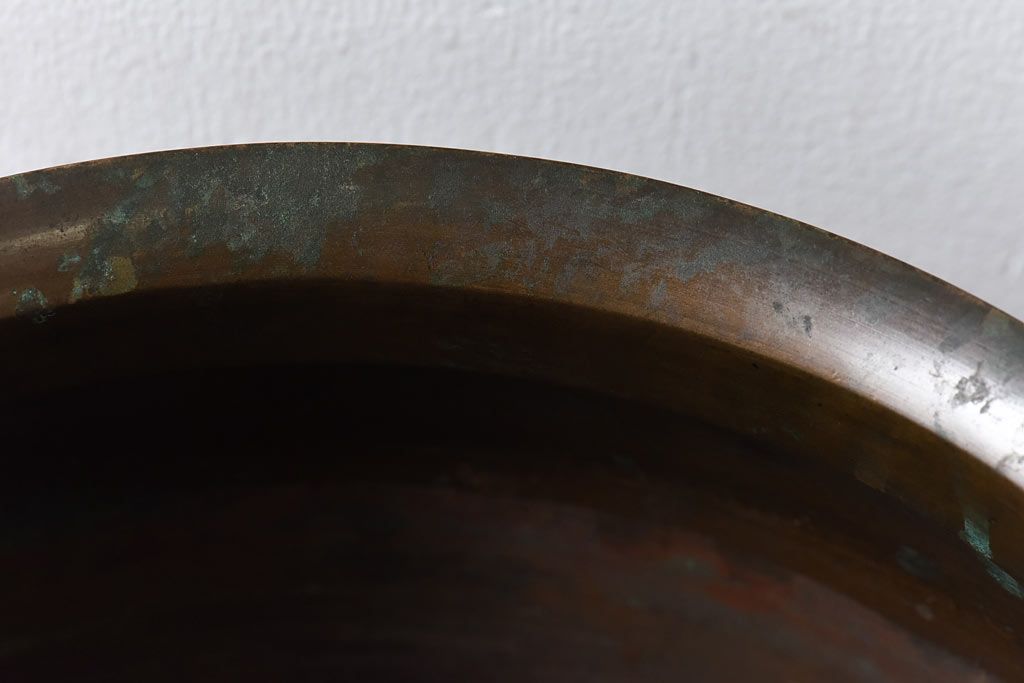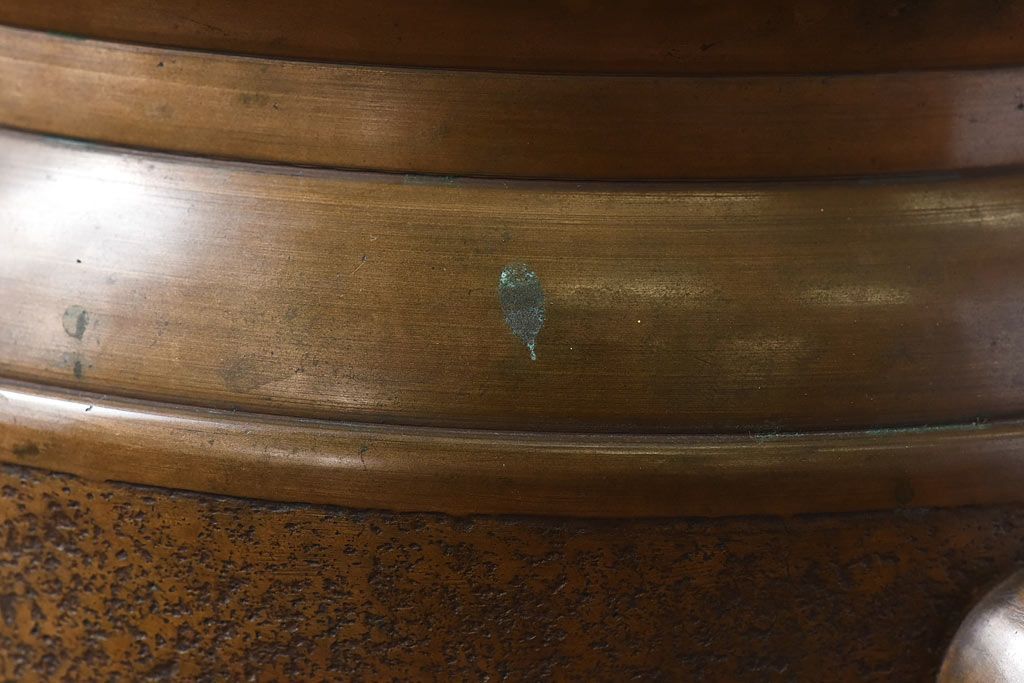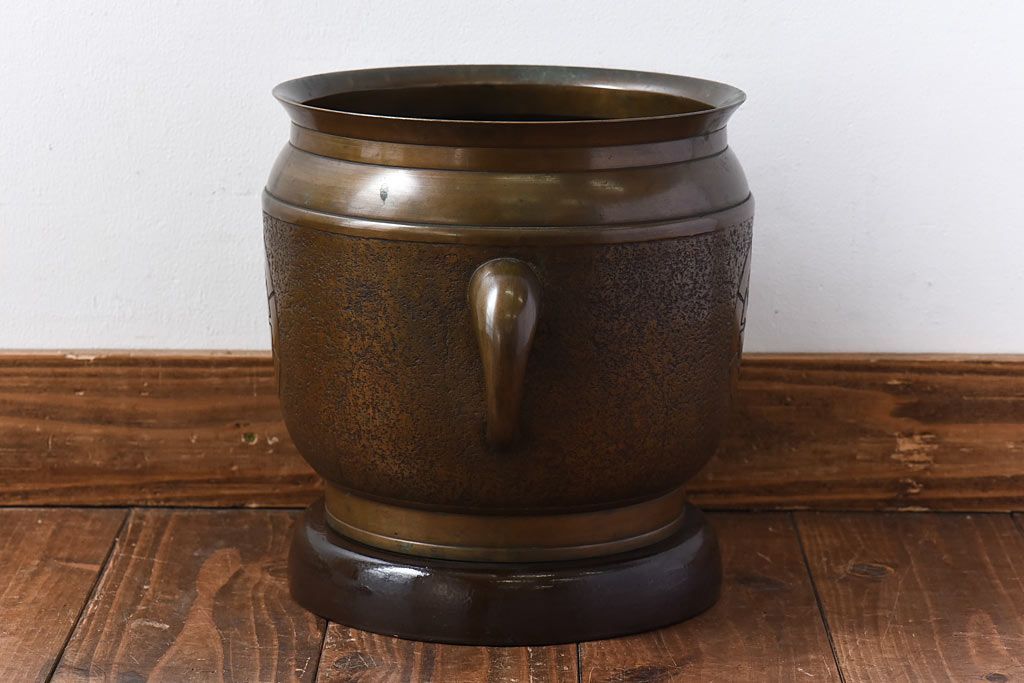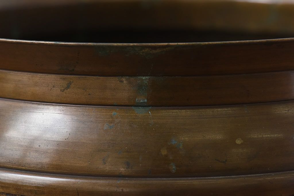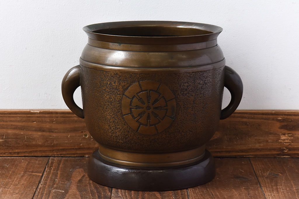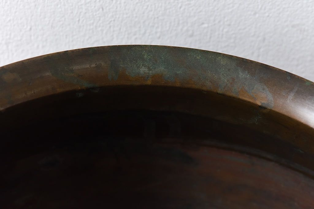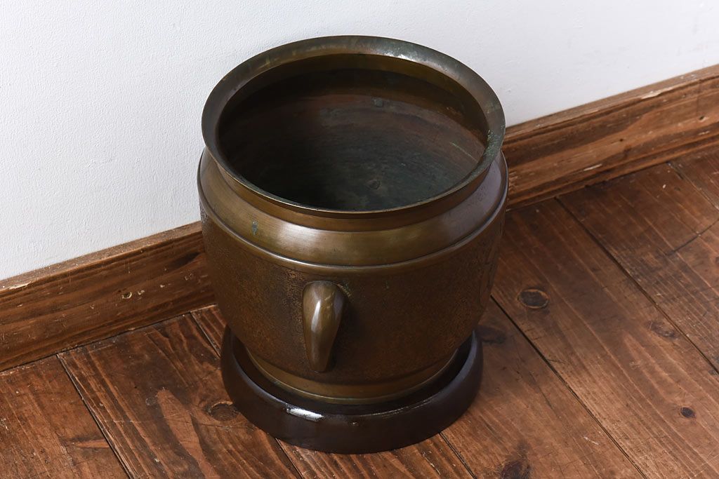 火鉢> 金属火鉢 > アンティーク雑貨 和製アンティーク 上手物 紋入りで風格のある耳付銅火鉢(鉢カバー)(1)