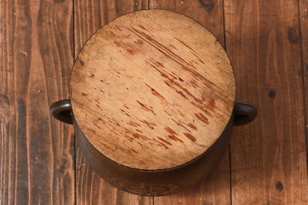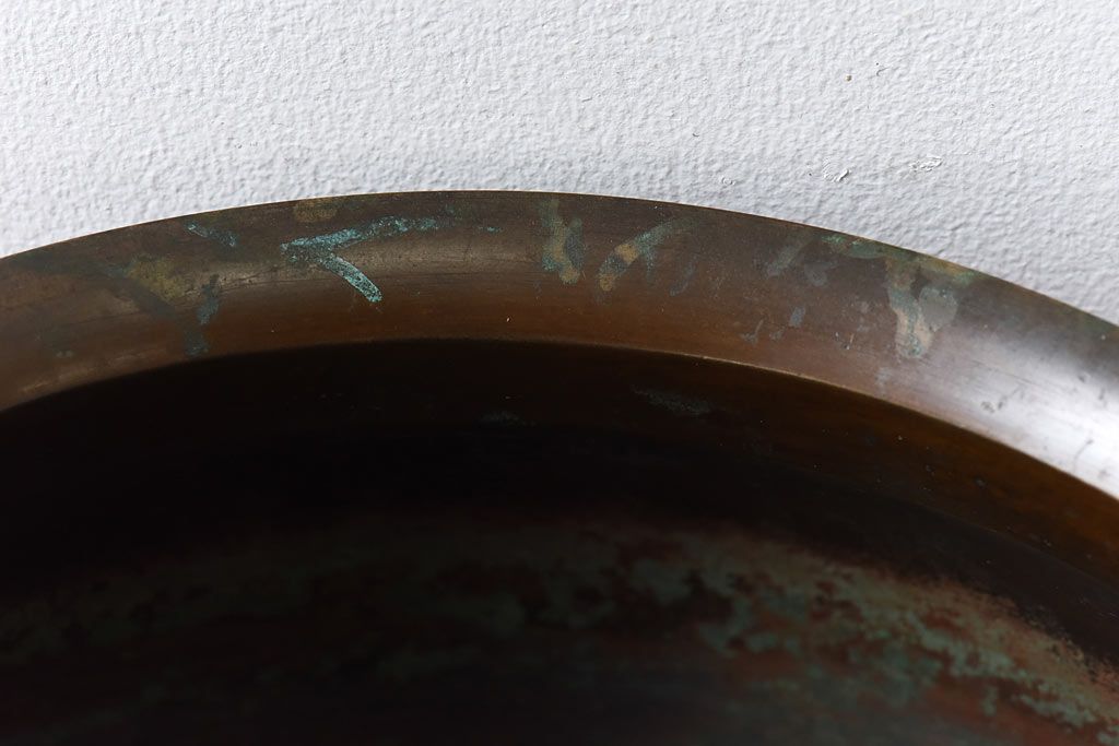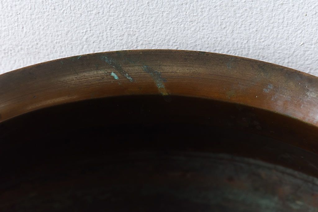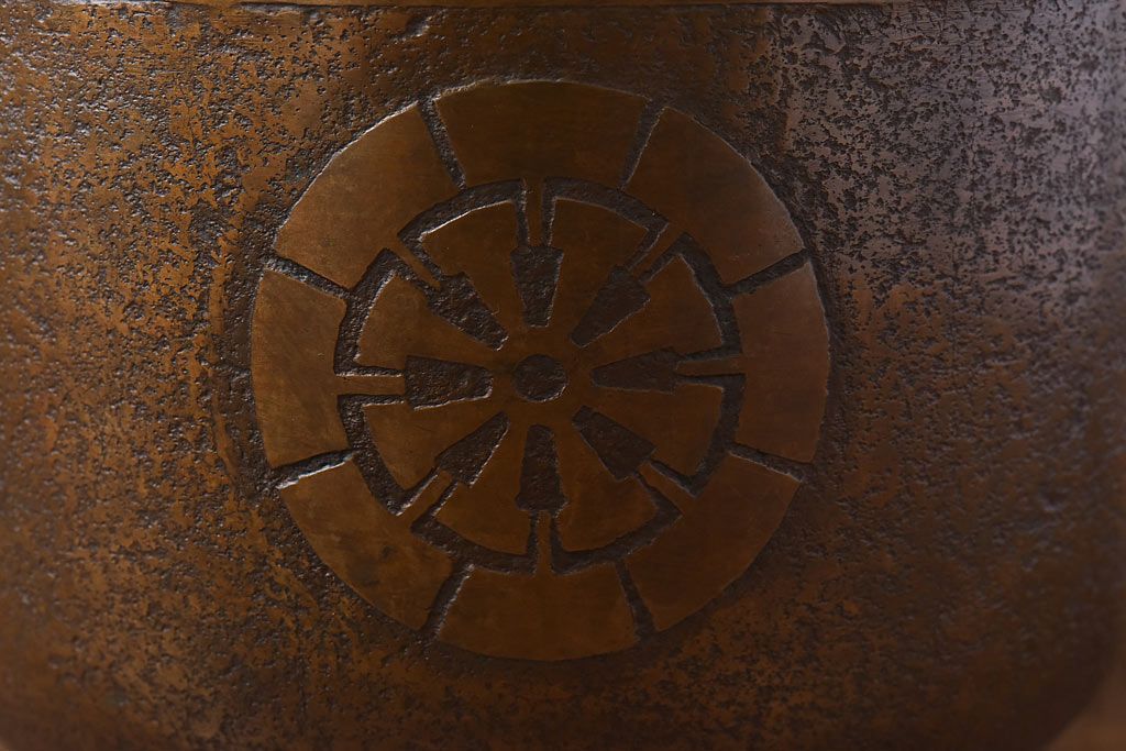 火鉢> 金属火鉢 > アンティーク雑貨 骨董・古民具 明治大正期 上手物 渋い和の趣きがある御所車紋様の耳付銅火鉢(鉢カバー)(1)