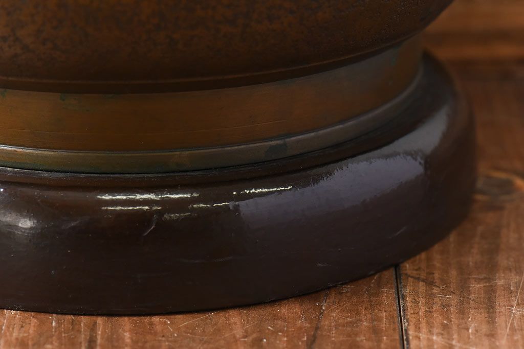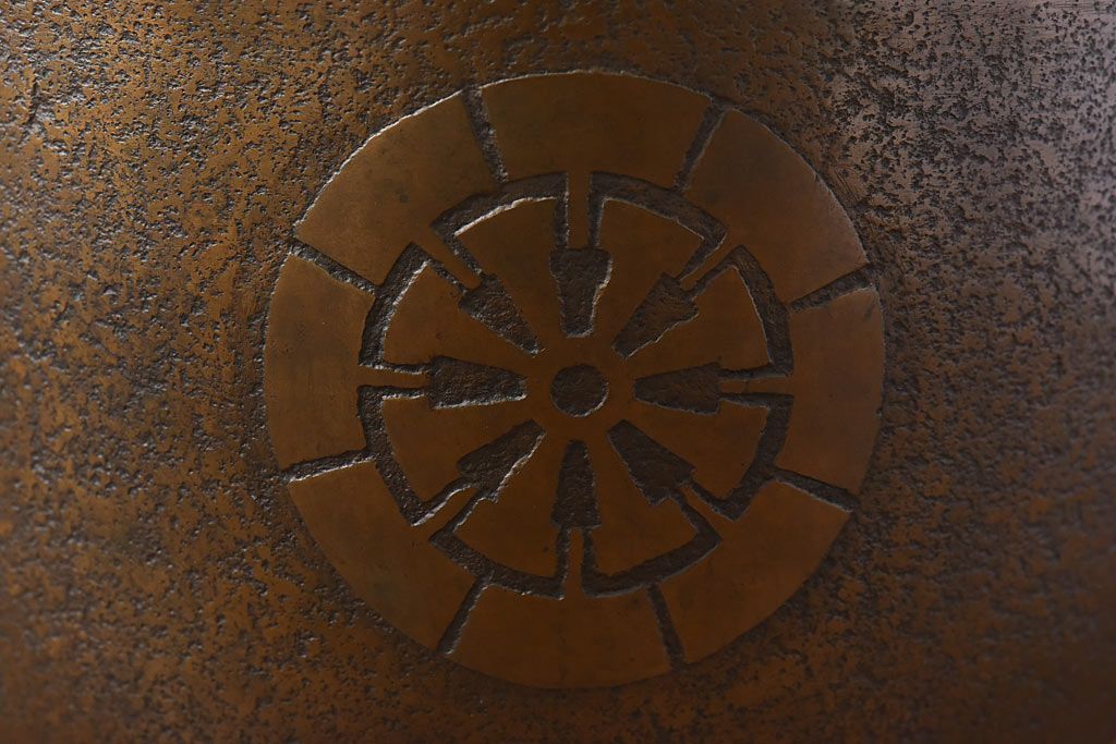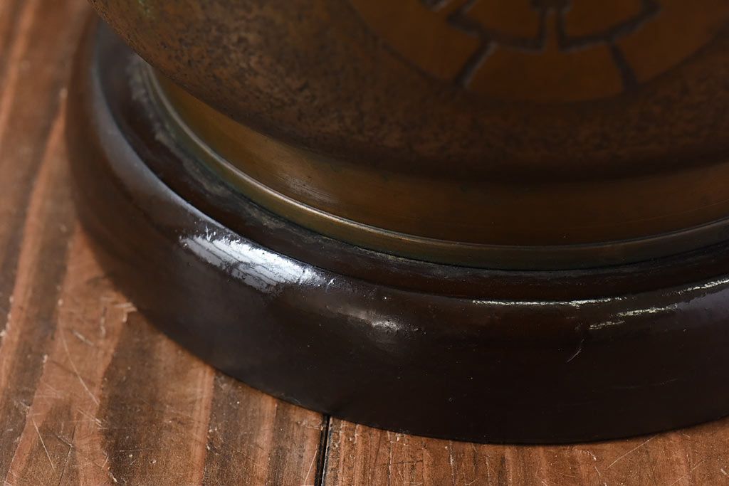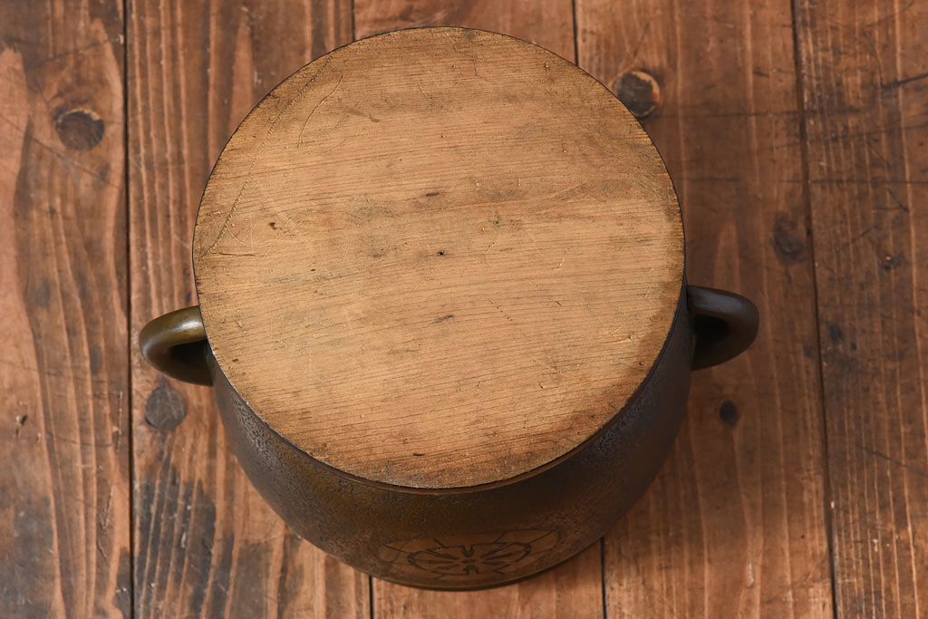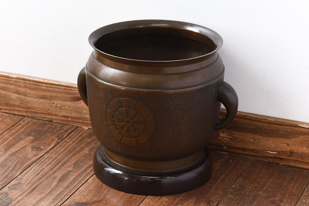 火鉢> 金属火鉢 > アンティーク雑貨 骨董・古民具 明治大正期 上手物 渋い和の趣きがある御所車紋様の耳付銅火鉢(鉢カバー)(2)