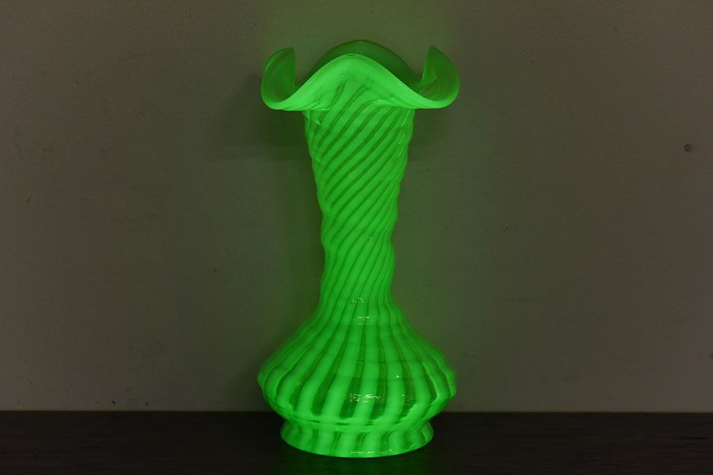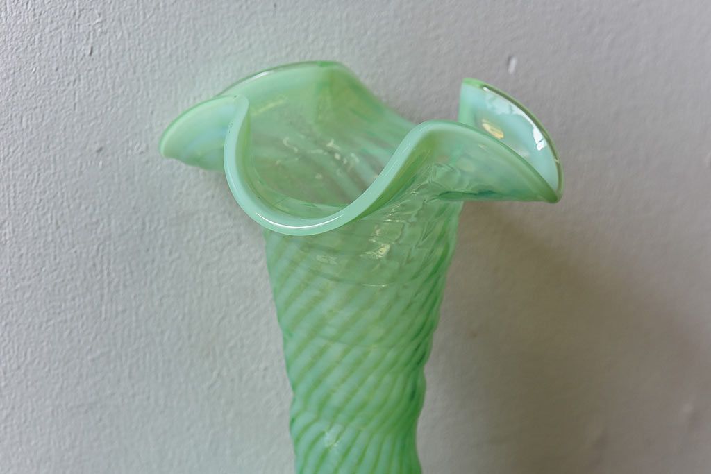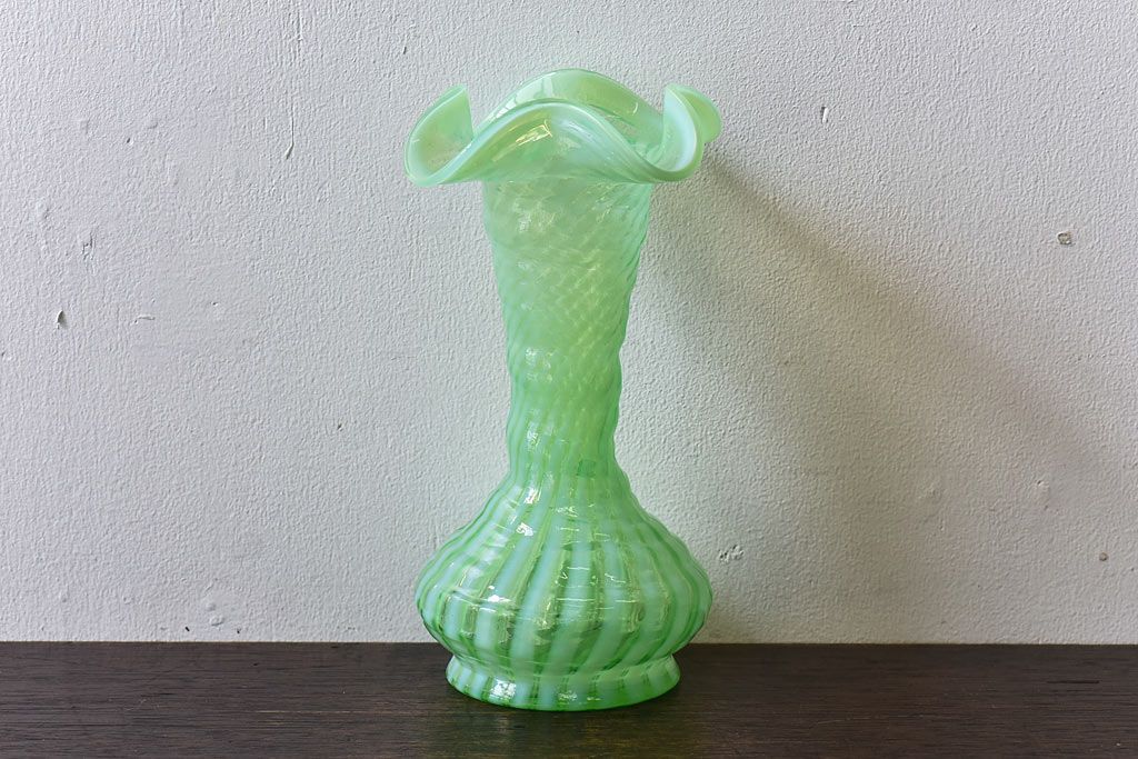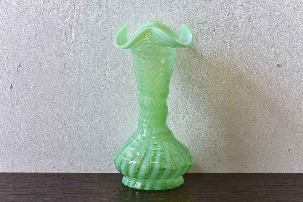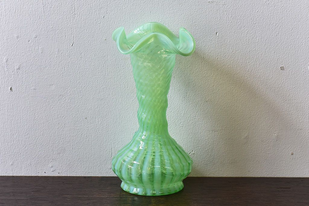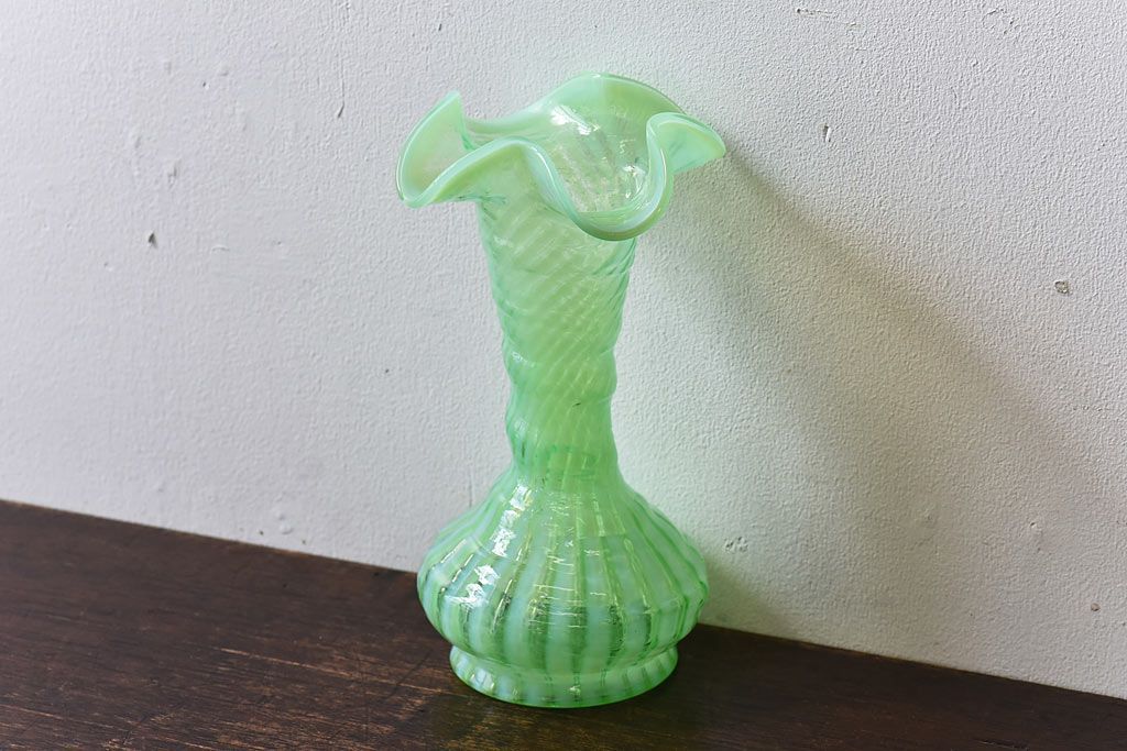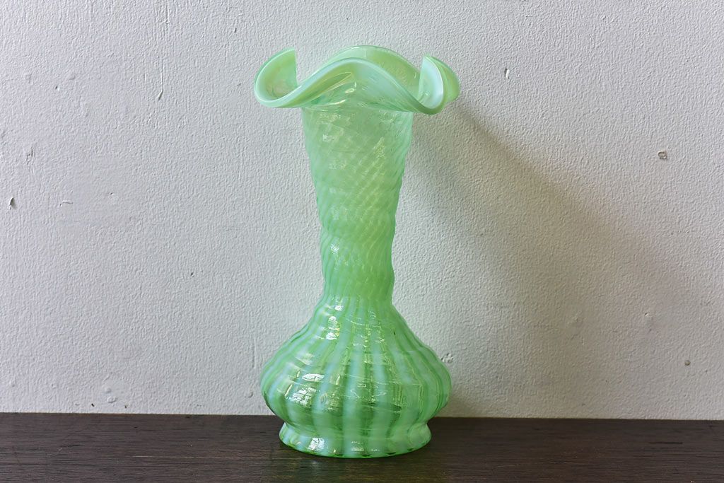アンティーク雑貨 アメリカ製 ワセリンガラス 口元のフリルがおしゃれなフラワーベース(花瓶、ウランガラス)