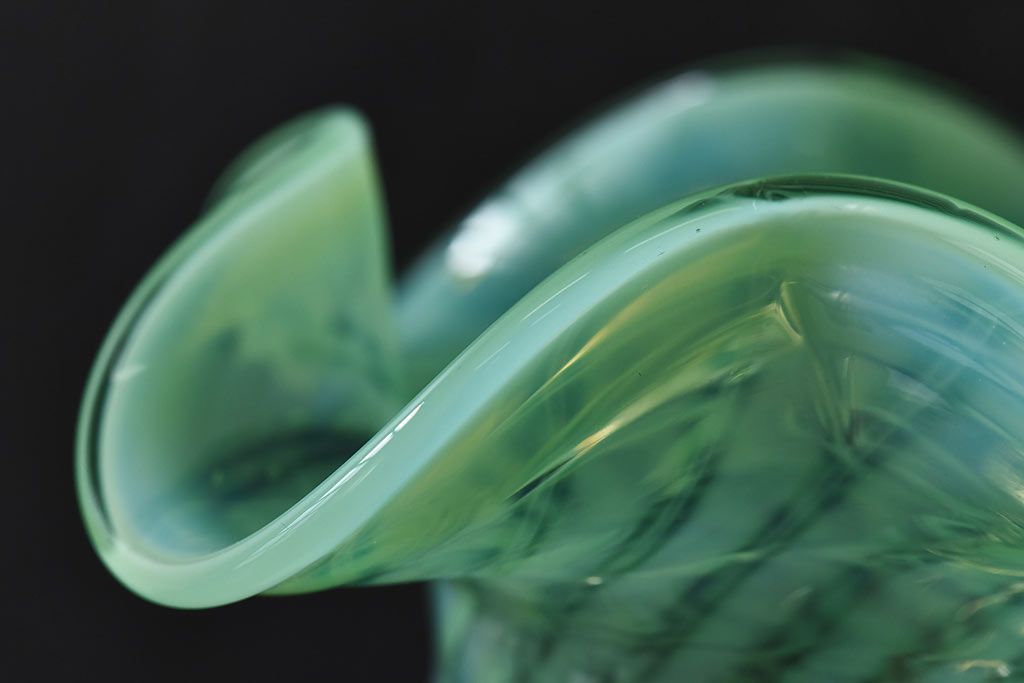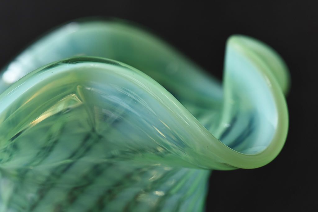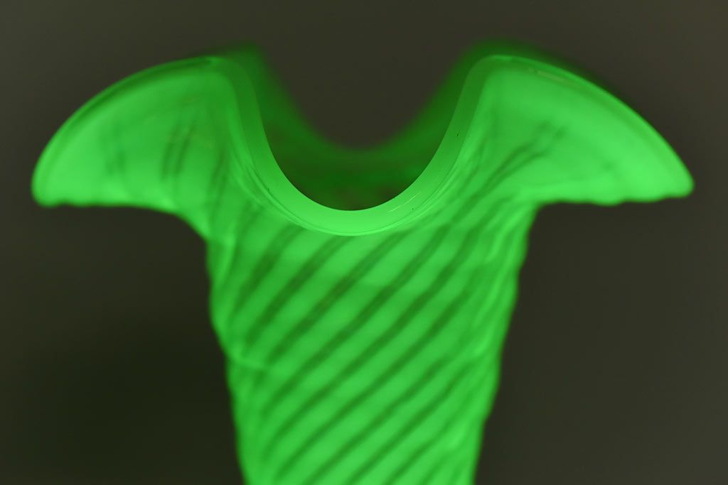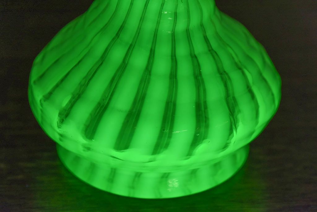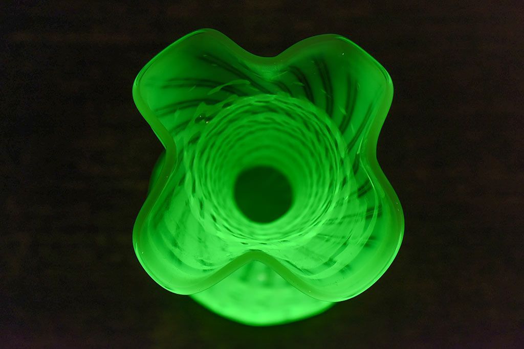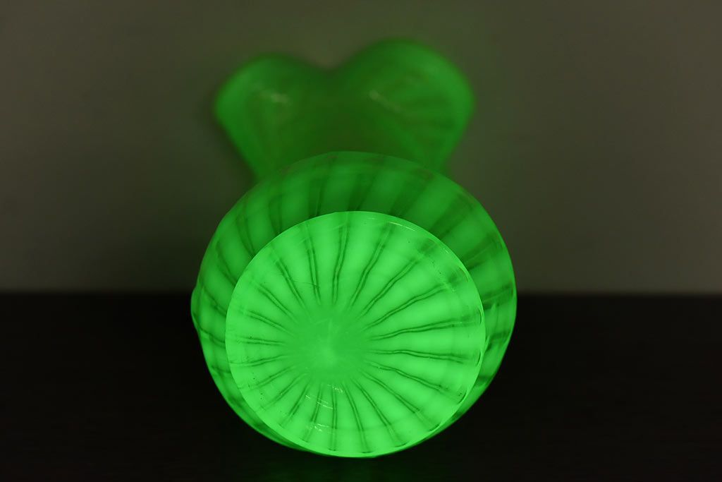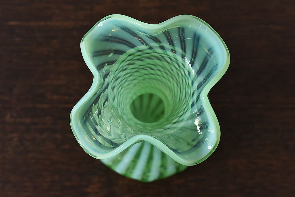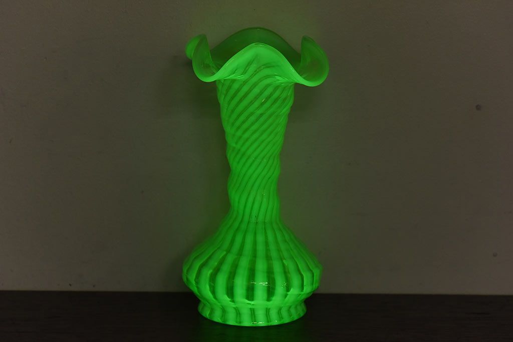 アンティーク雑貨 アメリカ製 ワセリンガラス 口元のフリルがおしゃれなフラワーベース(花瓶、ウランガラス)